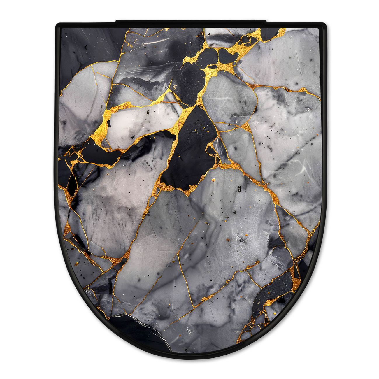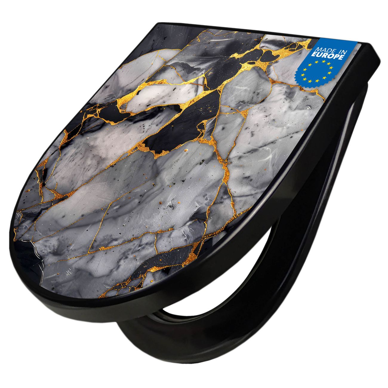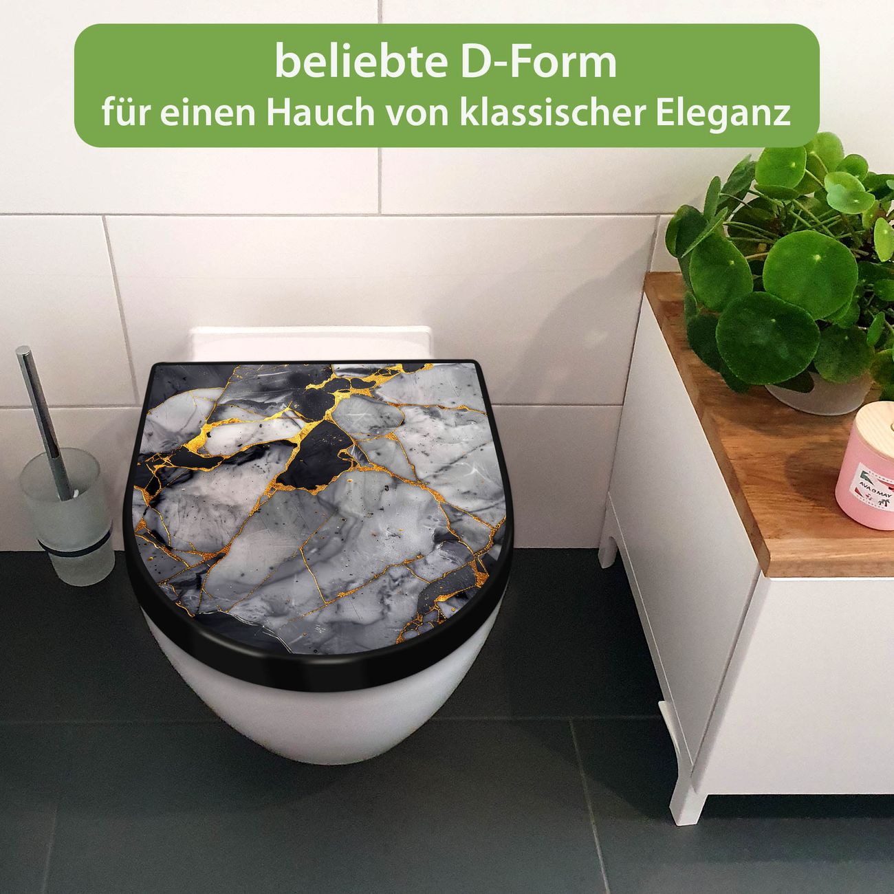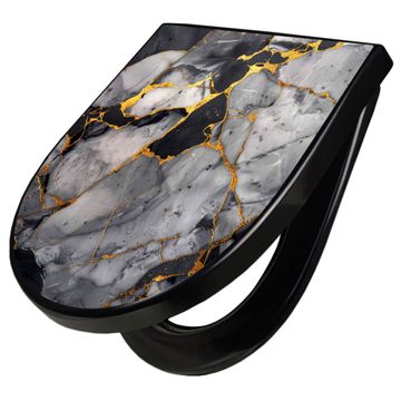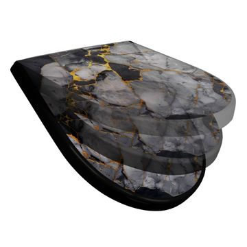 WC Sitz D-Form Schwarz mit Absenkautomatik Motiv Schwarzer Marmor mit Gold 2