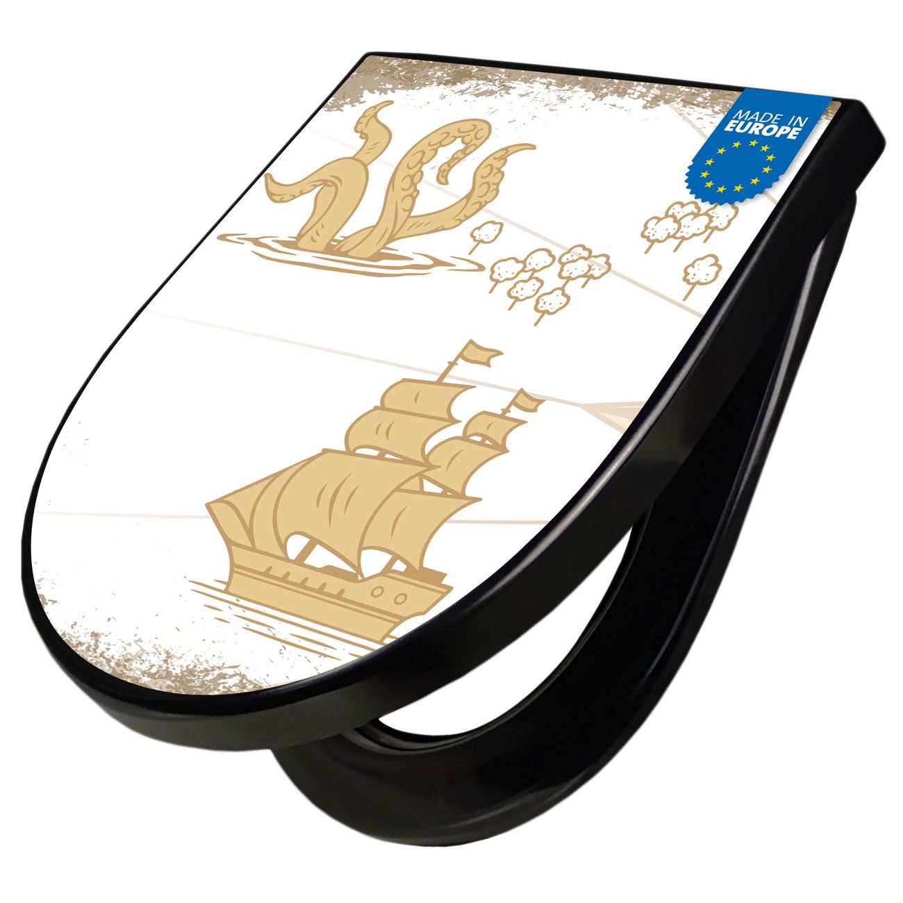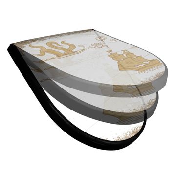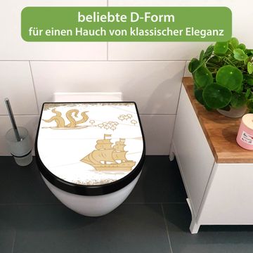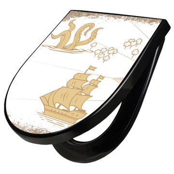 WC Sitz D-Form Schwarz mit Absenkautomatik Motiv Seemonster und Segelschiff