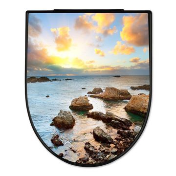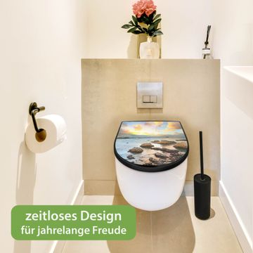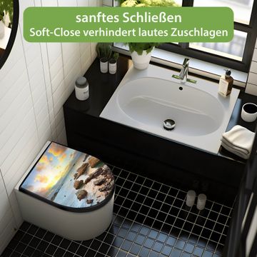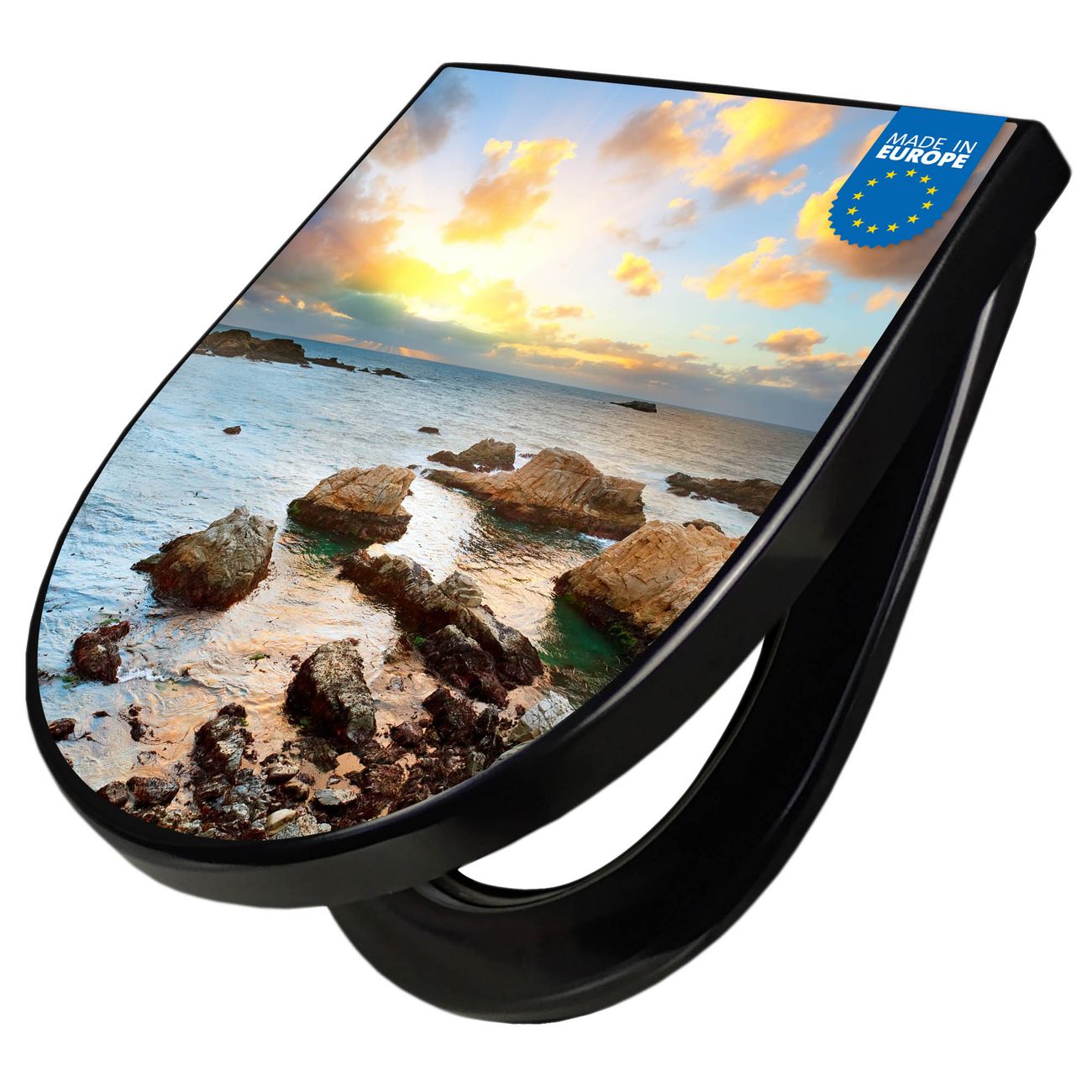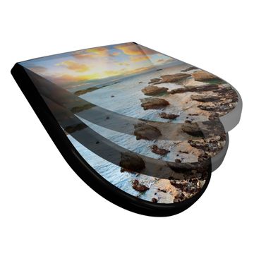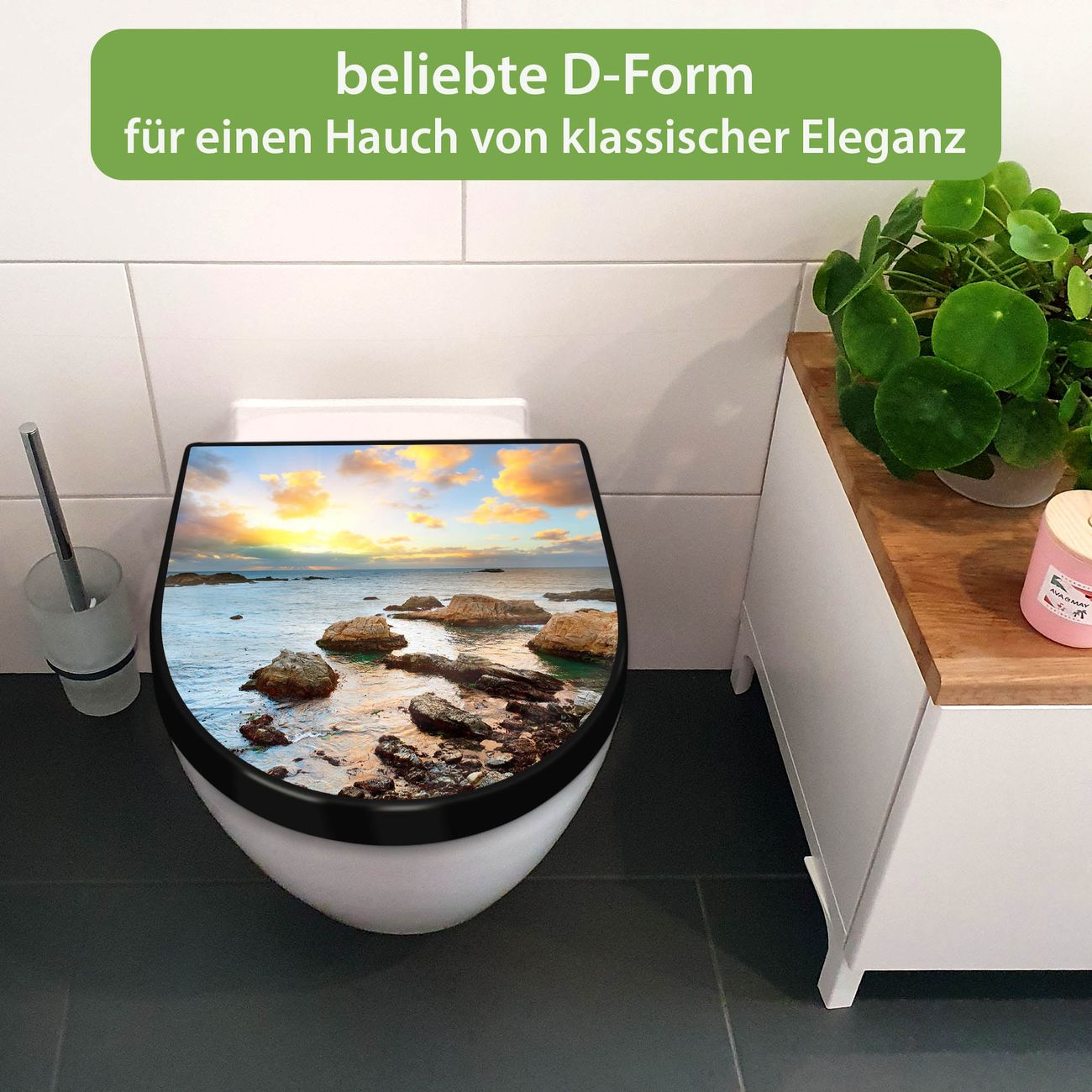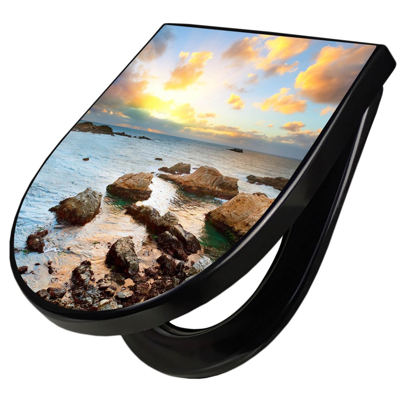 WC Sitz D-Form Schwarz mit Absenkautomatik Motiv Sonnenaufgang am Meer