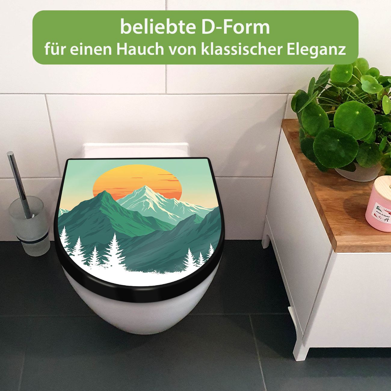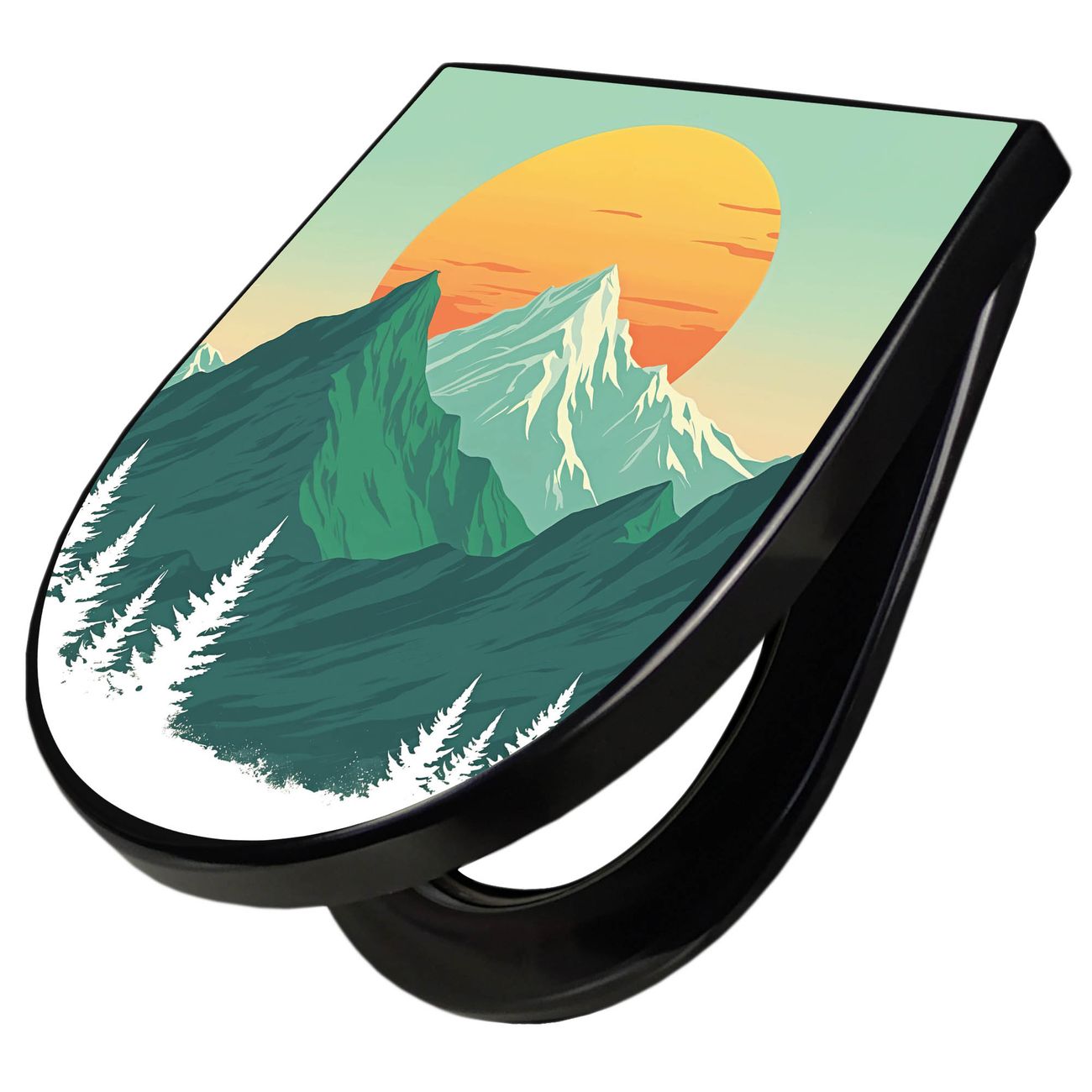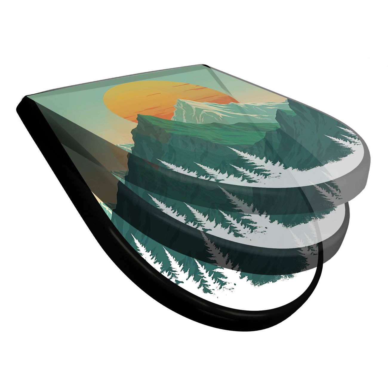 WC Sitz D-Form Schwarz mit Absenkautomatik Motiv Sonnenaufgang über den Bergen