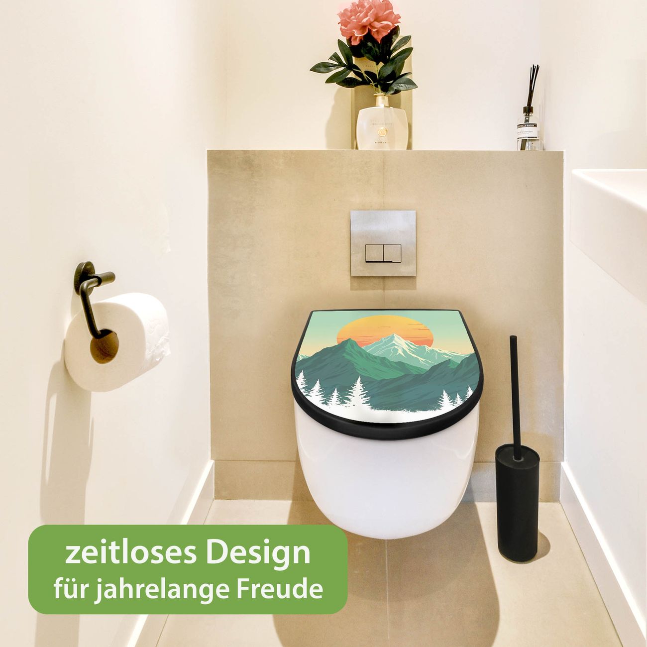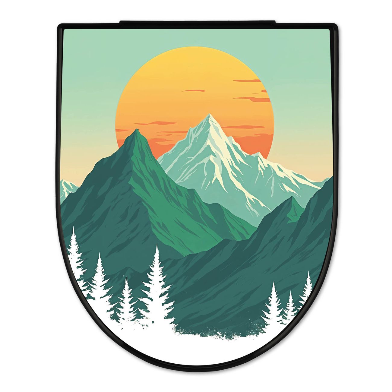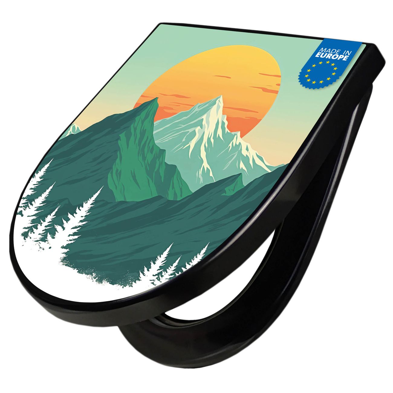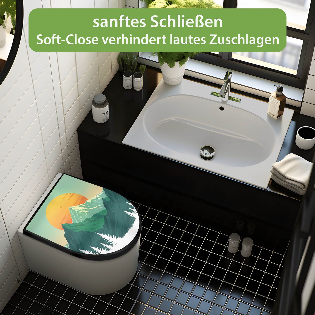 WC Sitz D-Form Schwarz mit Absenkautomatik Motiv Sonnenaufgang über den Bergen