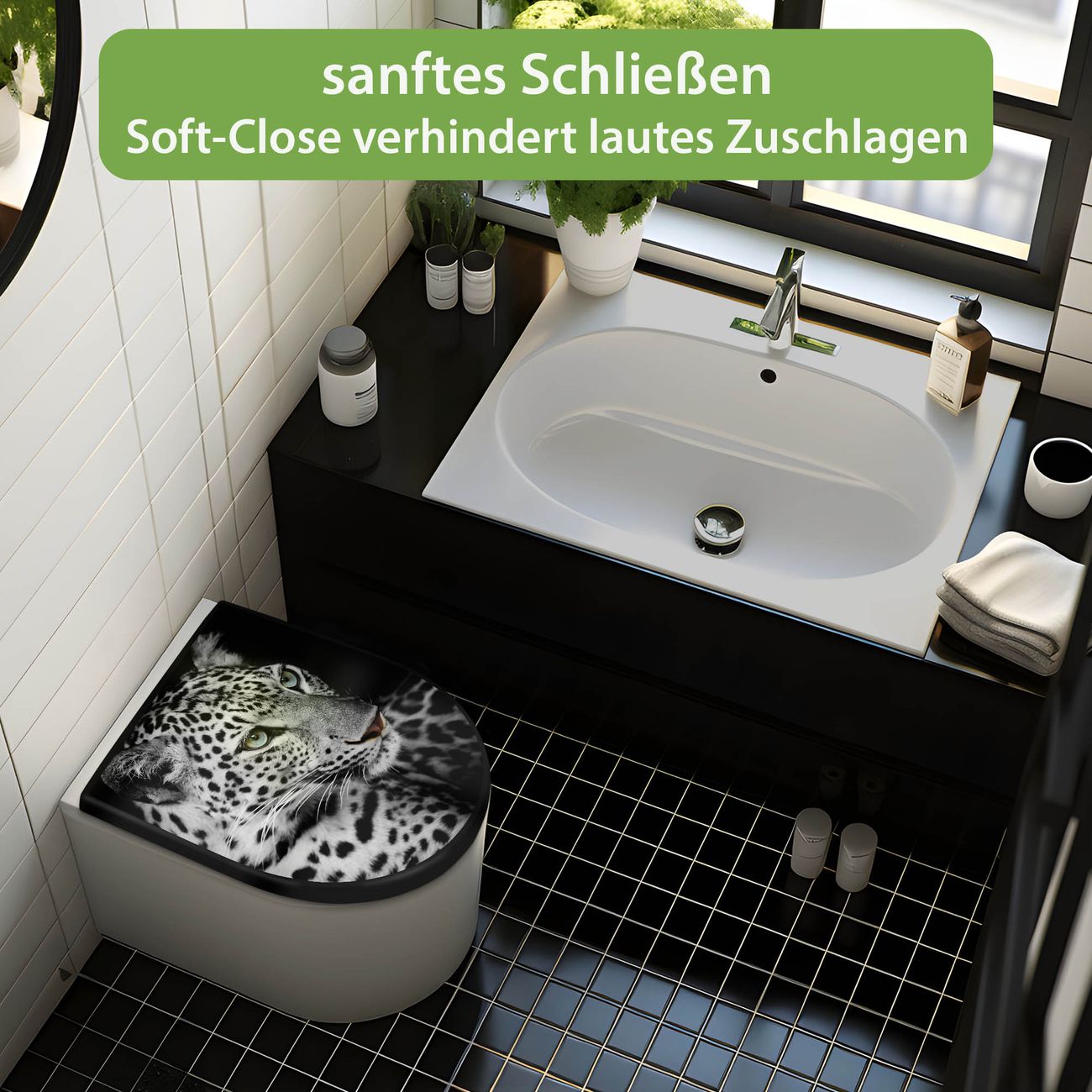 WC Sitz D-Form Schwarz mit Absenkautomatik Motiv Sophie