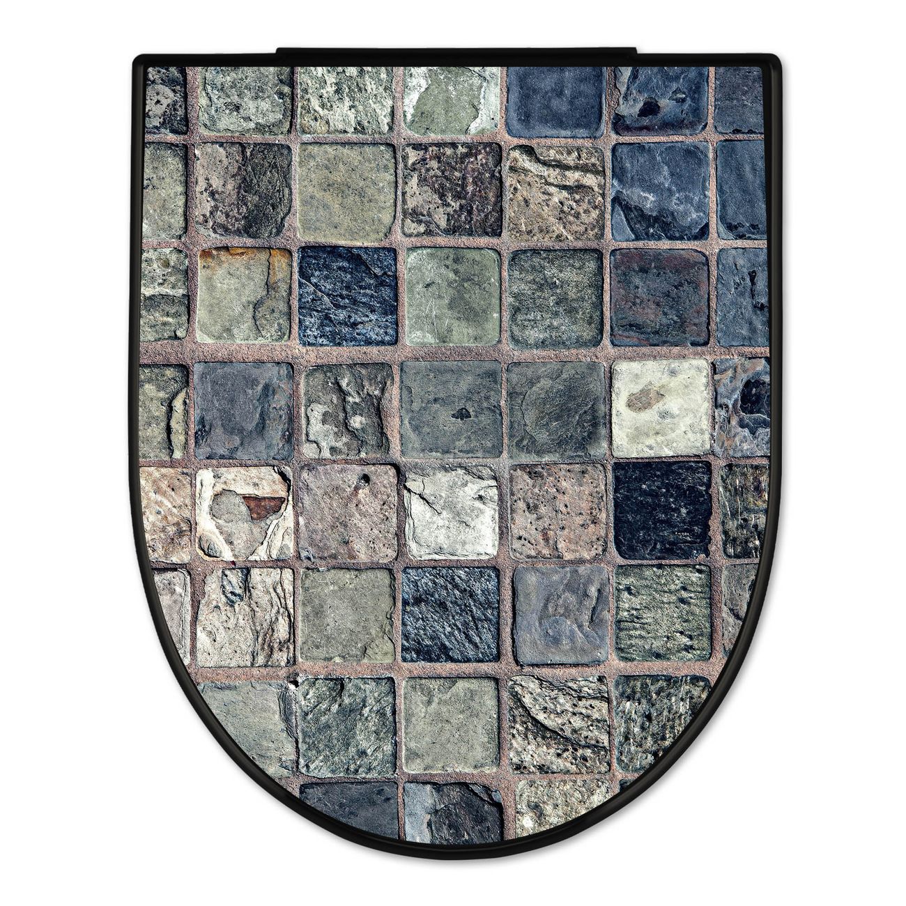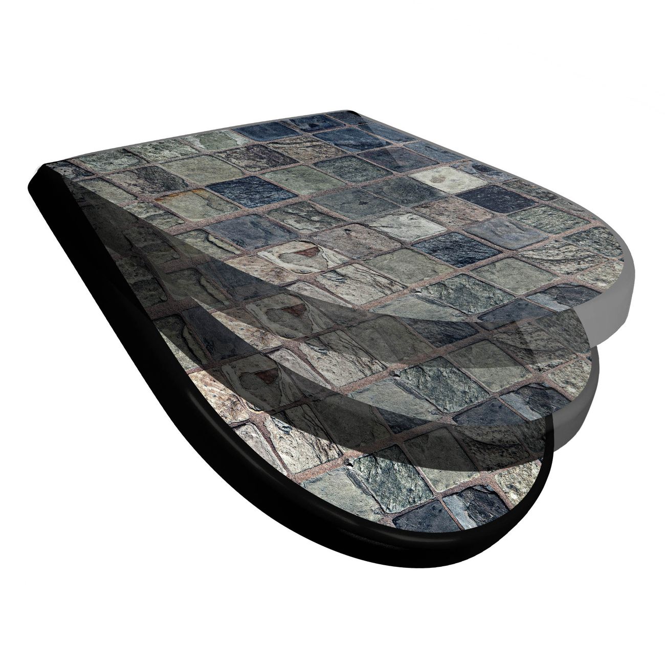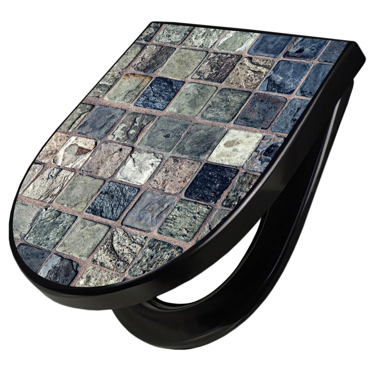 WC Sitz D-Form Schwarz mit Absenkautomatik Motiv Steinfliesen