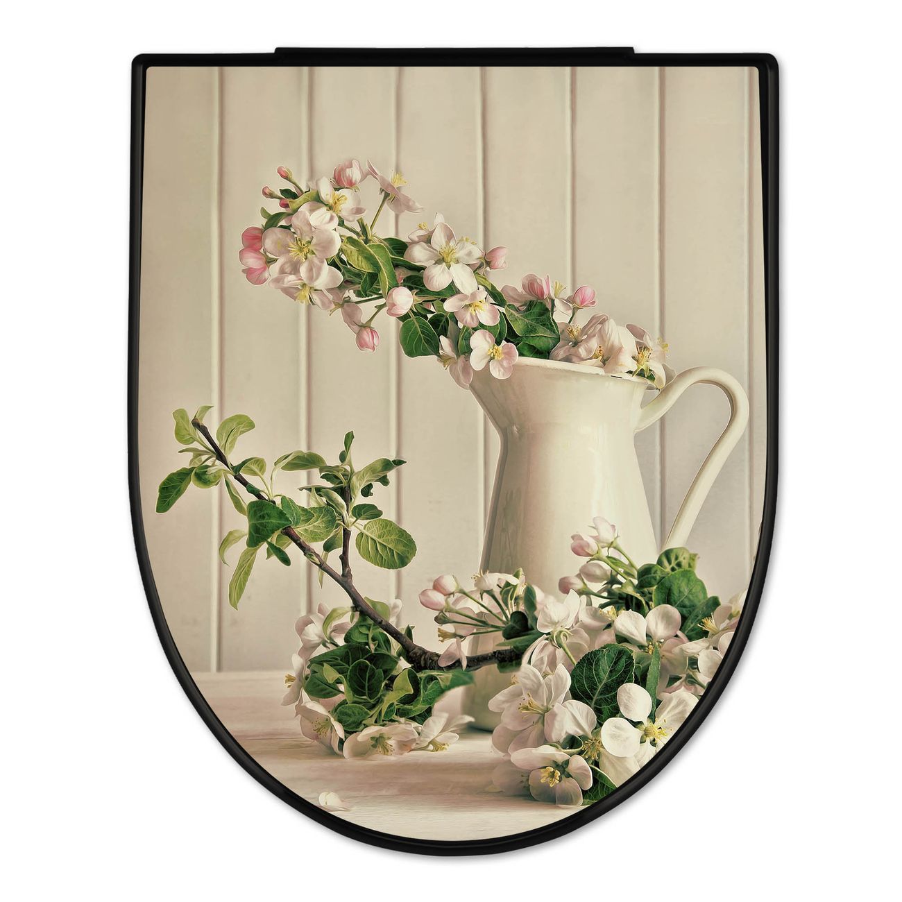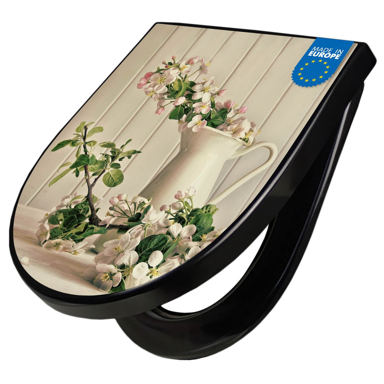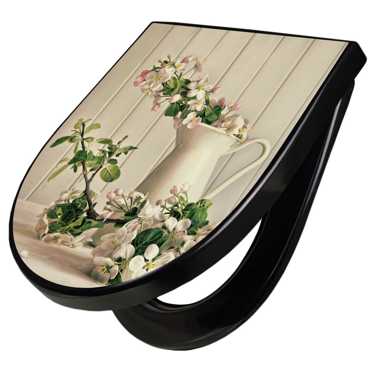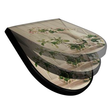 WC Sitz D-Form Schwarz mit Absenkautomatik Motiv Stillleben Kirschblüten