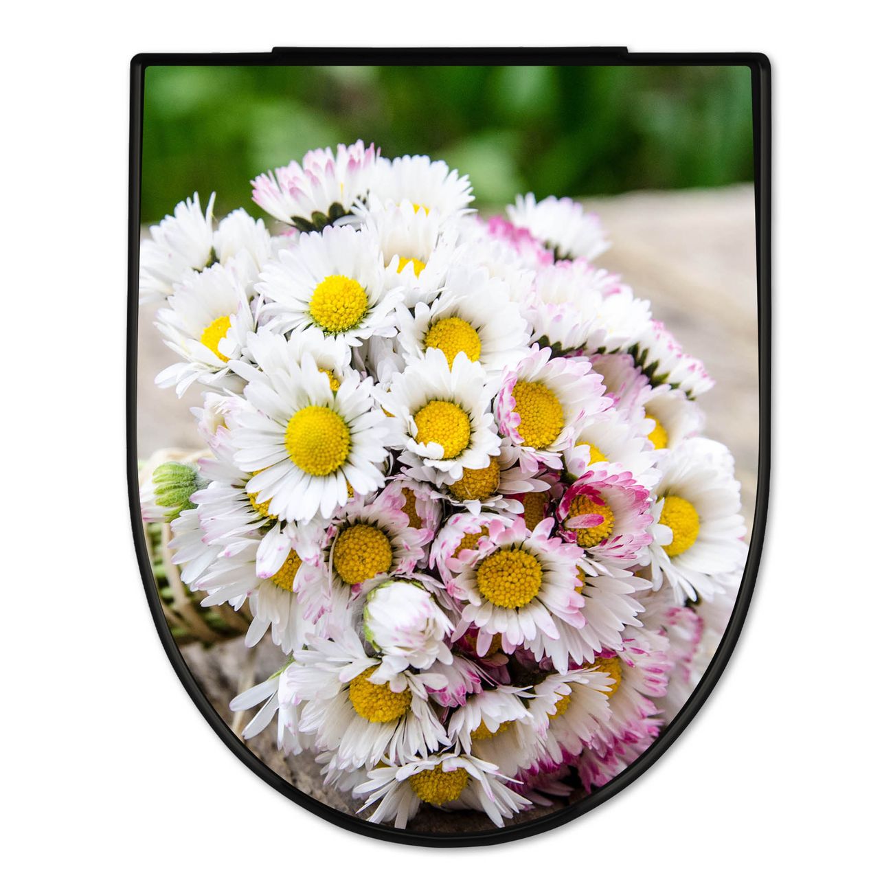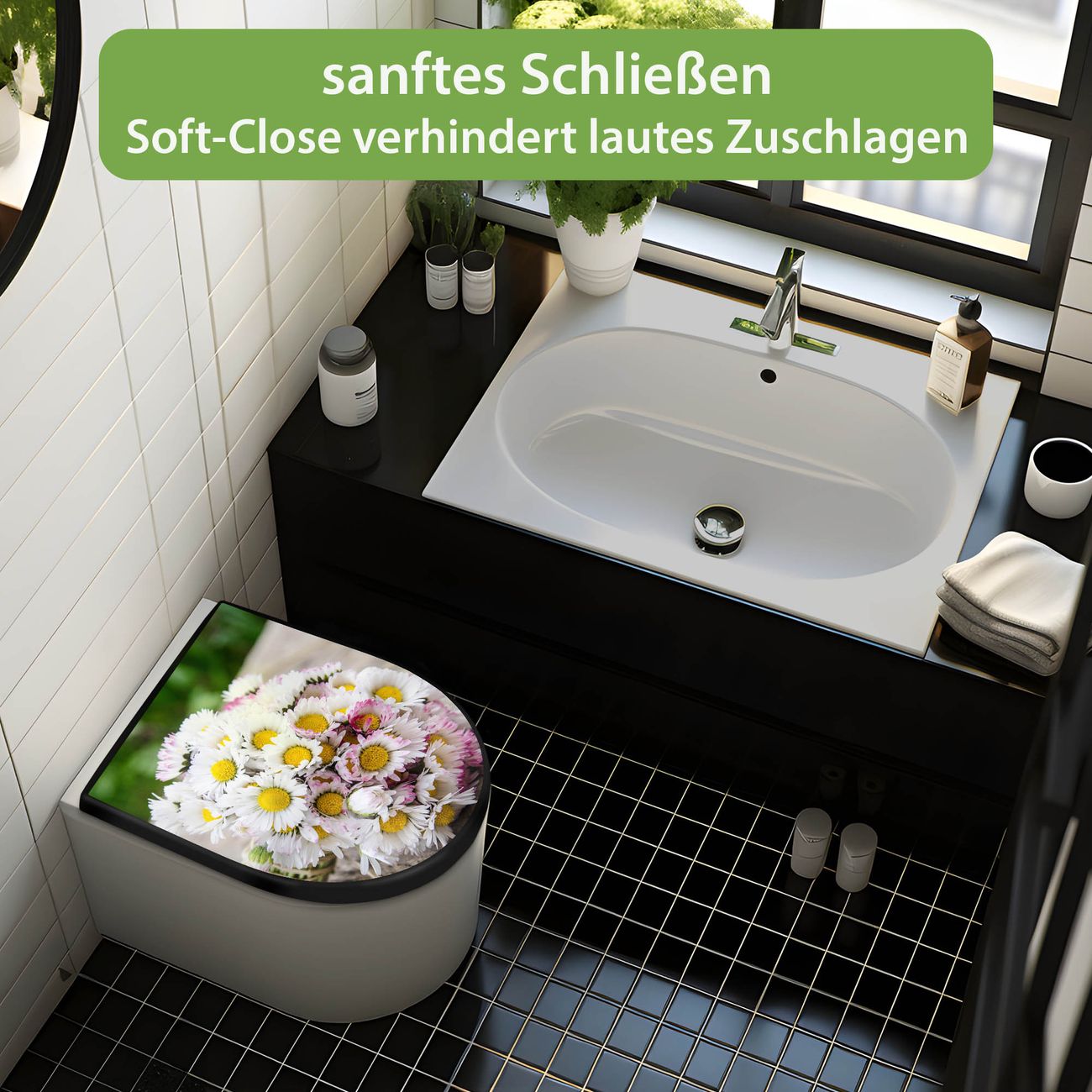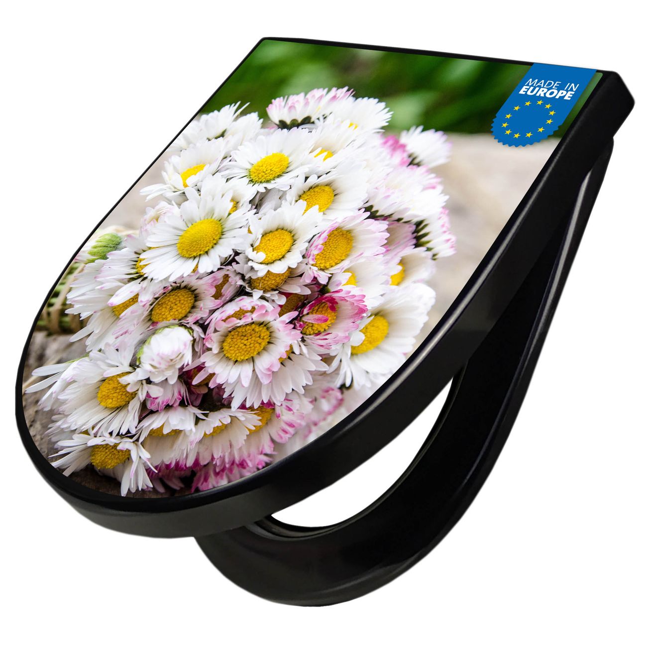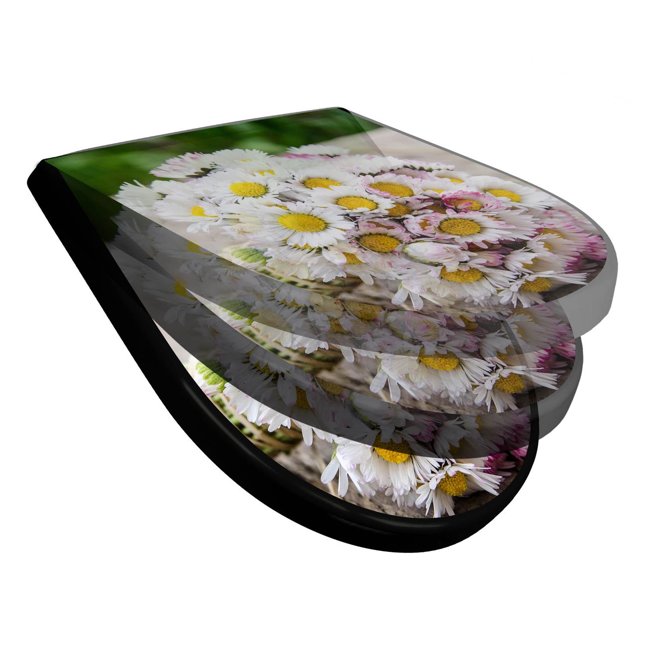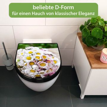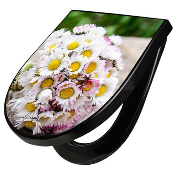 WC Sitz D-Form Schwarz mit Absenkautomatik Motiv Strauß Gänseblümchen