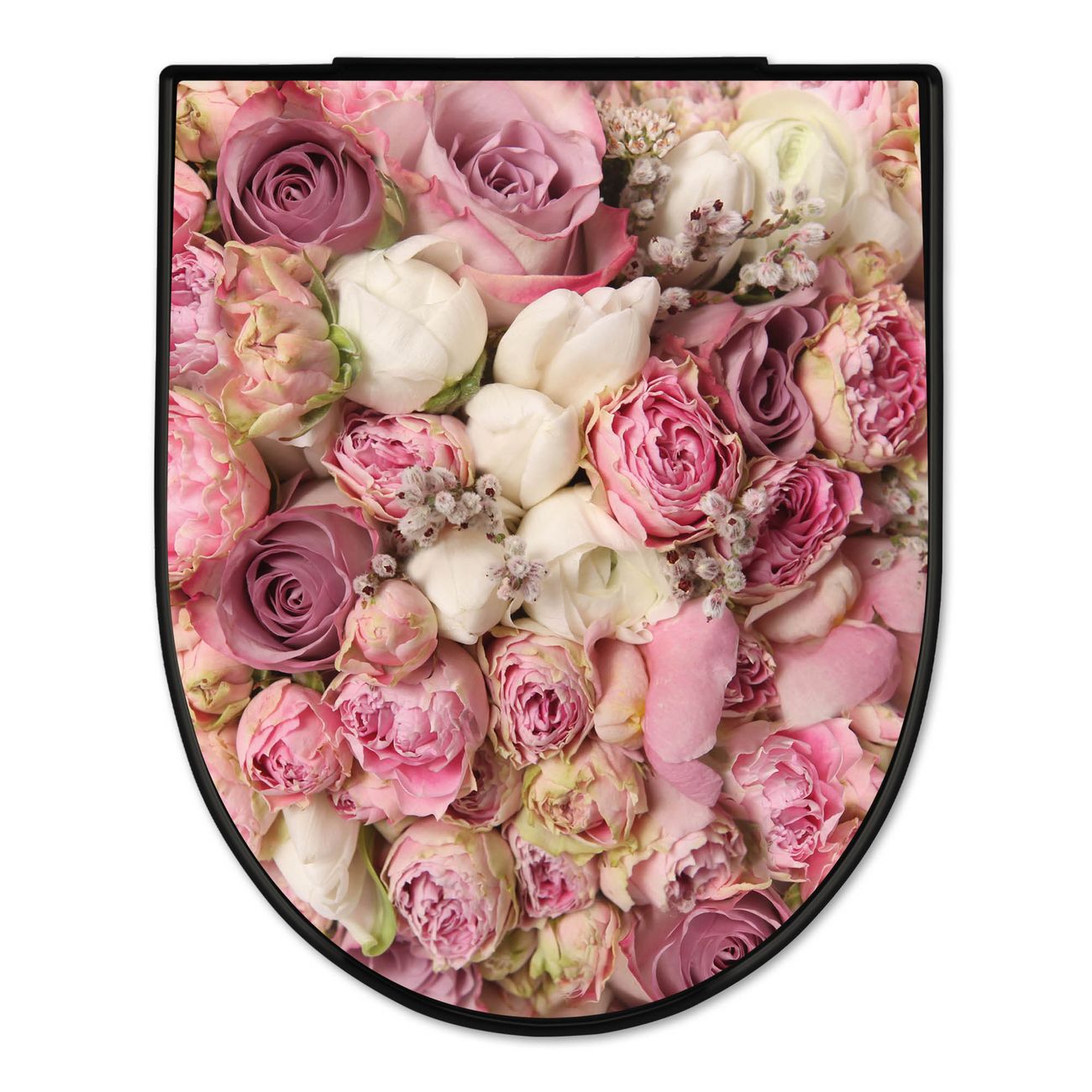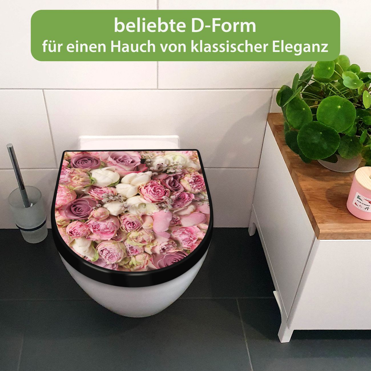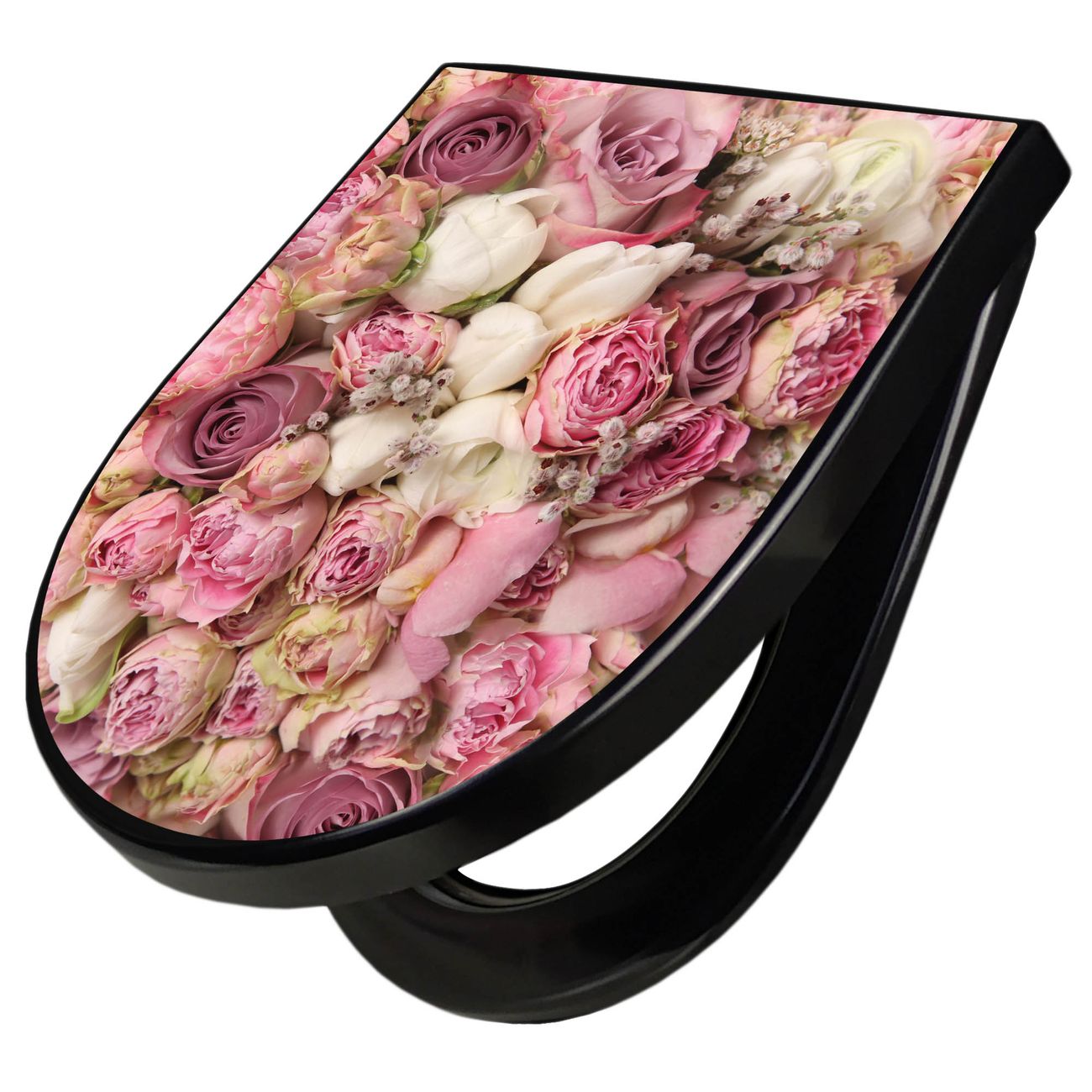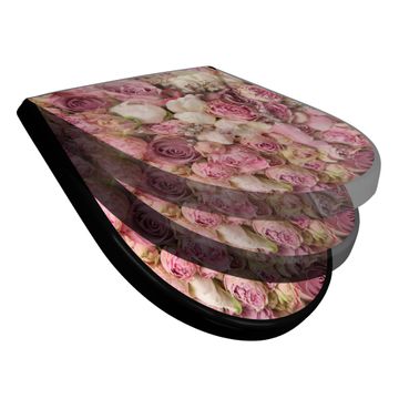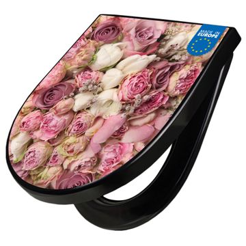 WC Sitz D-Form Schwarz mit Absenkautomatik Motiv Strauss Rosen