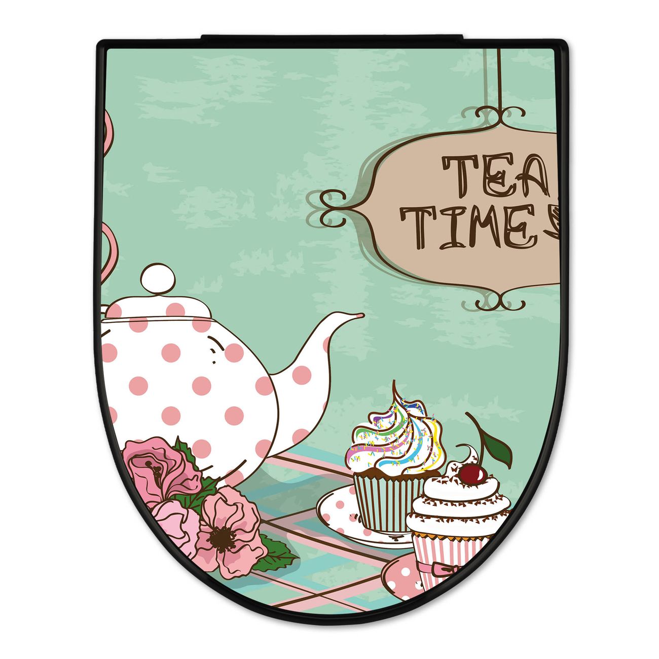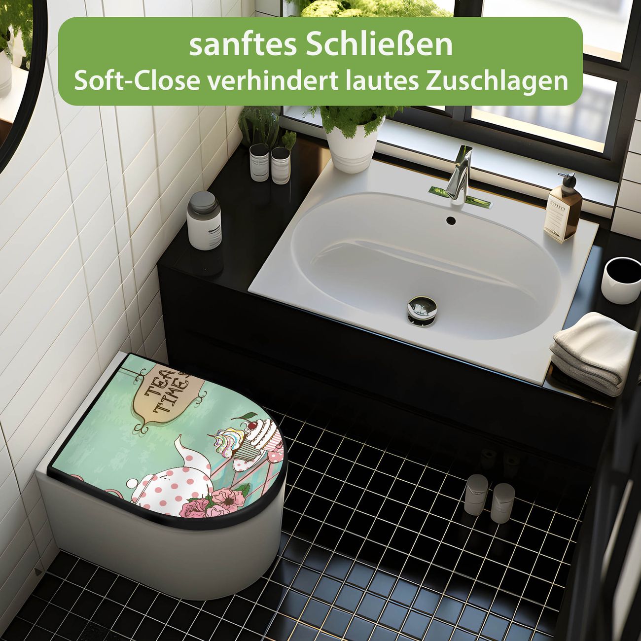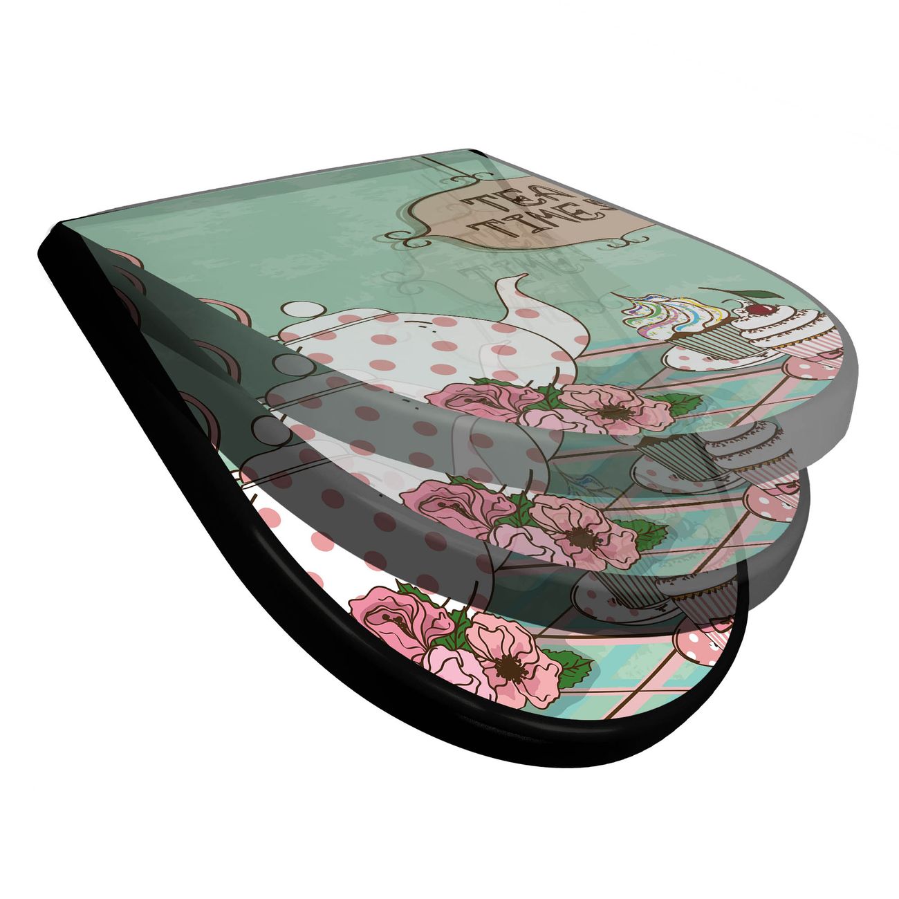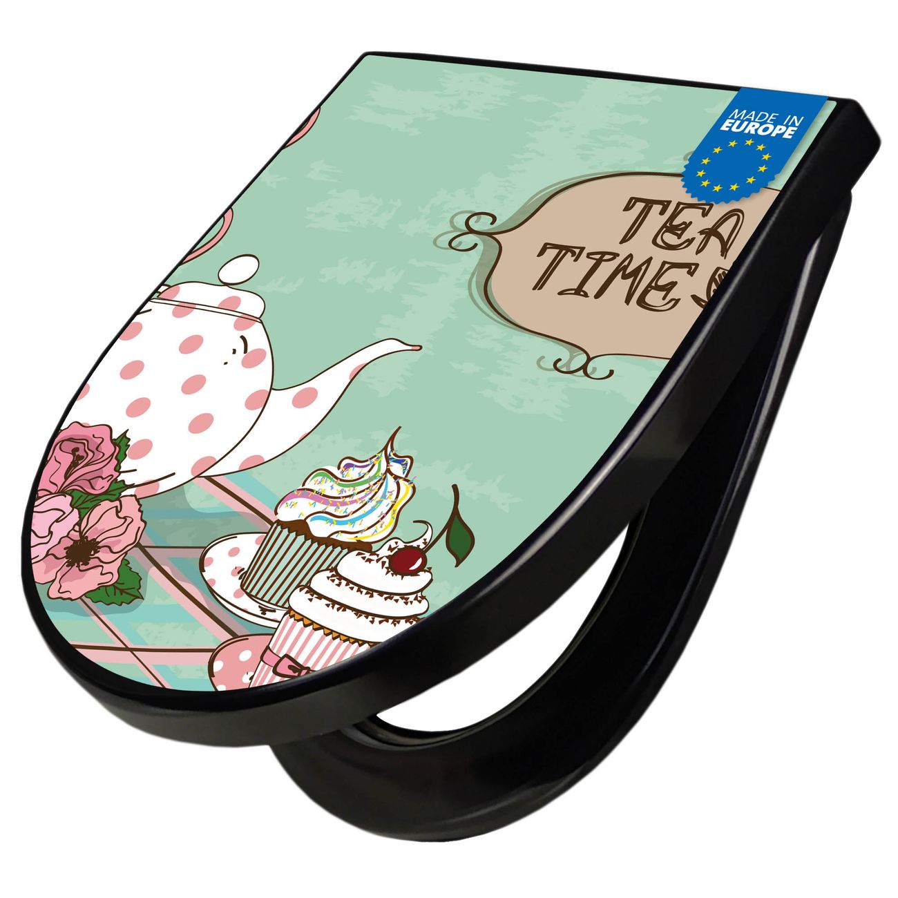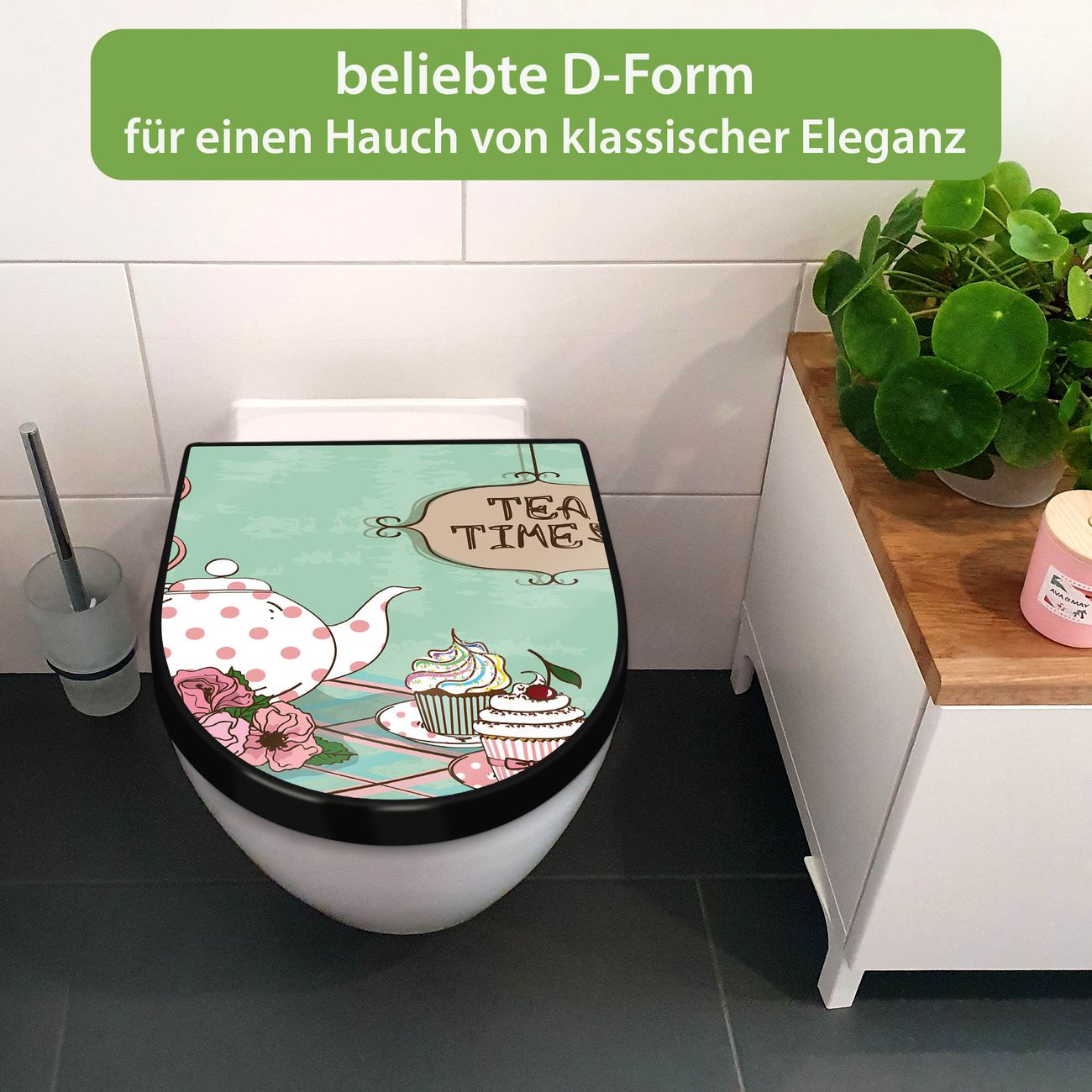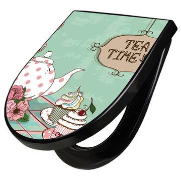 WC Sitz D-Form Schwarz mit Absenkautomatik Motiv Tea Time