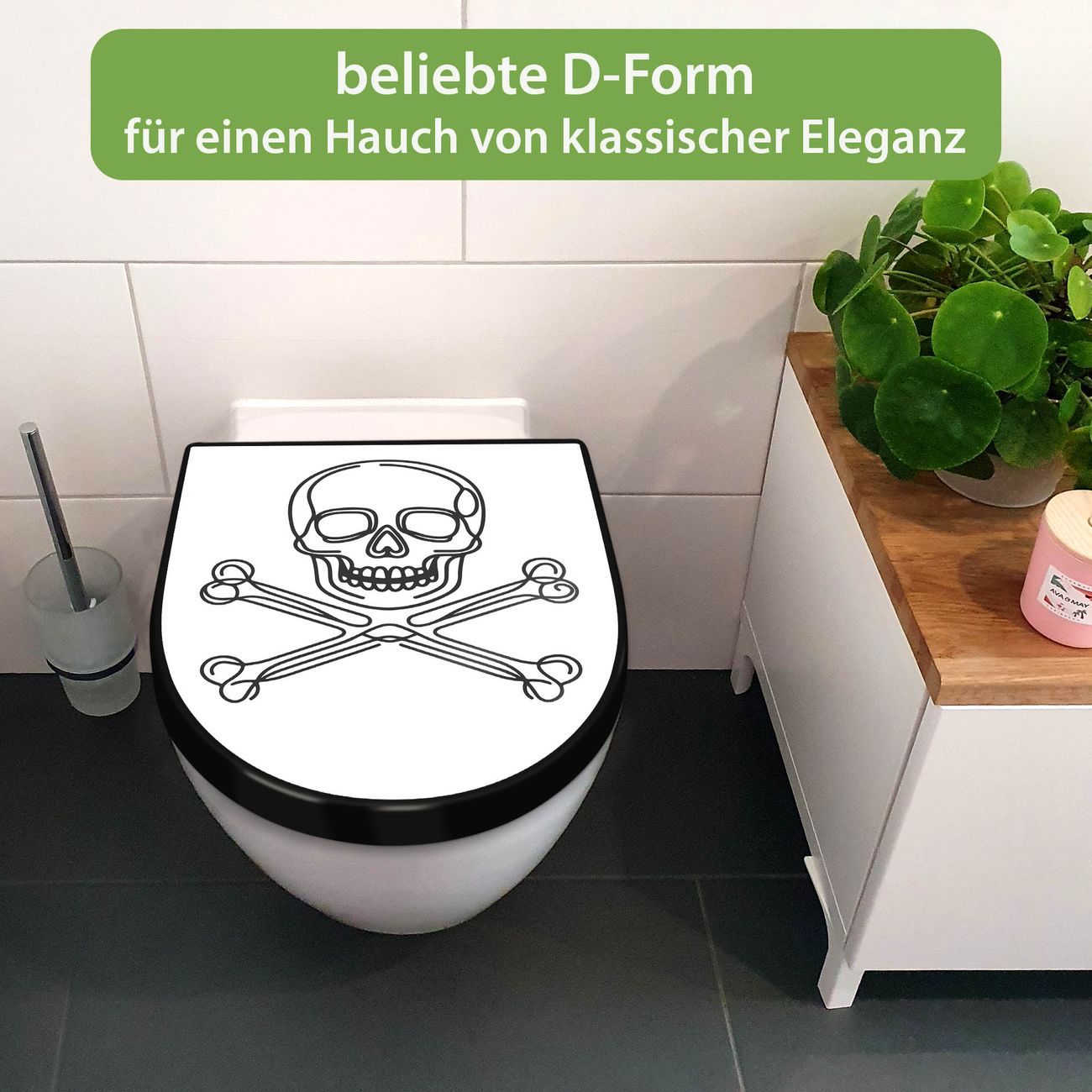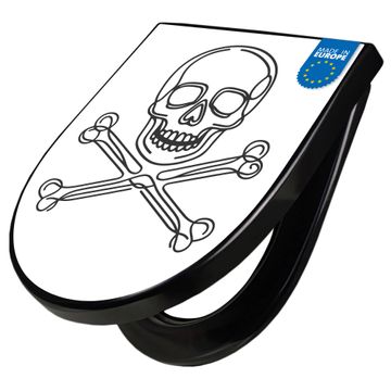 WC Sitz D-Form Schwarz mit Absenkautomatik Motiv Totenkopf und Knochen