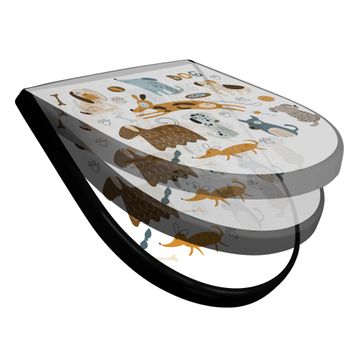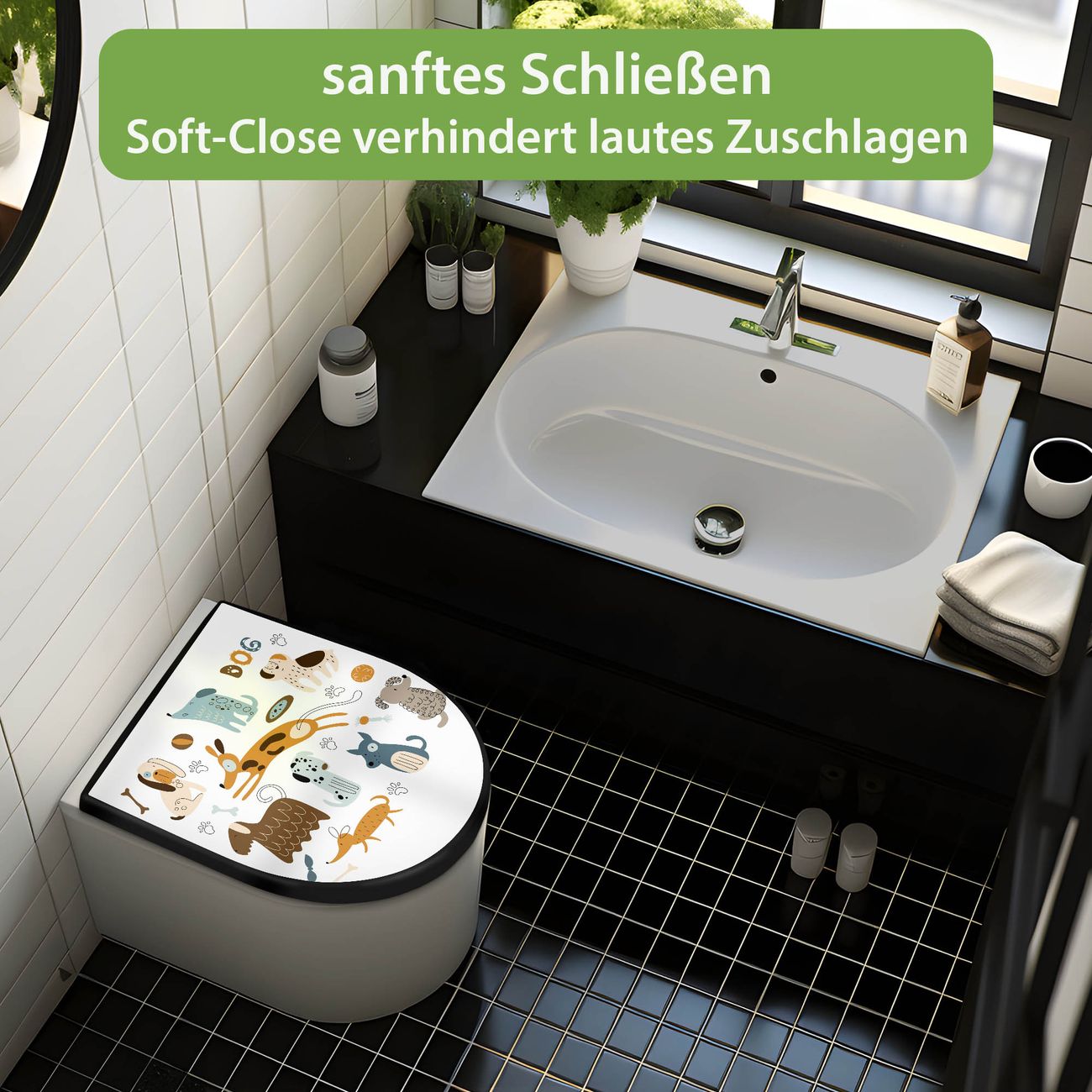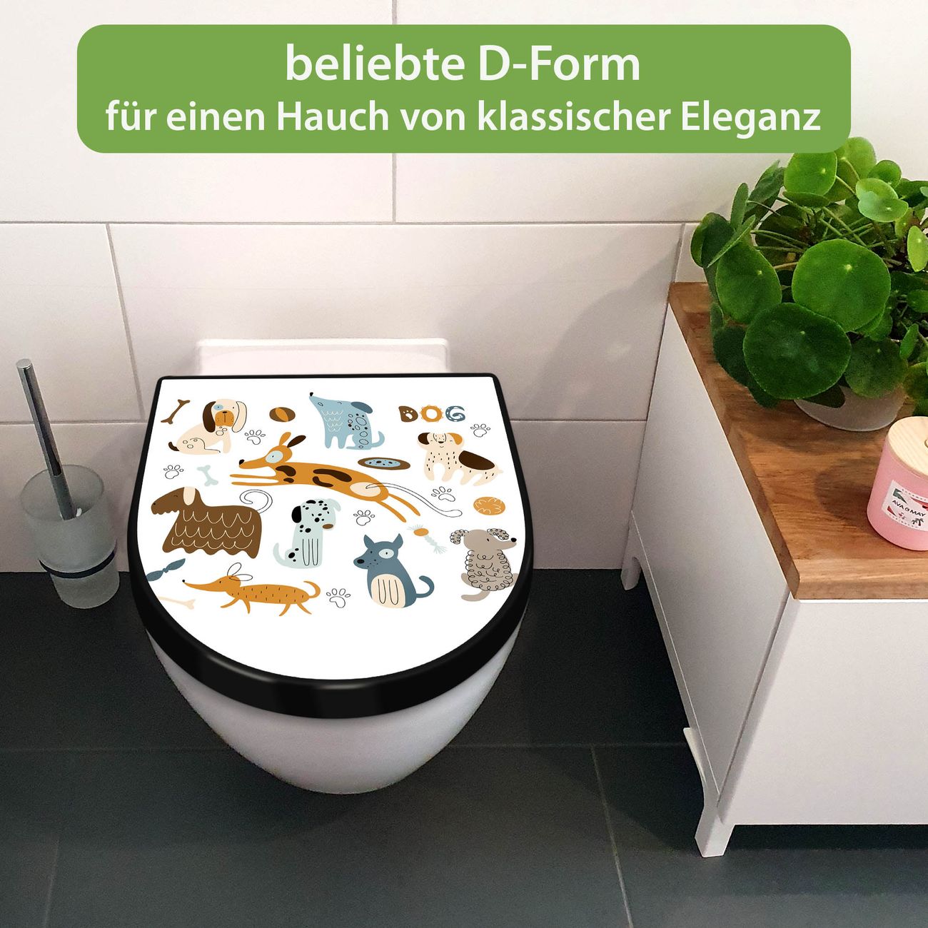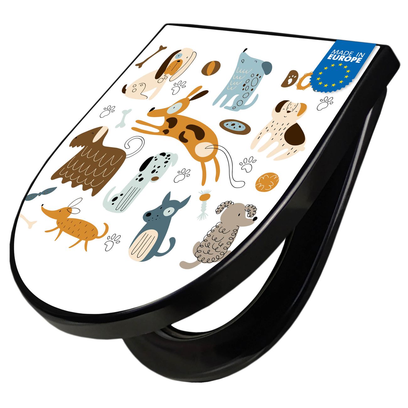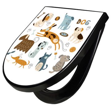 WC Sitz D-Form Schwarz mit Absenkautomatik Motiv Verspielte Hunde-Illustration