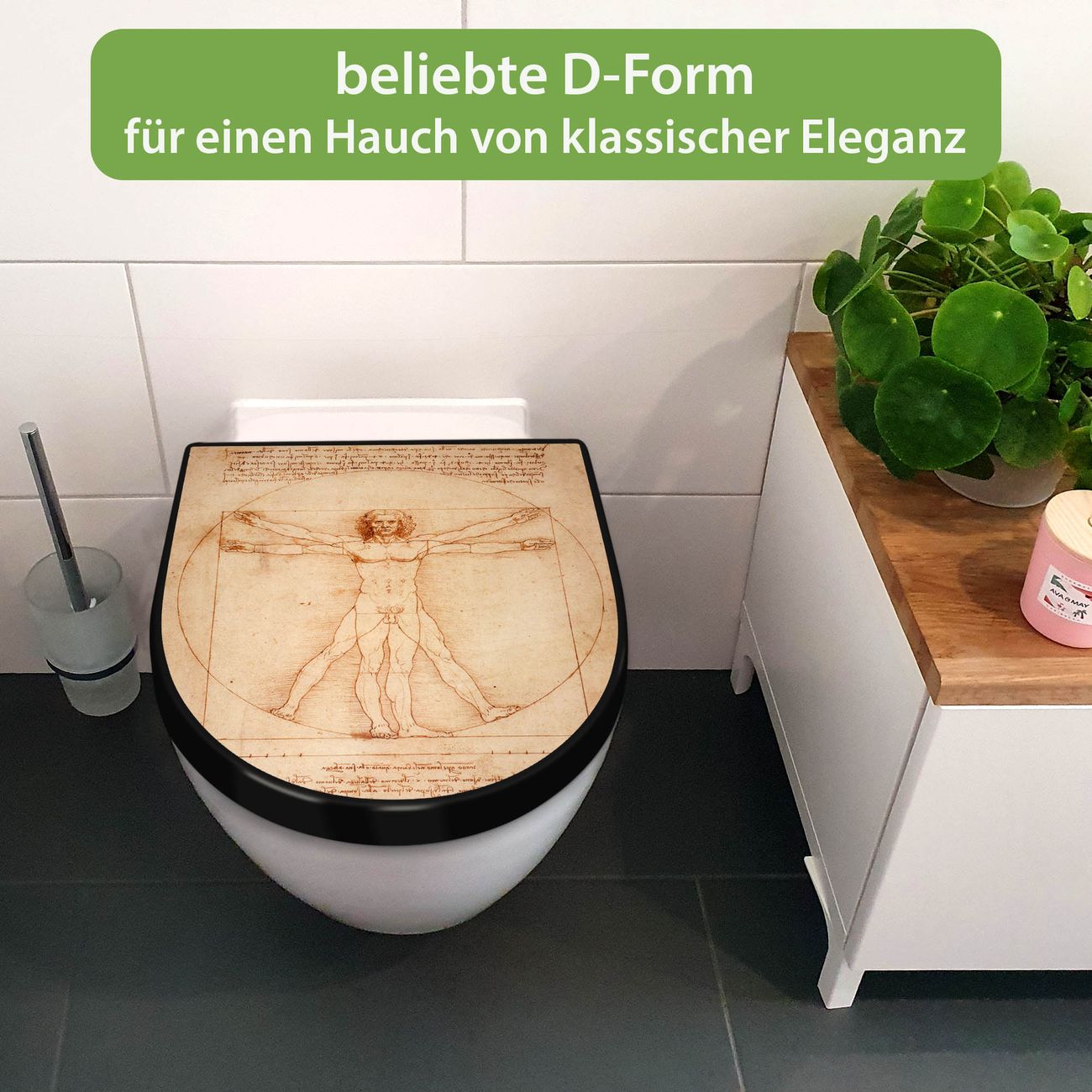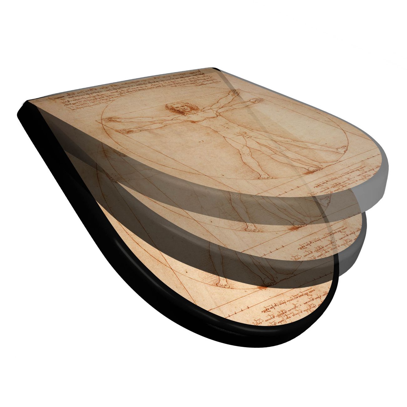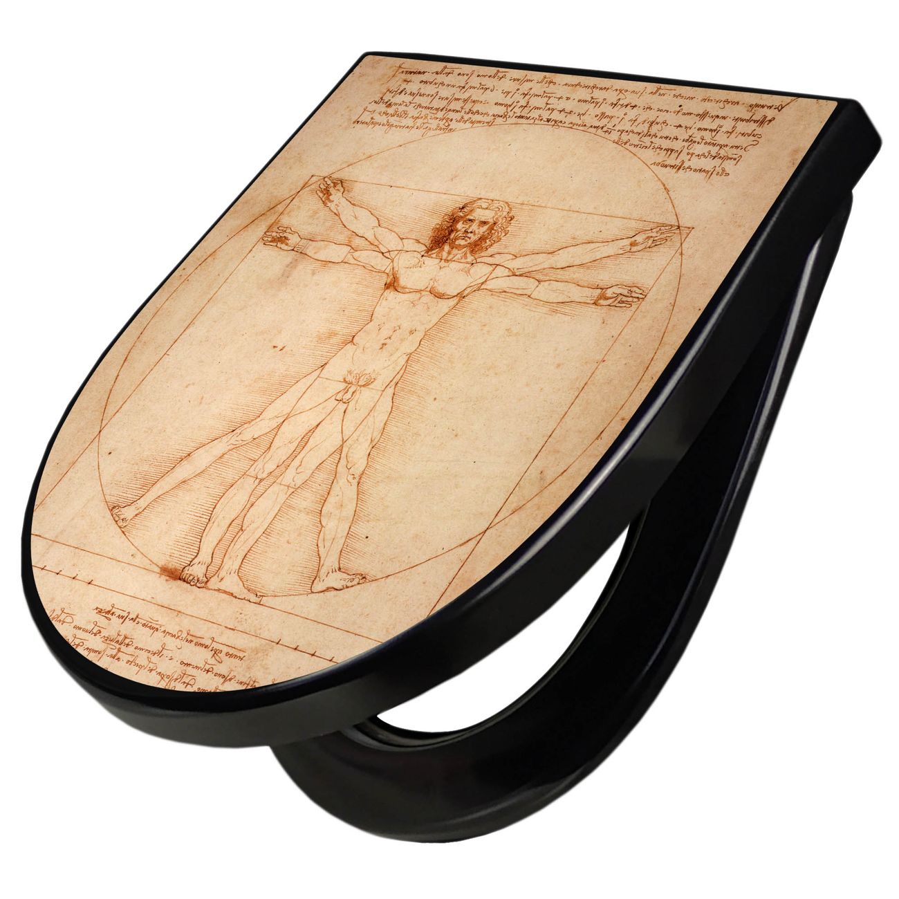 WC Sitz D-Form Schwarz mit Absenkautomatik Motiv Vitruvianische Figur