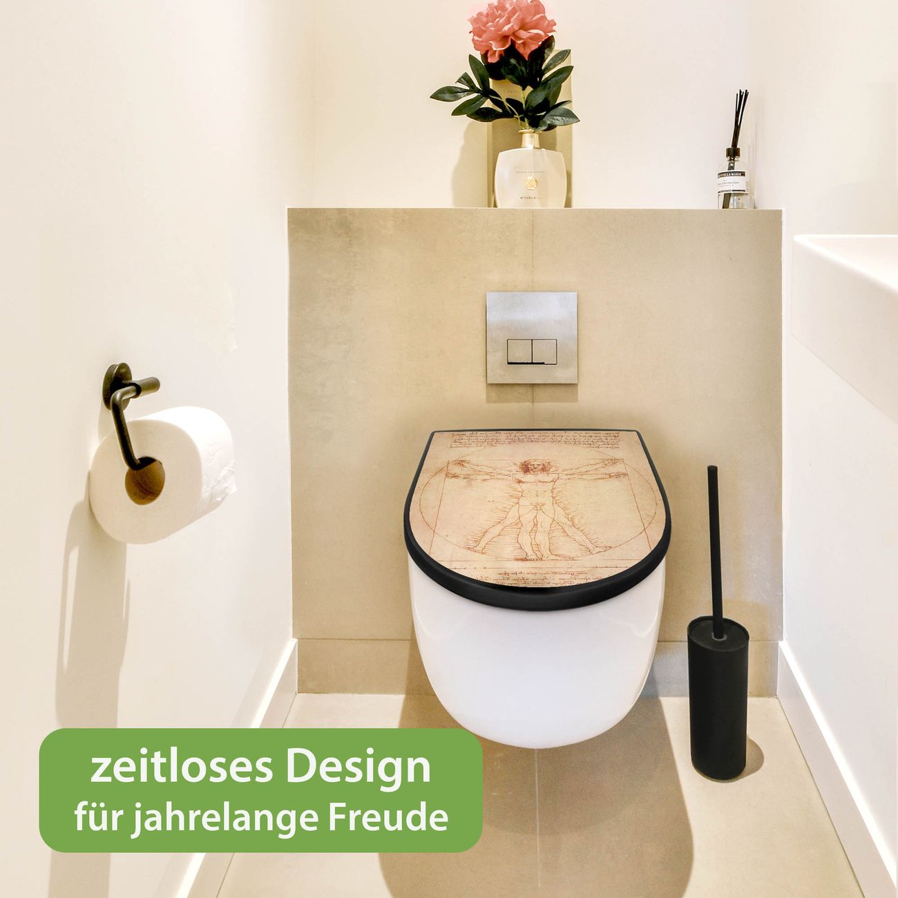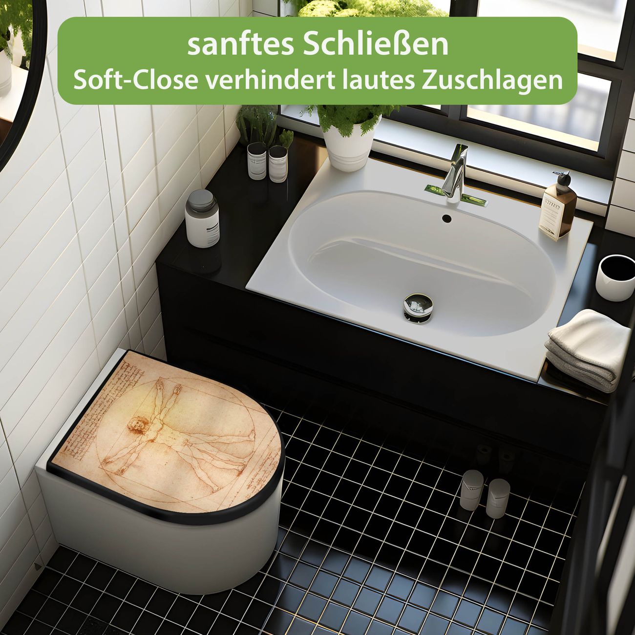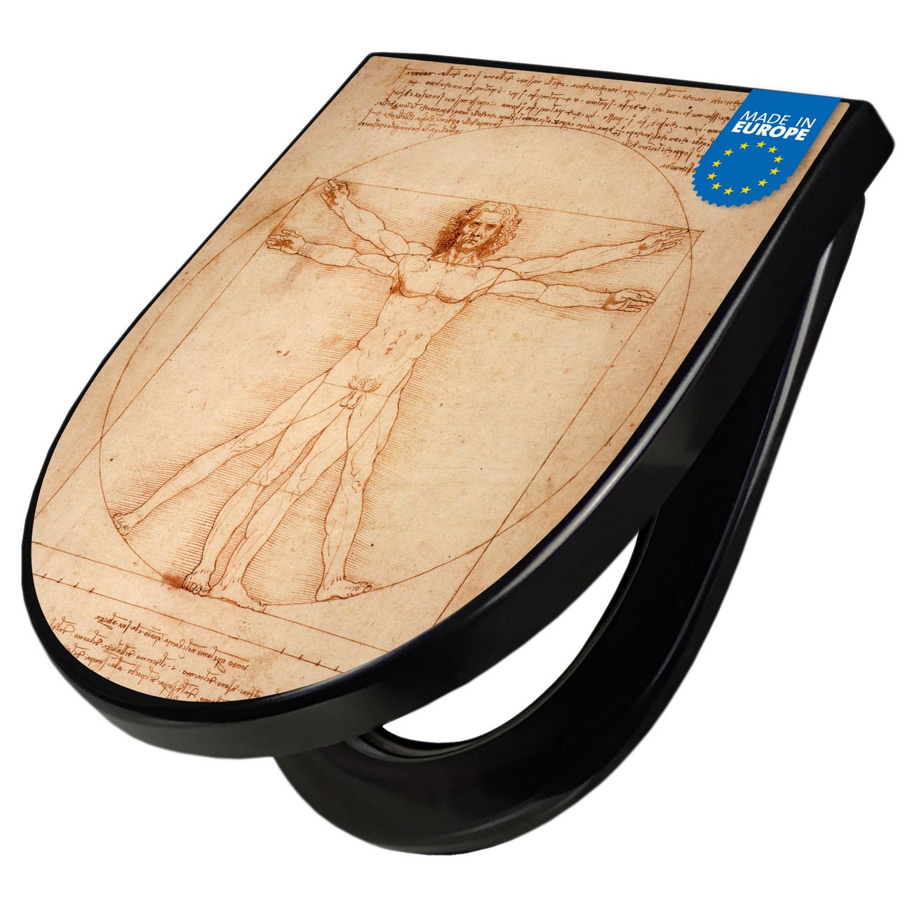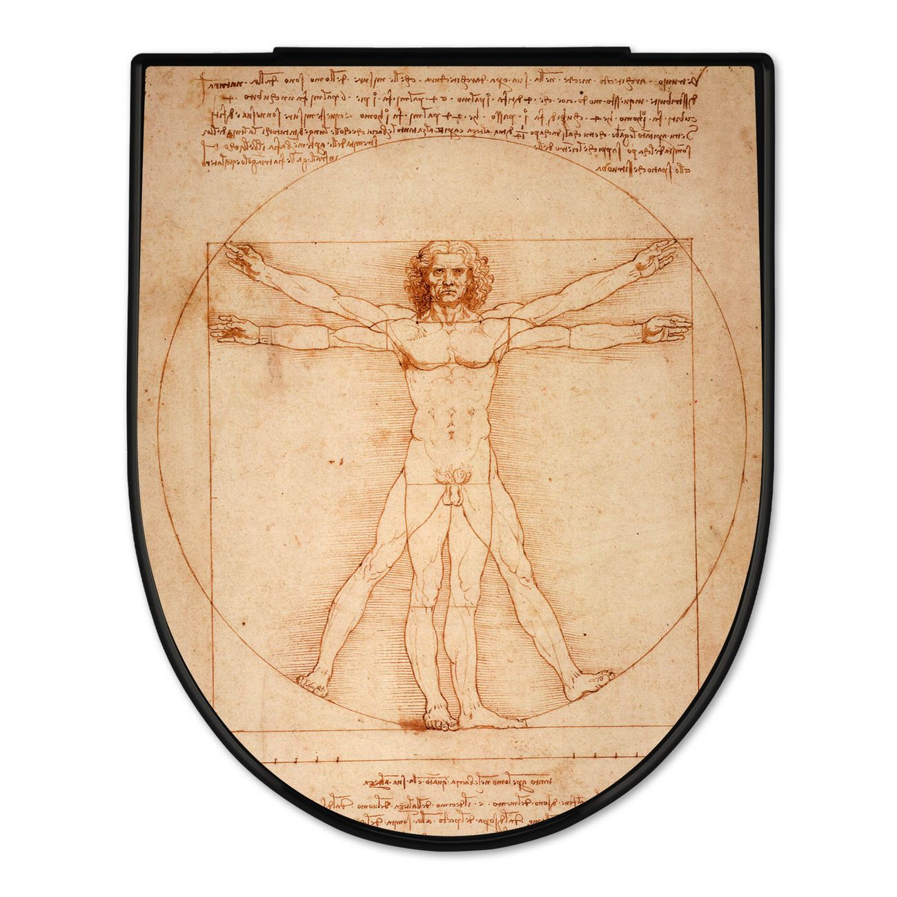 WC Sitz D-Form Schwarz mit Absenkautomatik Motiv Vitruvianische Figur