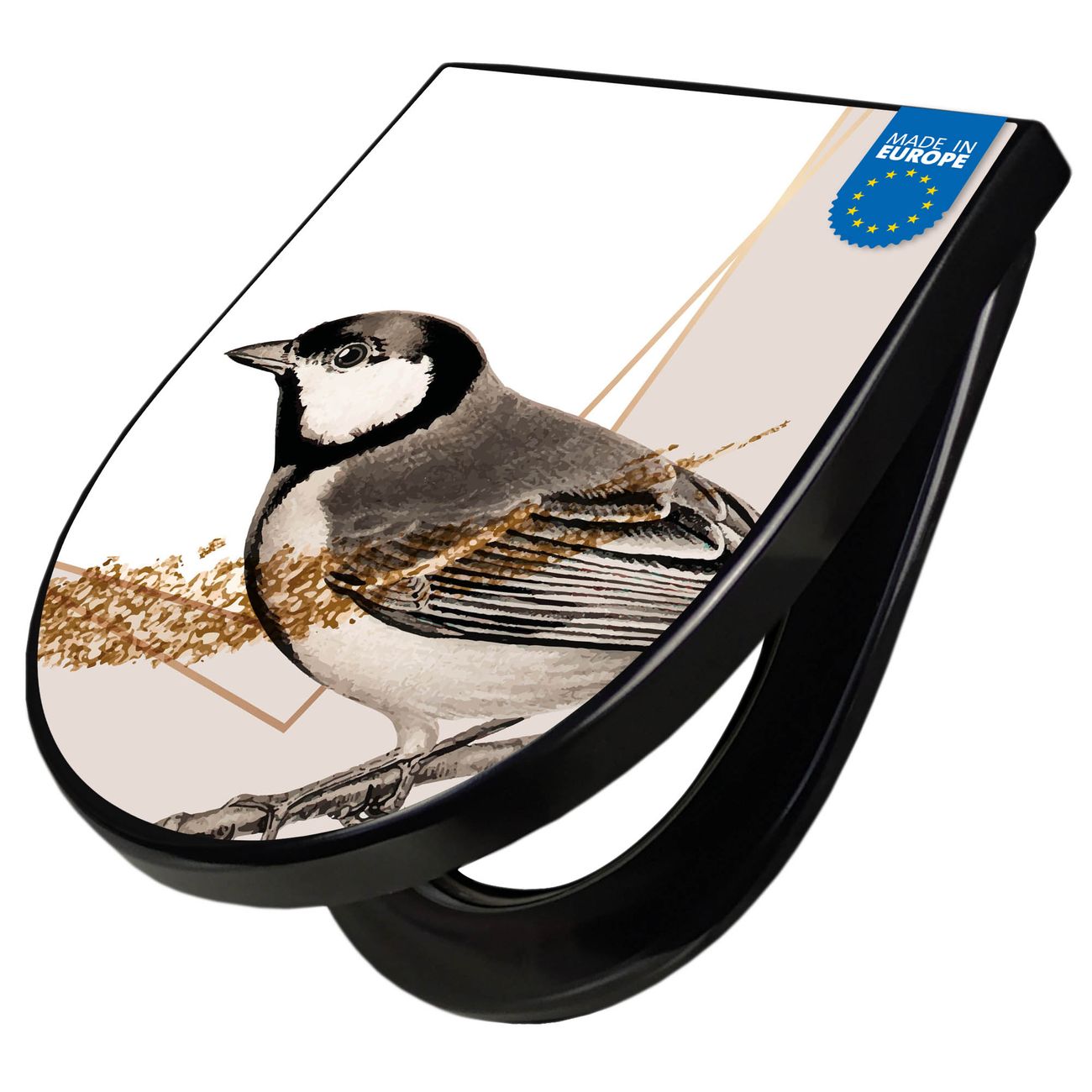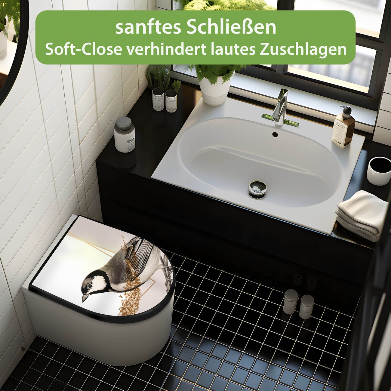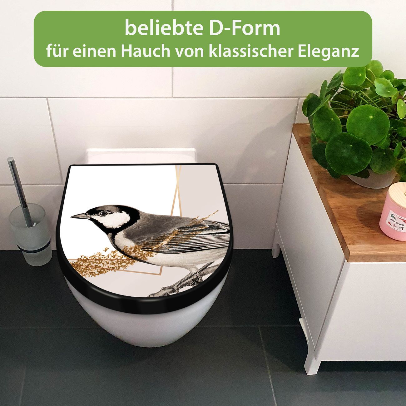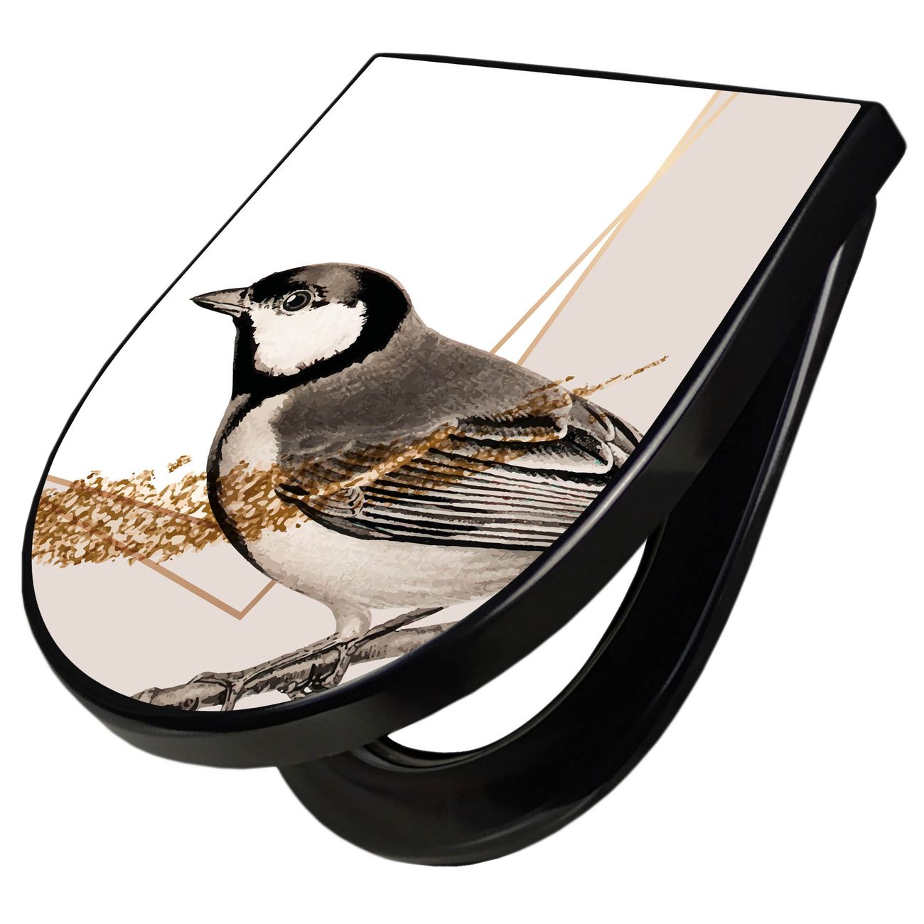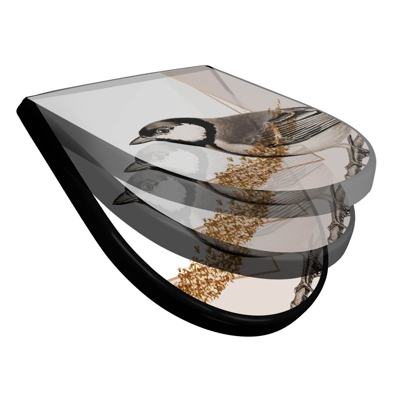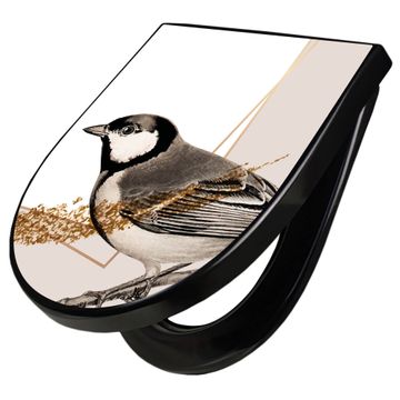 WC Sitz D-Form Schwarz mit Absenkautomatik Motiv Vogel auf Zweig 2