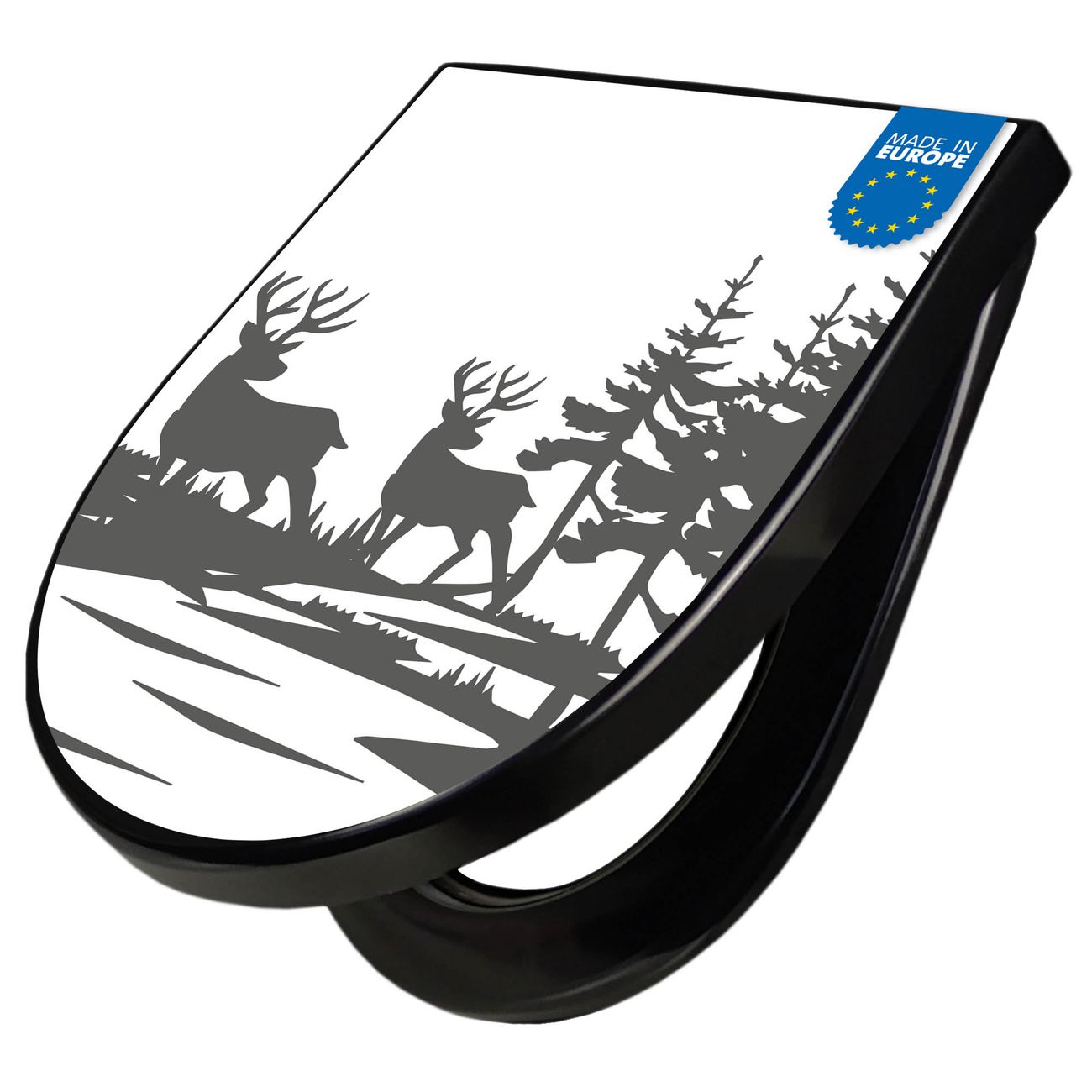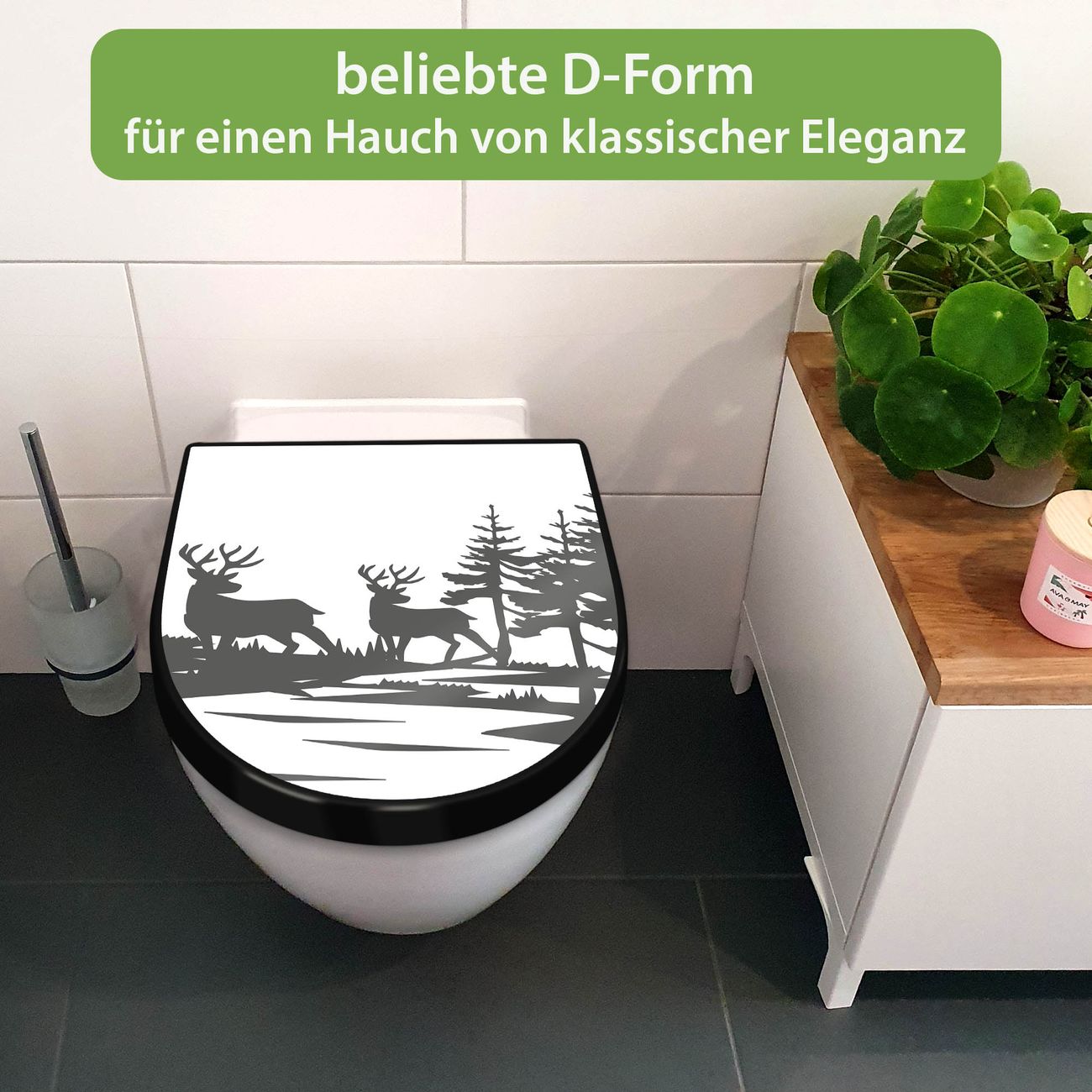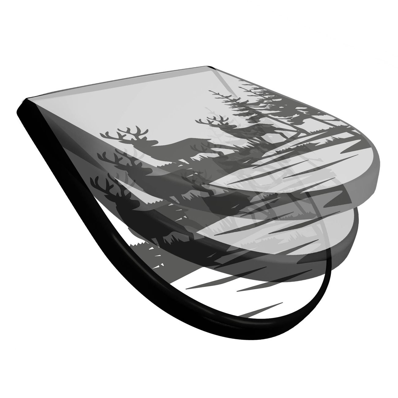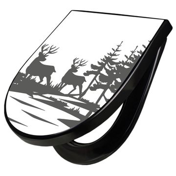 WC Sitz D-Form Schwarz mit Absenkautomatik Motiv Waldidylle mit Hirschen