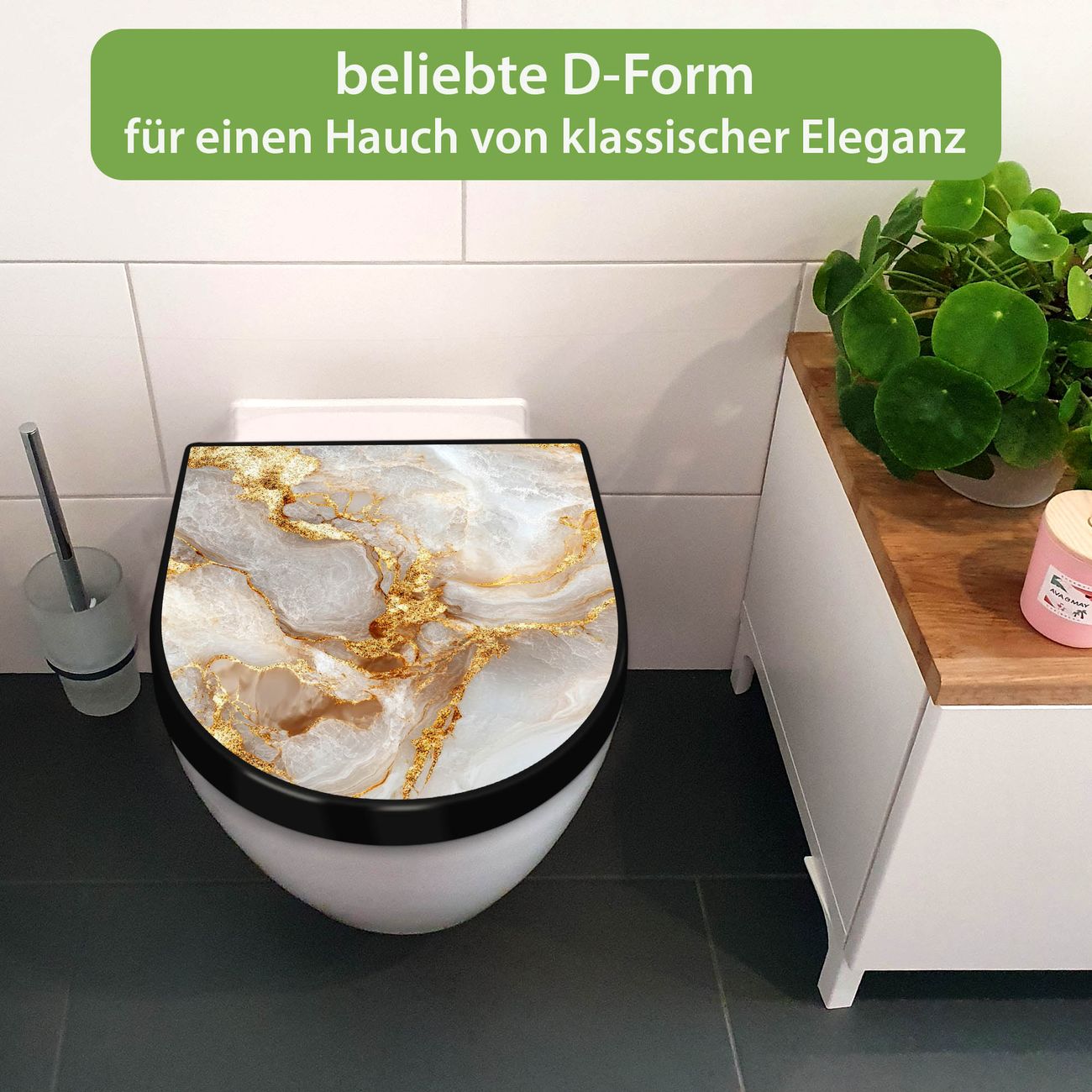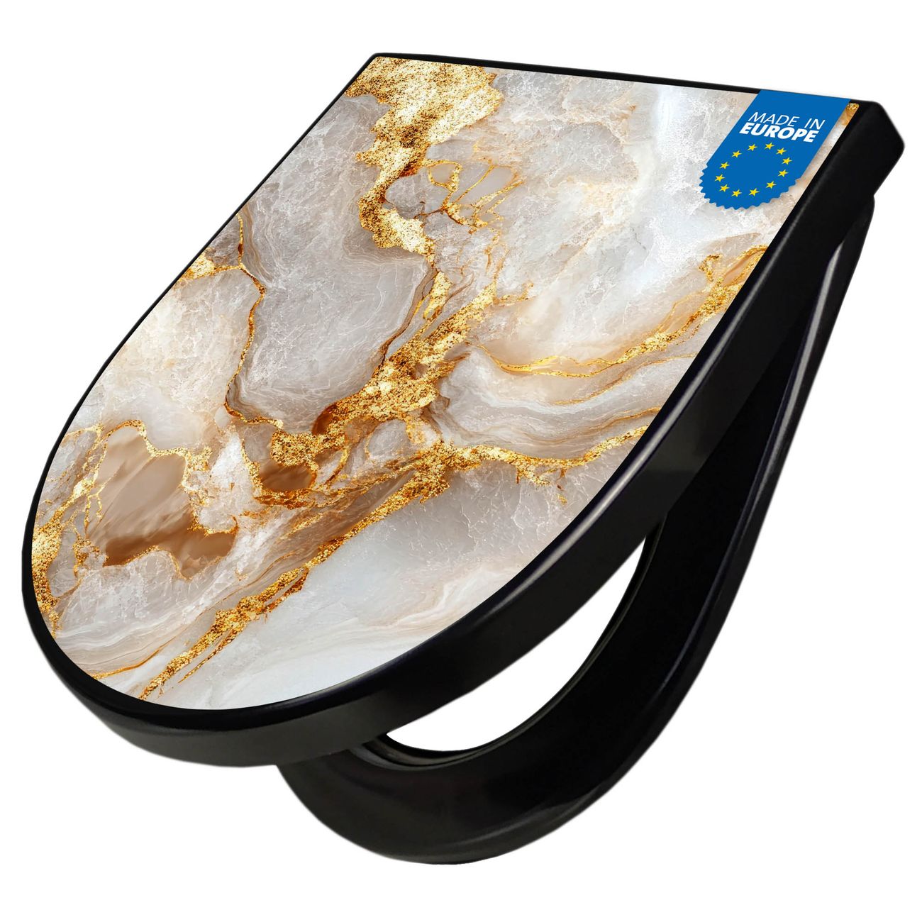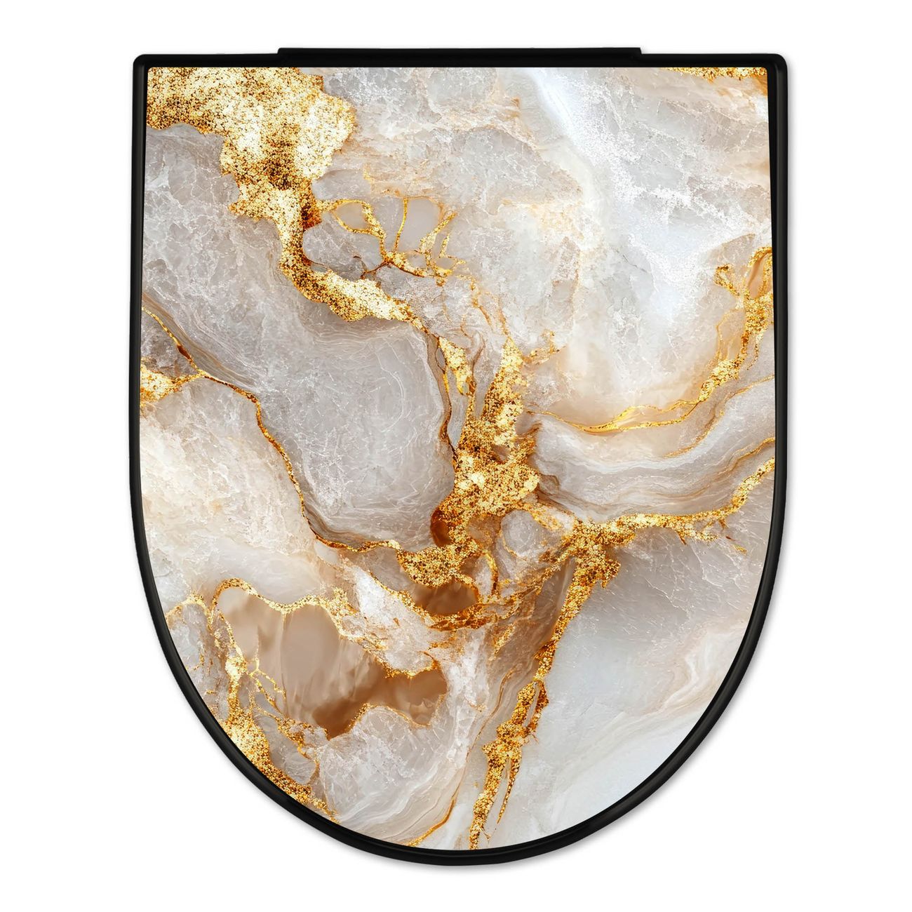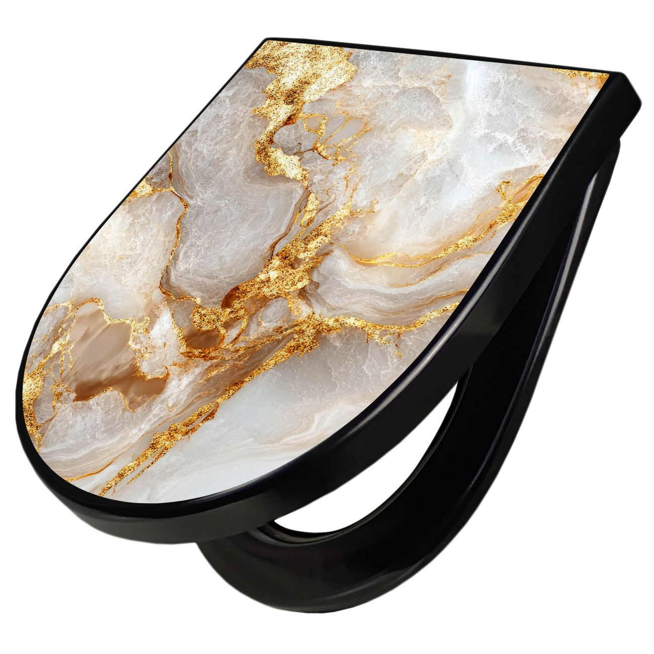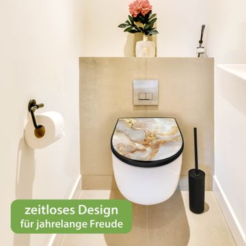 WC Sitz D-Form Schwarz mit Absenkautomatik Motiv Weißer Marmor mit Gold 1