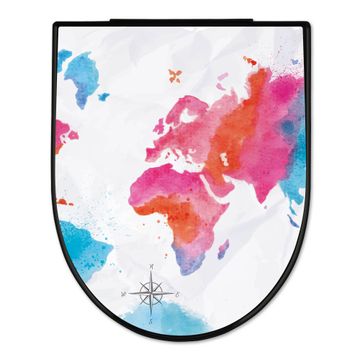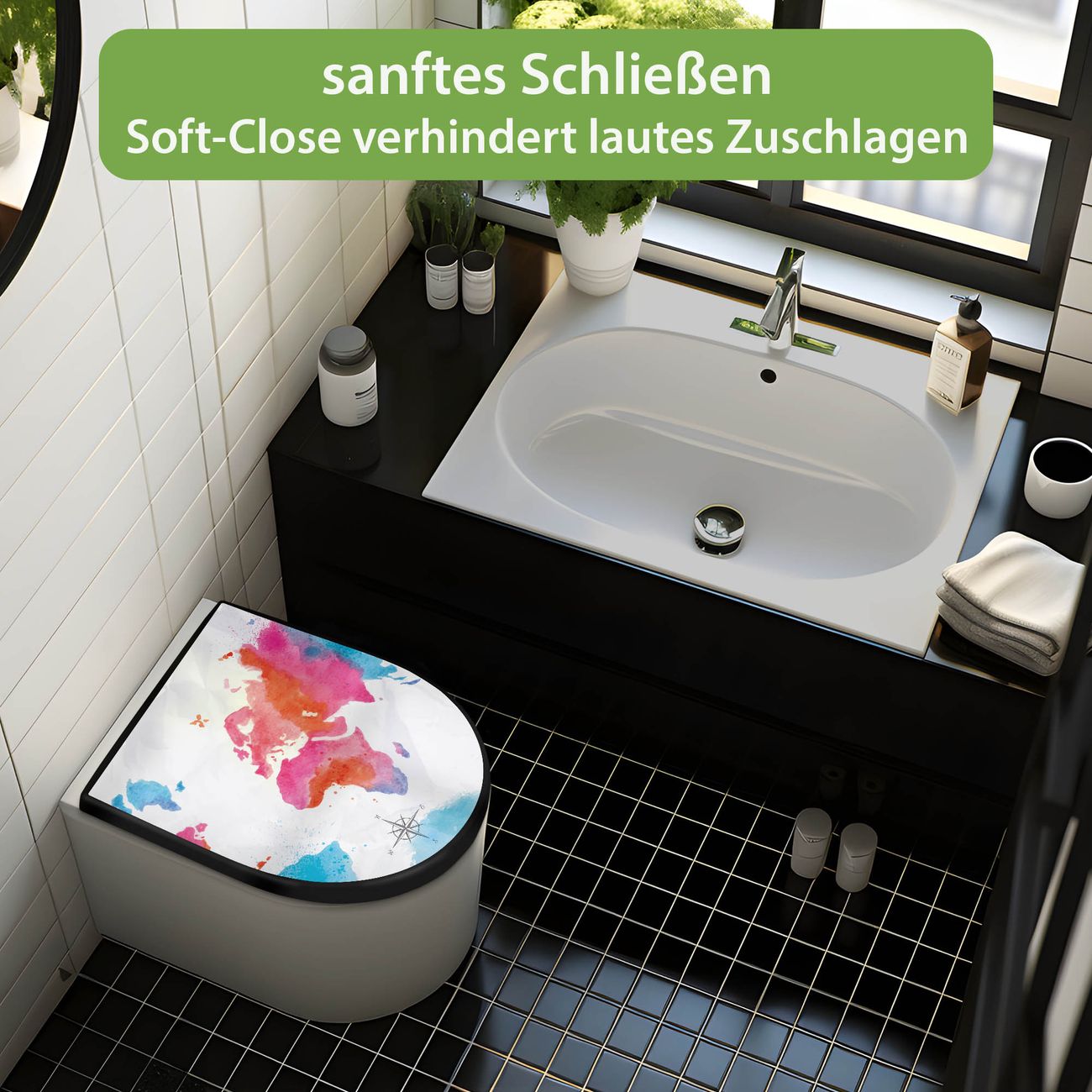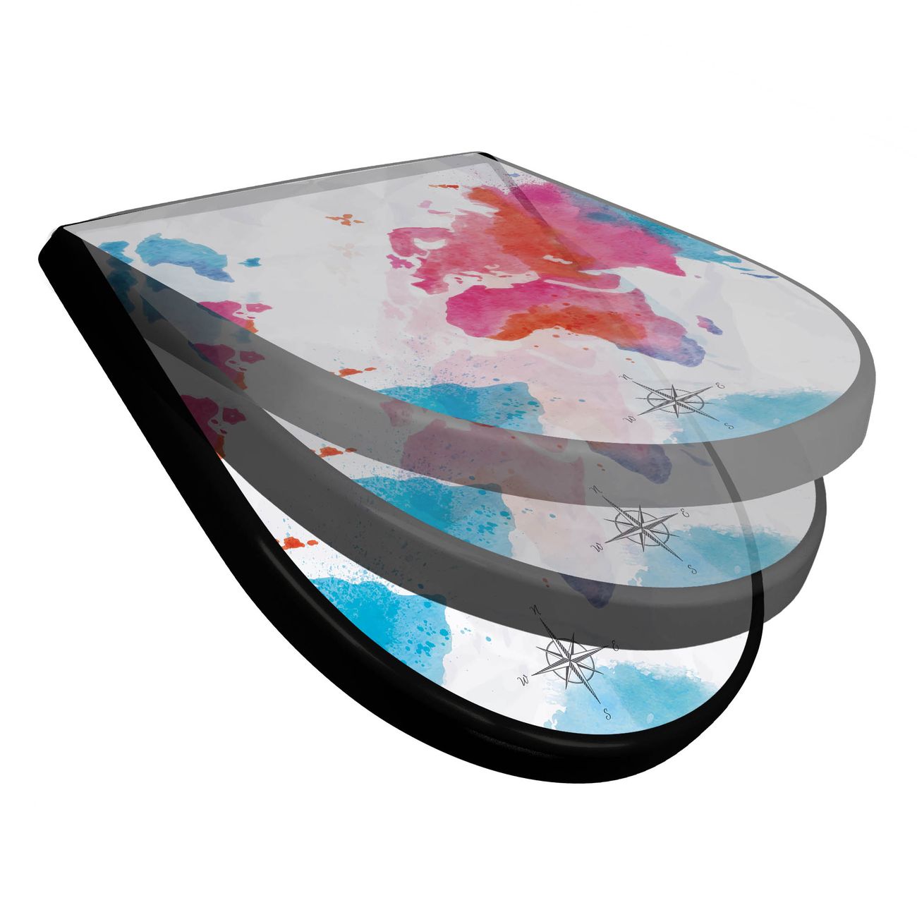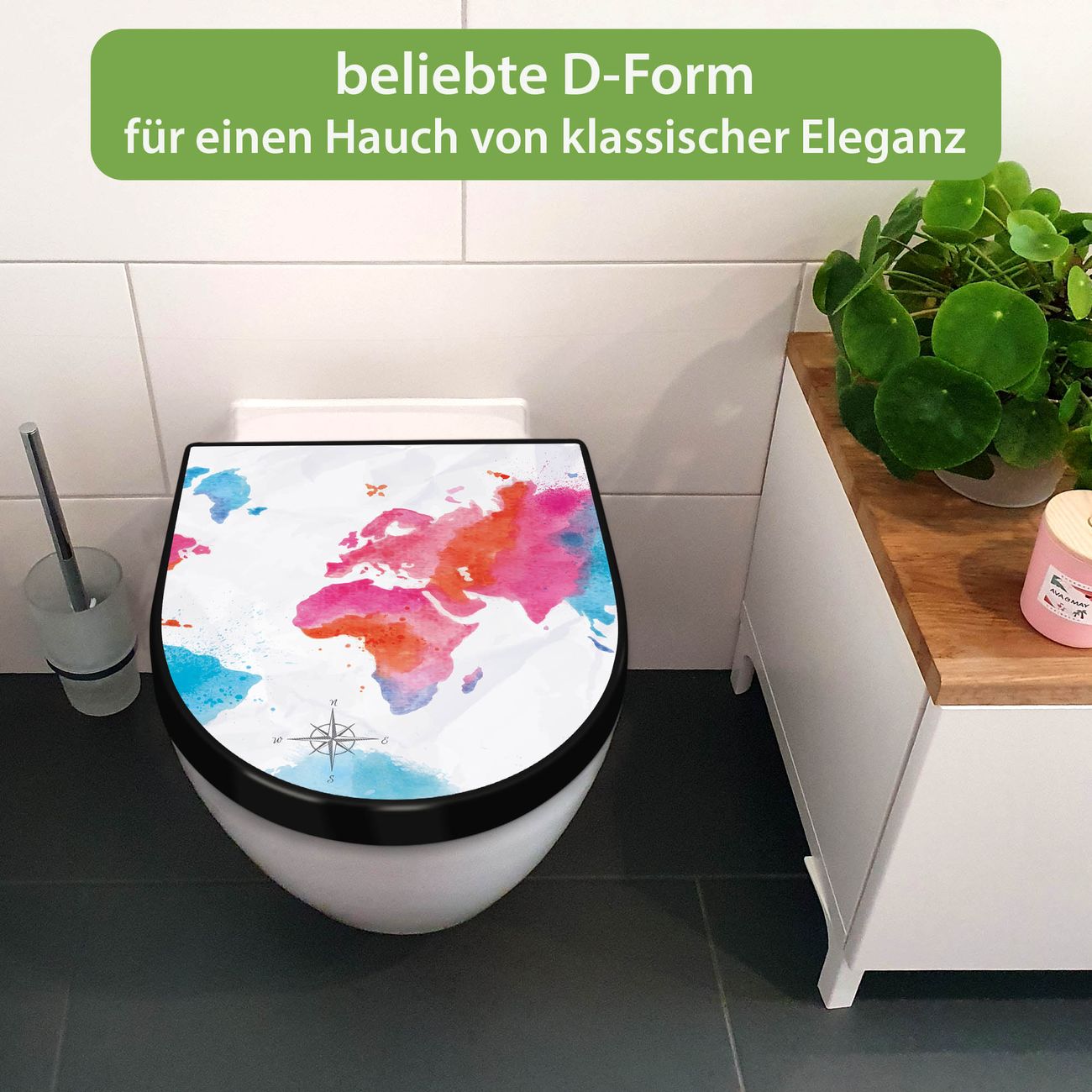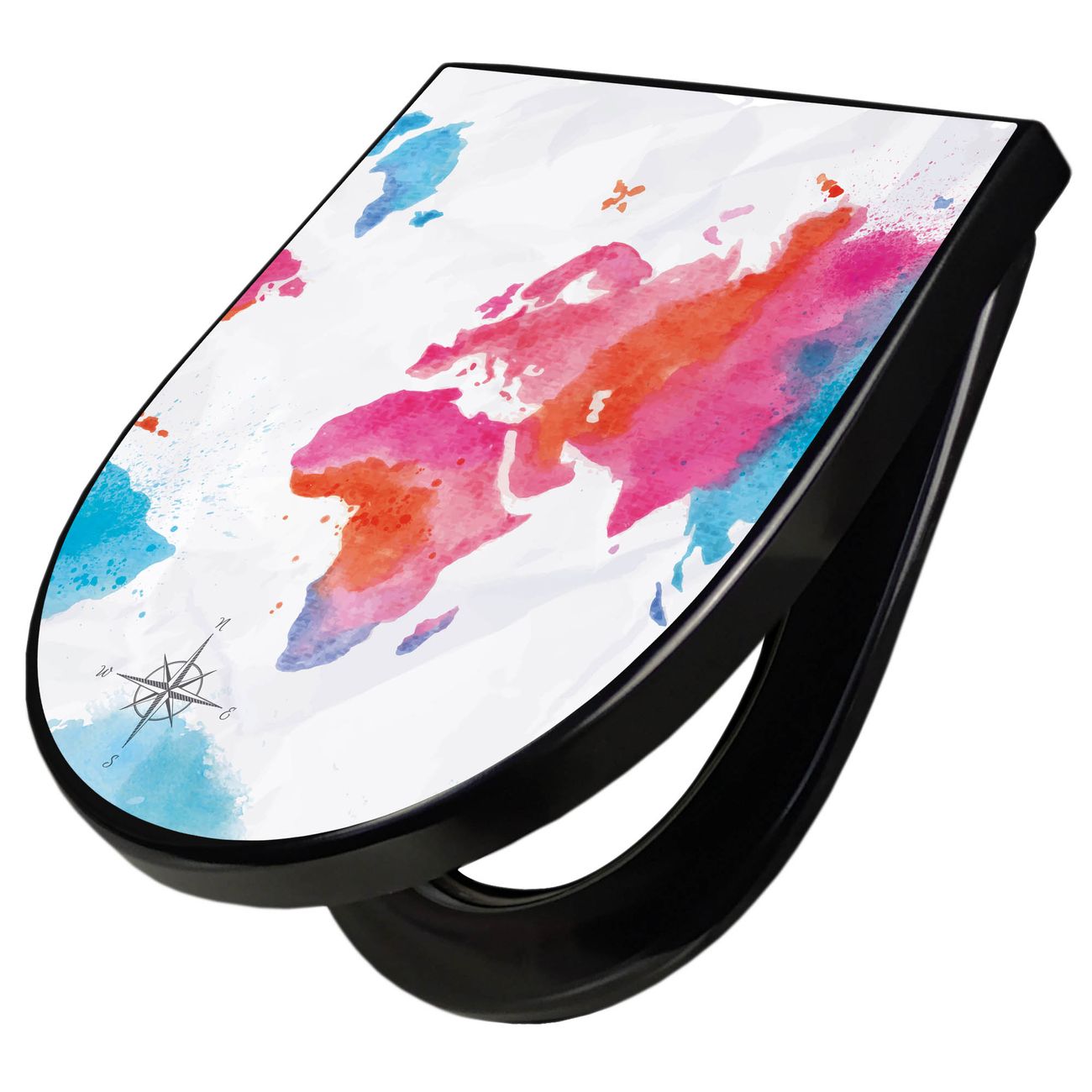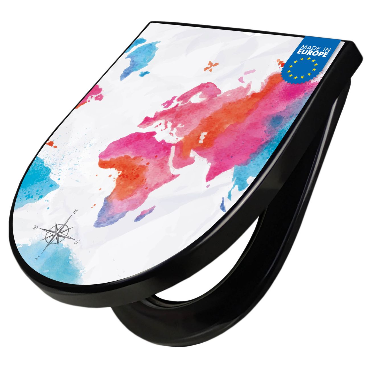 WC Sitz D-Form Schwarz mit Absenkautomatik Motiv Weltkarte pastell