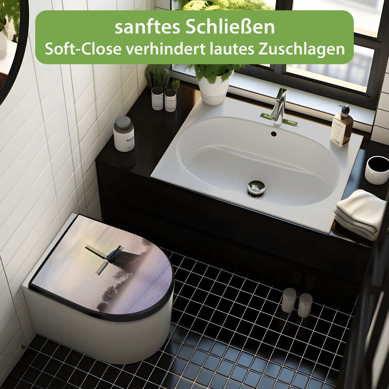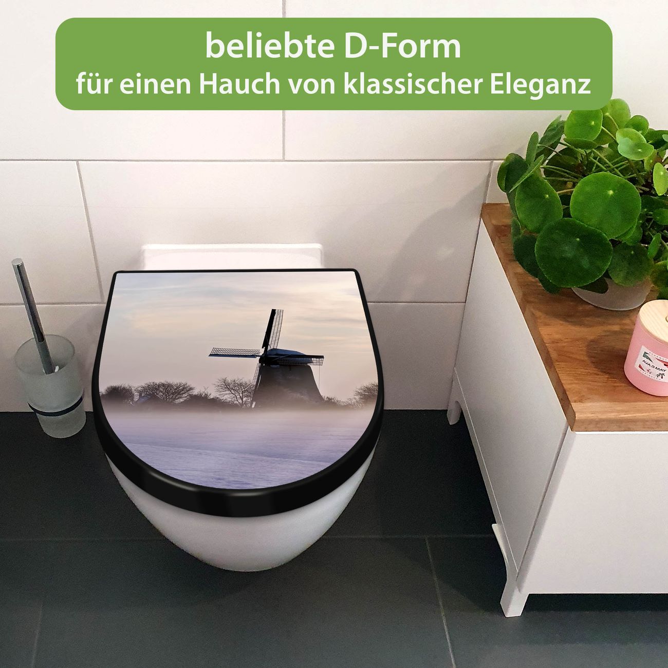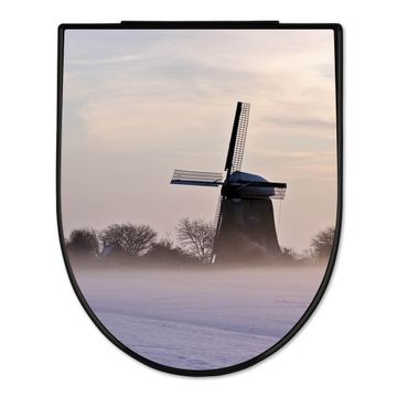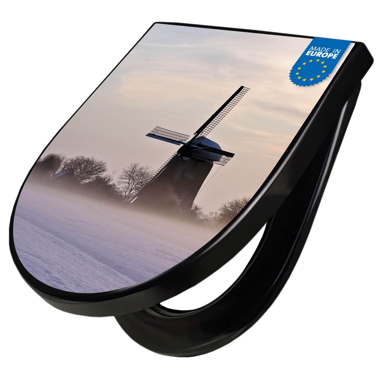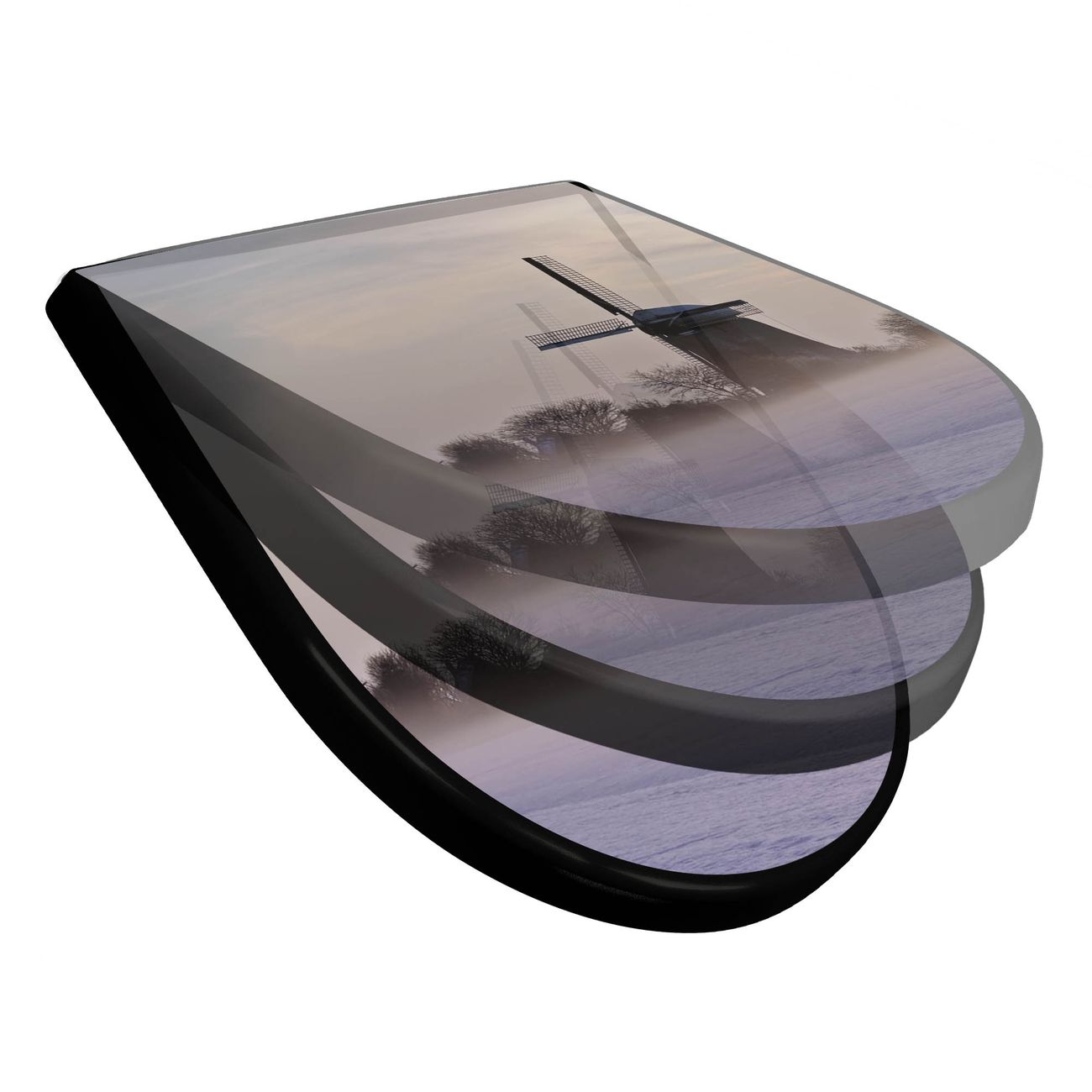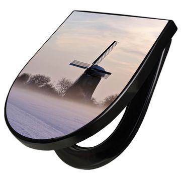 WC Sitz D-Form Schwarz mit Absenkautomatik Motiv Windmühle im Winter