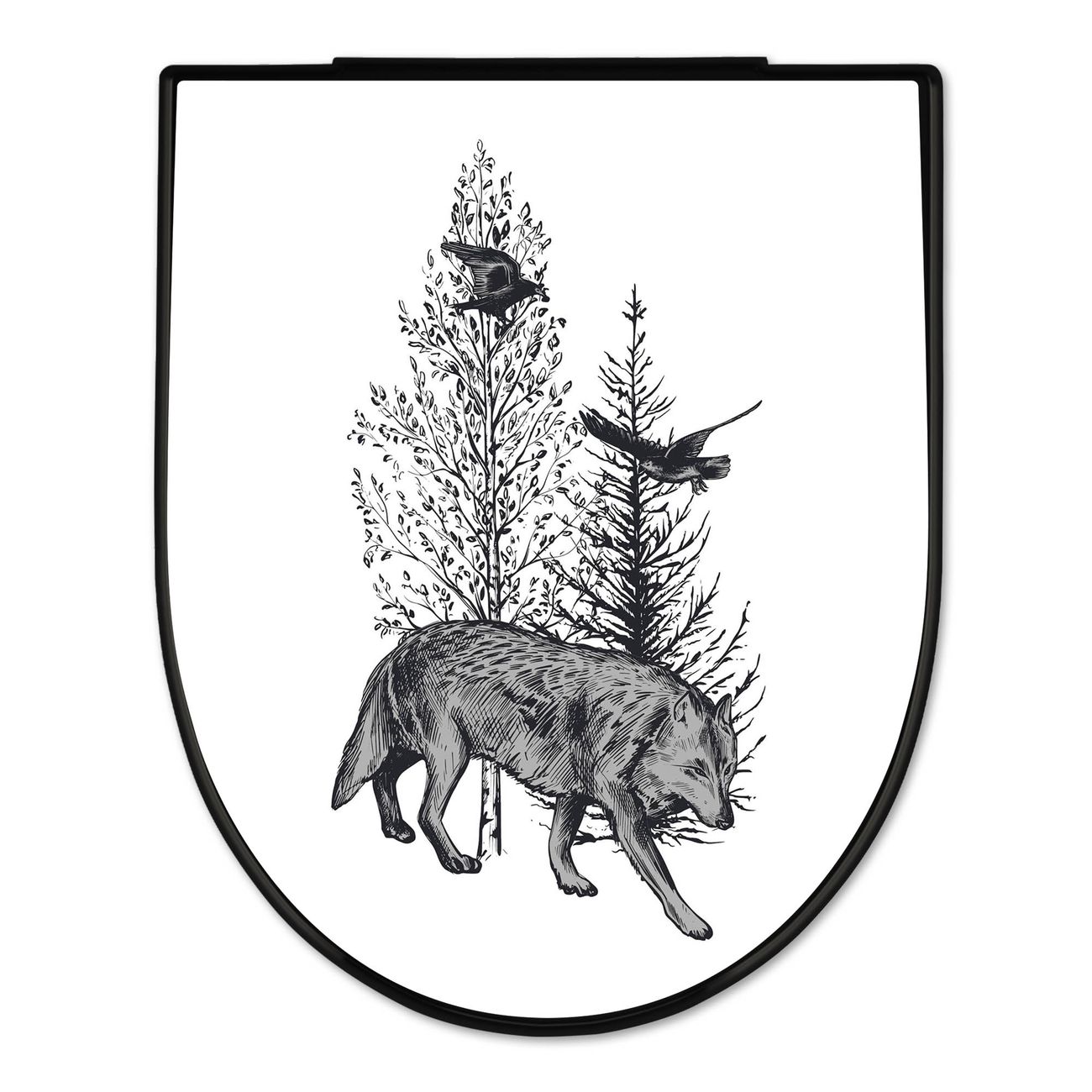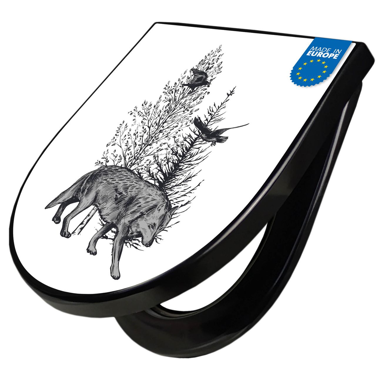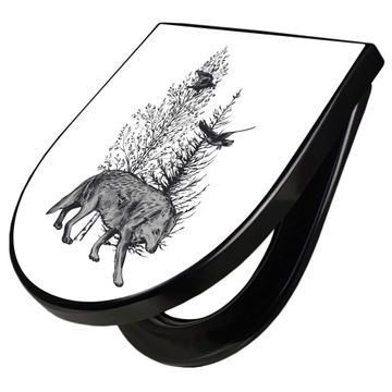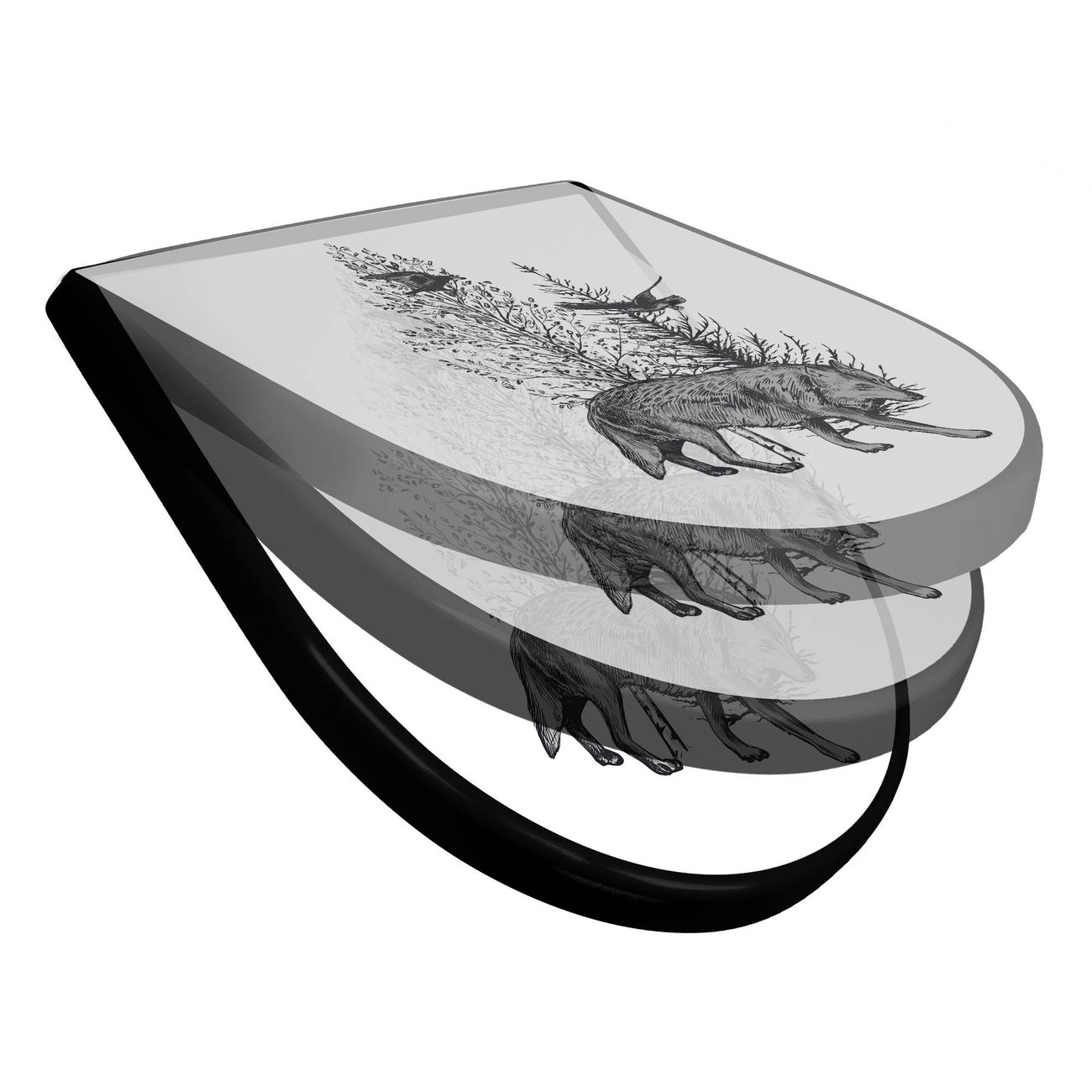 WC Sitz D-Form Schwarz mit Absenkautomatik Motiv Wolf in Schwarz-Weiß