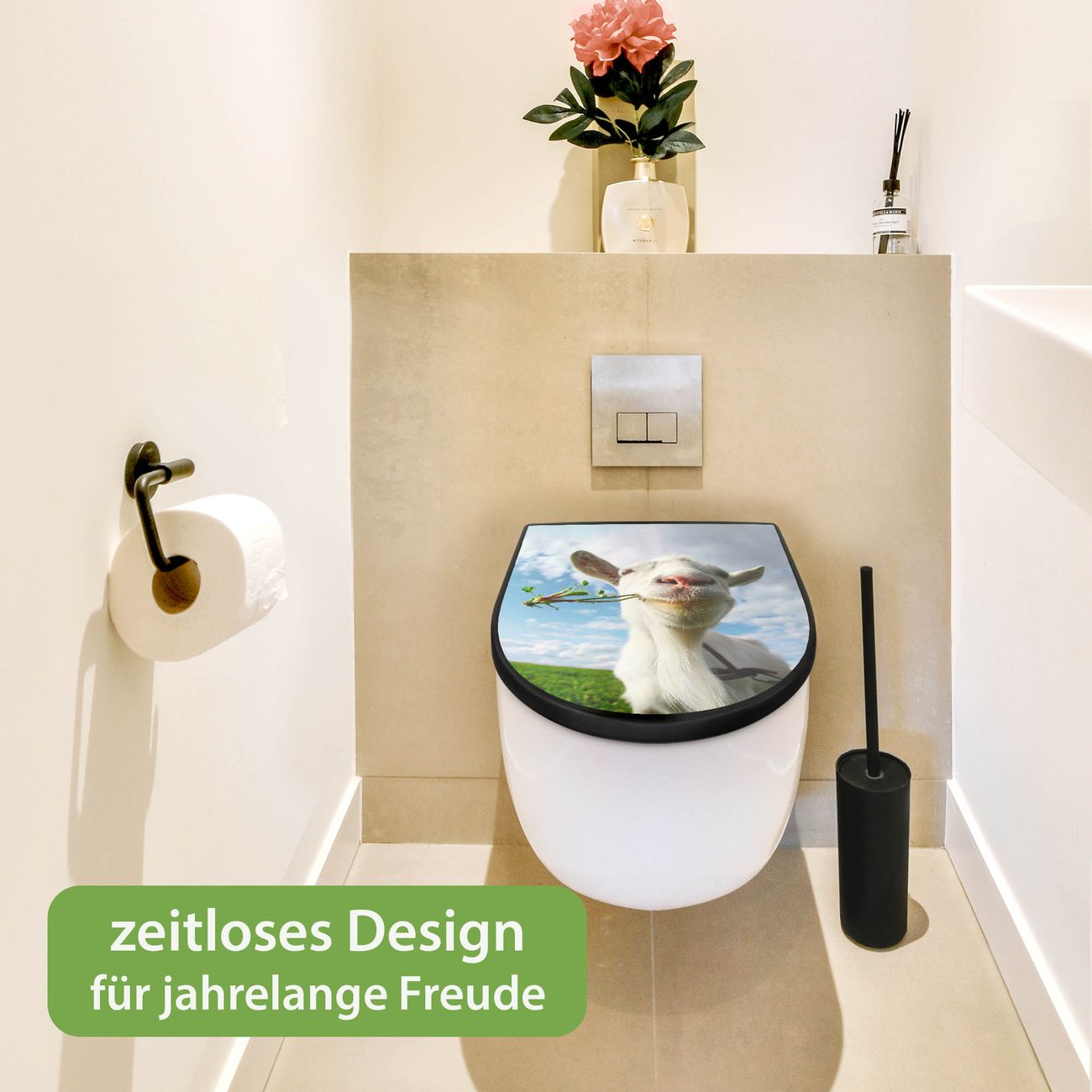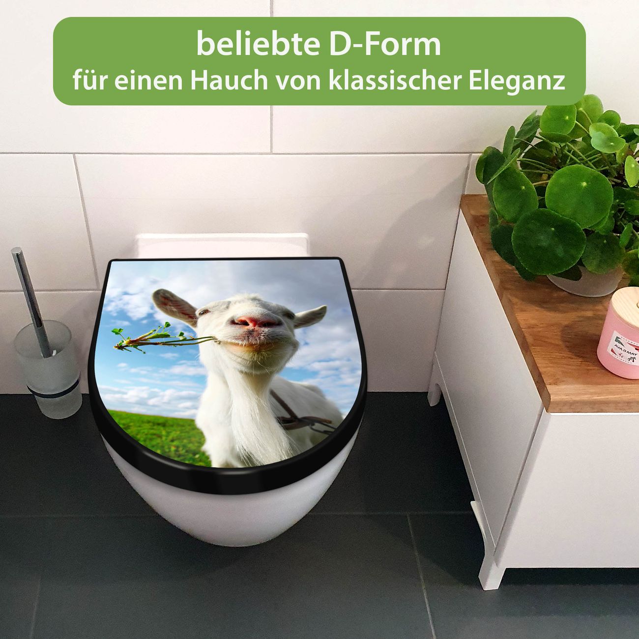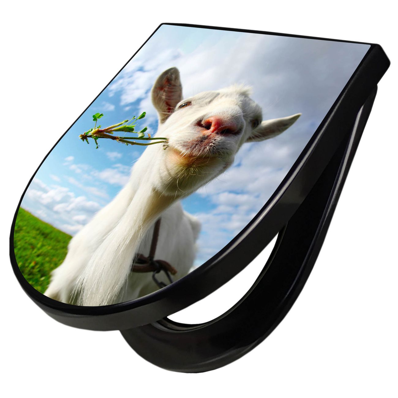 WC Sitz D-Form Schwarz mit Absenkautomatik Motiv Ziege 2