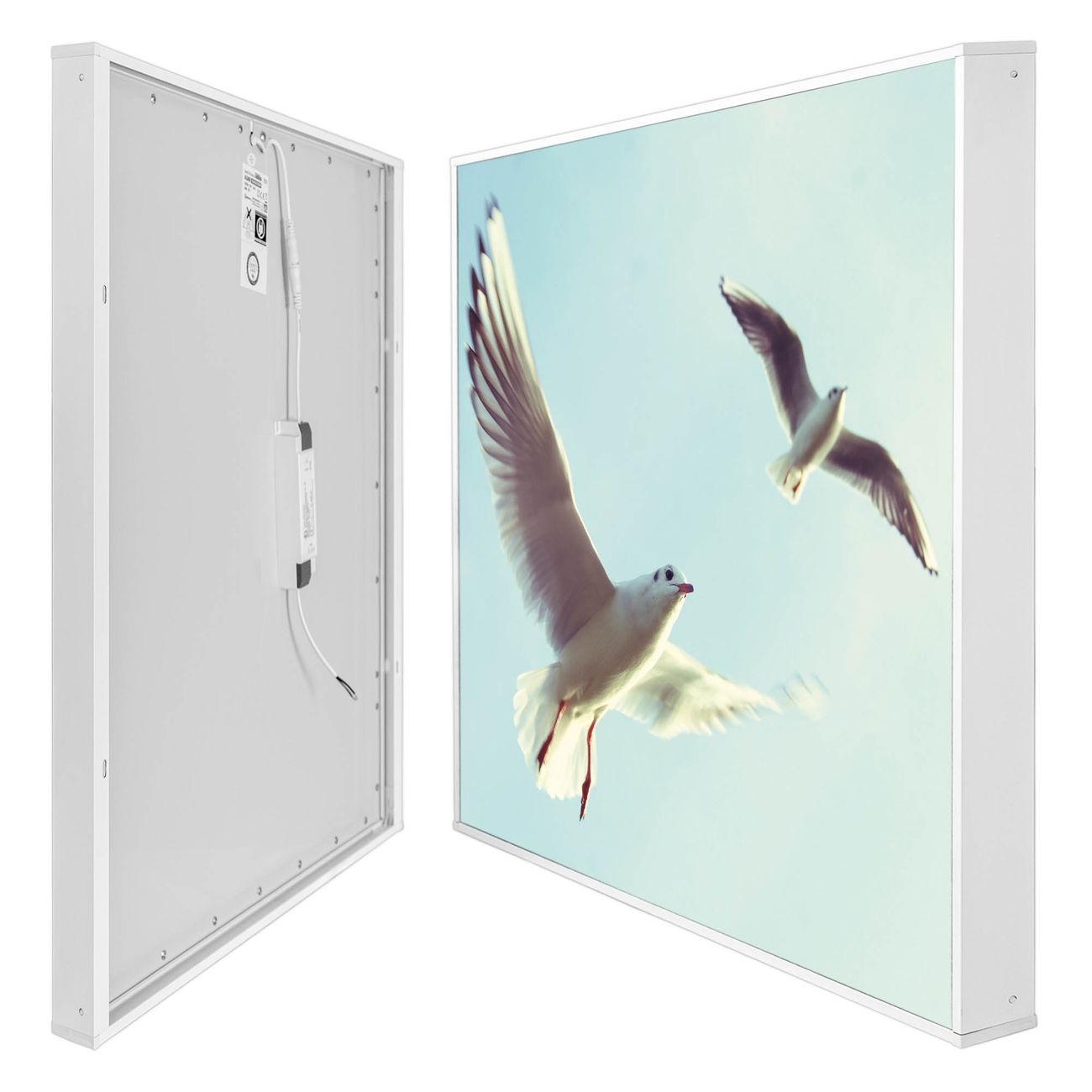 banjado LED Wandleuchte Sie erhalten hier eine stimmungsvolle Lichtquelle bestehend aus dem Set: Smart LED Panel mit Trafo, Motivscheibe (Motiv: 2 Möwen) und Rahmen. Der Aufbau ist denkbar einfach, Sie erhalten eine detaillierte Aufbauanleitung. Die komplette Leuchte kann sowohl an der Wand angeschlossen werden als auch als Deckenleuchte. Die Gesamtgröße der Lampe ist 62,5 x 62,5 x 4,5cm (HxBxT). Das Set besteht aus: LED Panel mit Trafo, Rahmen und Motivbild zum Selbstaufbau.