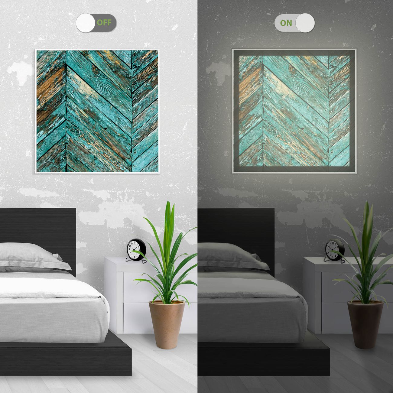 Motiv  Altes Holz Blau Nr. 11355 Größe  62,5x62,5x4,5cm BxHxT Gewicht  ca. 1,50 kg Material  Acylglas, Metall, hochwertig bedruckte Premiumfolie Druck  farbbrilliant, hochauflösend Stärke Glas  4mm Acylglas Dimmbar  JA LED Paneel  40W, 230V, 3600lm, 4000K neutralweiß Aussehen  Tags ein Wandbild, Nachts eine Lampe Steuerung  SmartApp / Alexa / Google Assistent oder ähnliche