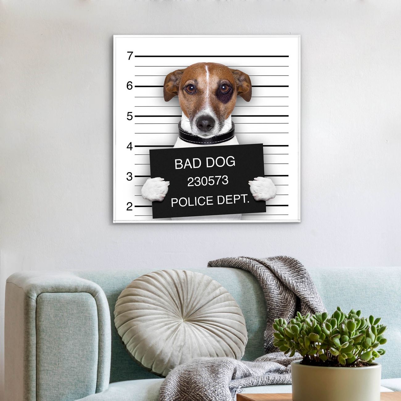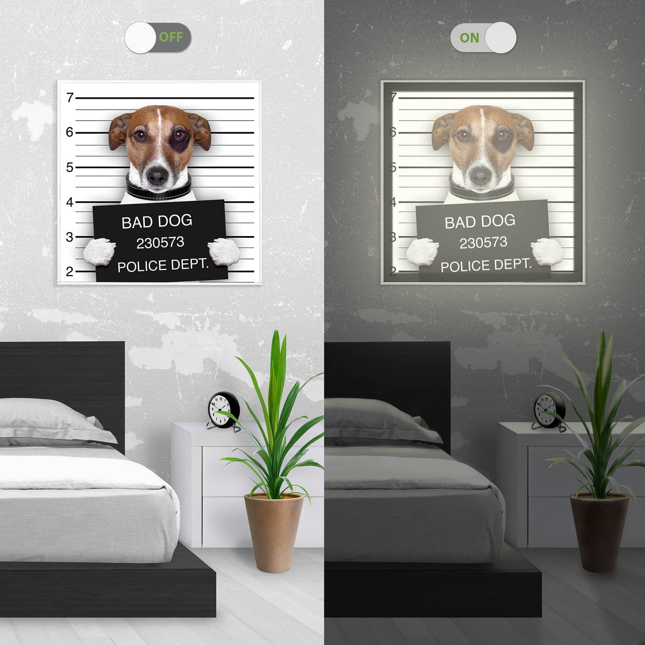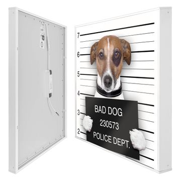 Mit der banjado smarten LED Wandleuchte mit Motiv Bad Dog Jack Russel schaffen Sie in Ihren Räumen eine besondere Atmosphäre. Abends spendet die Wandlampe Licht und tagsüber haben Sie ein stimmungsvolles Wandbild. Die Leuchte besteht aus einem zeitlosen weißen Rahmen, in den das smarte WLAN LED Paneel sowie das Bild eingefasst wird. Die Montage ist denkbar einfach, Sie erhalten eine detaillierte Aufbauanleitung sowie Montagematerial. Eine angenehme Lichtquelle erhöht nachweislich das Wohlbefinden. Das Motiv der Leuchte lässt sich leicht wechseln, so können Sie Ihre Wohnräume individuell gestalten. Die Montage ist an der Wand oder an der Decke möglich.