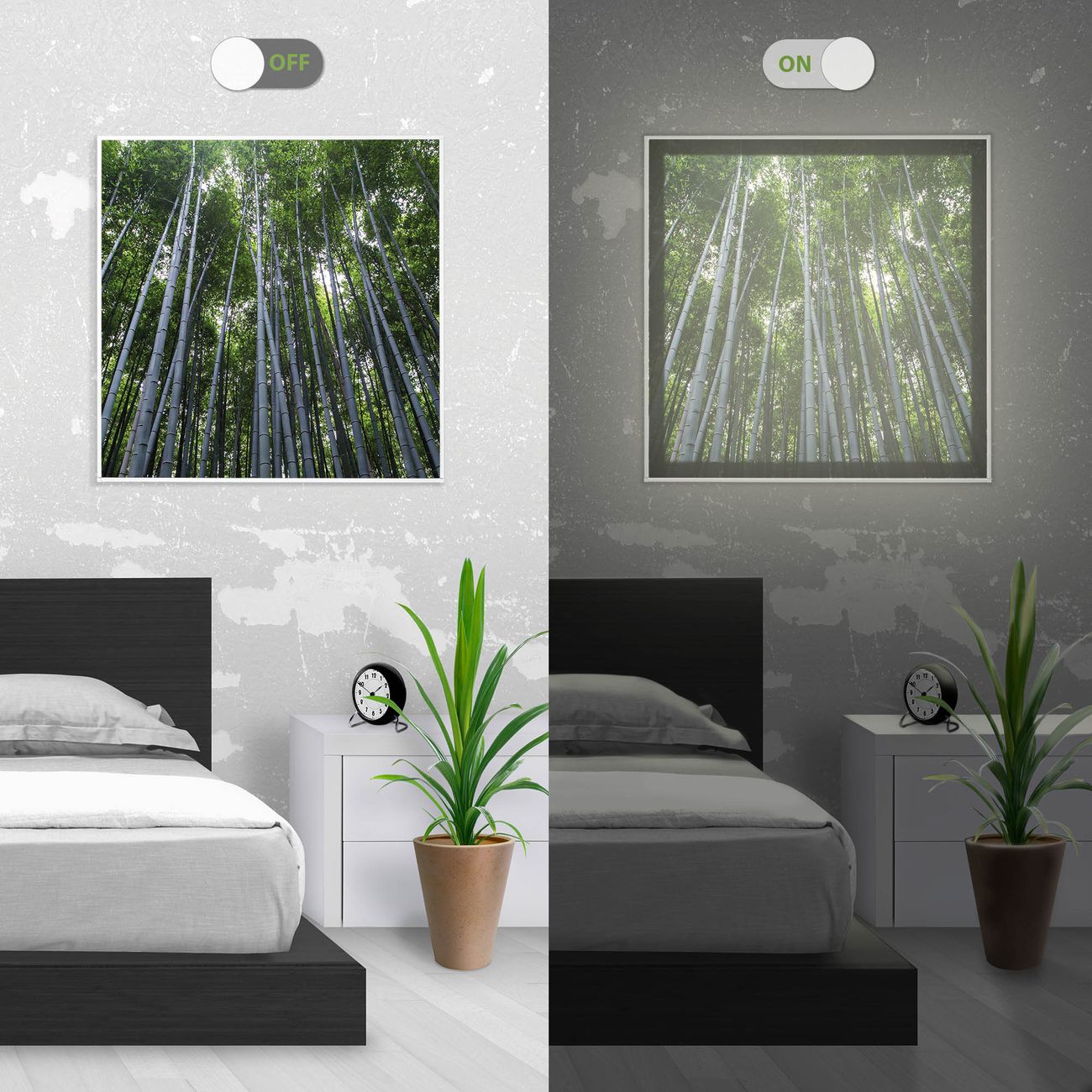Mit der banjado smarten LED Wandleuchte mit Motiv Bambuswald schaffen Sie in Ihren Räumen eine besondere Atmosphäre. Abends spendet die Wandlampe Licht und tagsüber haben Sie ein stimmungsvolles Wandbild. Die Leuchte besteht aus einem zeitlosen weißen Rahmen, in den das smarte WLAN LED Paneel sowie das Bild eingefasst wird. Die Montage ist denkbar einfach, Sie erhalten eine detaillierte Aufbauanleitung sowie Montagematerial. Eine angenehme Lichtquelle erhöht nachweislich das Wohlbefinden. Das Motiv der Leuchte lässt sich leicht wechseln, so können Sie Ihre Wohnräume individuell gestalten. Die Montage ist an der Wand oder an der Decke möglich.