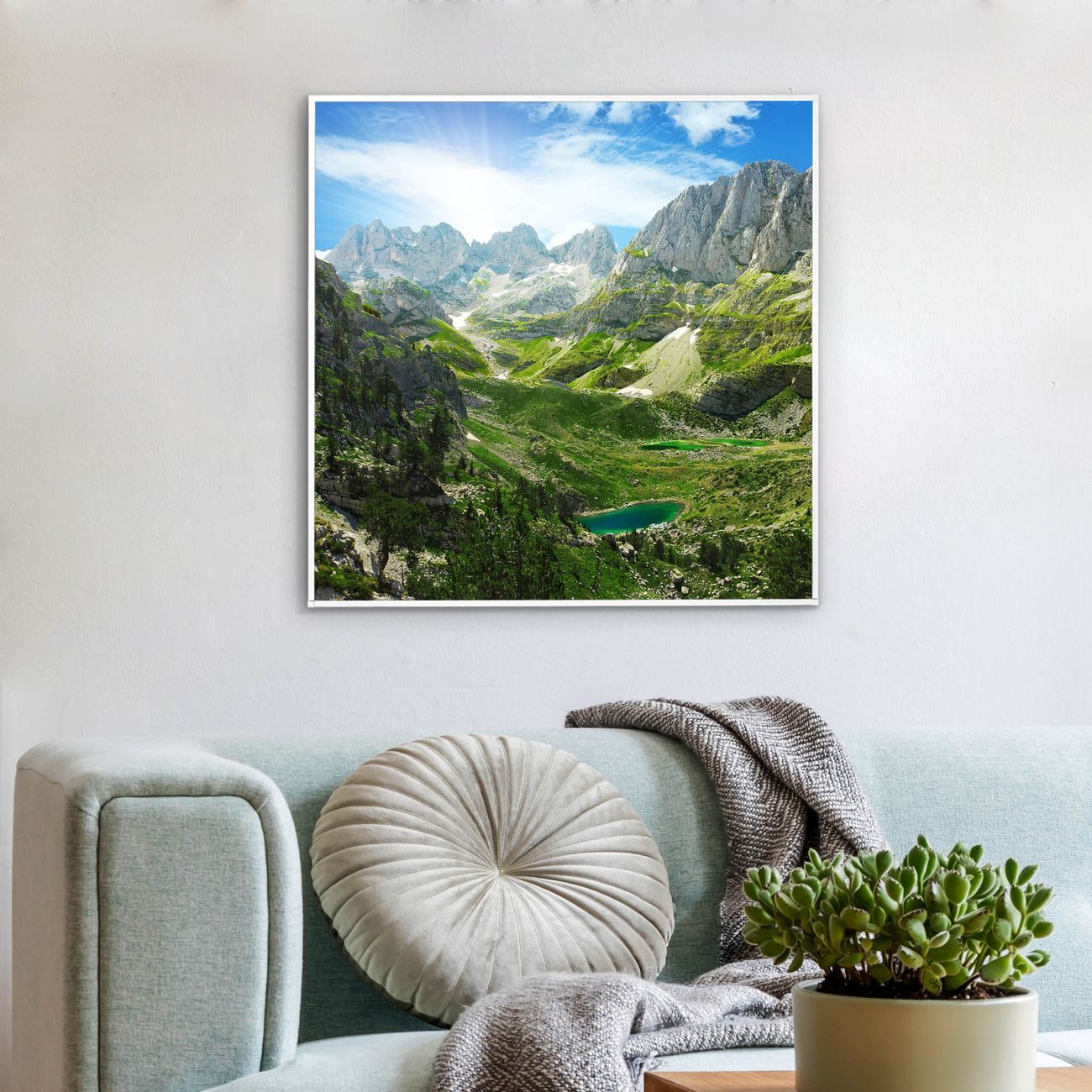 banjado LED Wandleuchte Sie erhalten hier eine stimmungsvolle Lichtquelle bestehend aus dem Set: Smart LED Panel mit Trafo, Motivscheibe (Motiv: Bergsee Alpen) und Rahmen. Der Aufbau ist denkbar einfach, Sie erhalten eine detaillierte Aufbauanleitung. Die komplette Leuchte kann sowohl an der Wand angeschlossen werden als auch als Deckenleuchte. Die Gesamtgröße der Lampe ist 62,5 x 62,5 x 4,5cm (HxBxT). Das Set besteht aus: LED Panel mit Trafo, Rahmen und Motivbild zum Selbstaufbau.