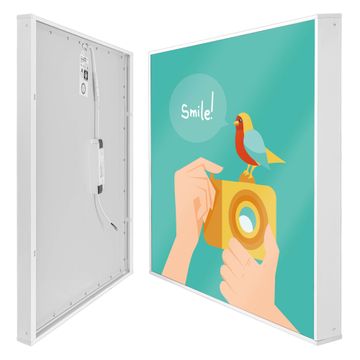 Mit der banjado smarten LED Wandleuchte mit Motiv Bitte Lächeln 2 schaffen Sie in Ihren Räumen eine besondere Atmosphäre. Abends spendet die Wandlampe Licht und tagsüber haben Sie ein stimmungsvolles Wandbild. Die Leuchte besteht aus einem zeitlosen weißen Rahmen, in den das smarte WLAN LED Paneel sowie das Bild eingefasst wird. Die Montage ist denkbar einfach, Sie erhalten eine detaillierte Aufbauanleitung sowie Montagematerial. Eine angenehme Lichtquelle erhöht nachweislich das Wohlbefinden. Das Motiv der Leuchte lässt sich leicht wechseln, so können Sie Ihre Wohnräume individuell gestalten. Die Montage ist an der Wand oder an der Decke möglich.