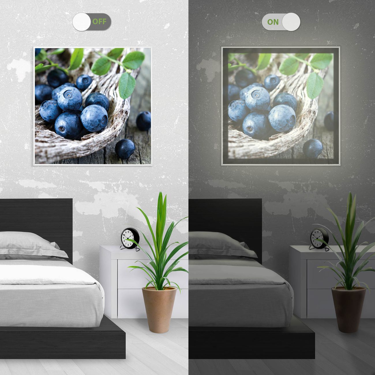 Mit der banjado smarten LED Wandleuchte mit Motiv Blaubeeren schaffen Sie in Ihren Räumen eine besondere Atmosphäre. Abends spendet die Wandlampe Licht und tagsüber haben Sie ein stimmungsvolles Wandbild. Die Leuchte besteht aus einem zeitlosen weißen Rahmen, in den das smarte WLAN LED Paneel sowie das Bild eingefasst wird. Die Montage ist denkbar einfach, Sie erhalten eine detaillierte Aufbauanleitung sowie Montagematerial. Eine angenehme Lichtquelle erhöht nachweislich das Wohlbefinden. Das Motiv der Leuchte lässt sich leicht wechseln, so können Sie Ihre Wohnräume individuell gestalten. Die Montage ist an der Wand oder an der Decke möglich.