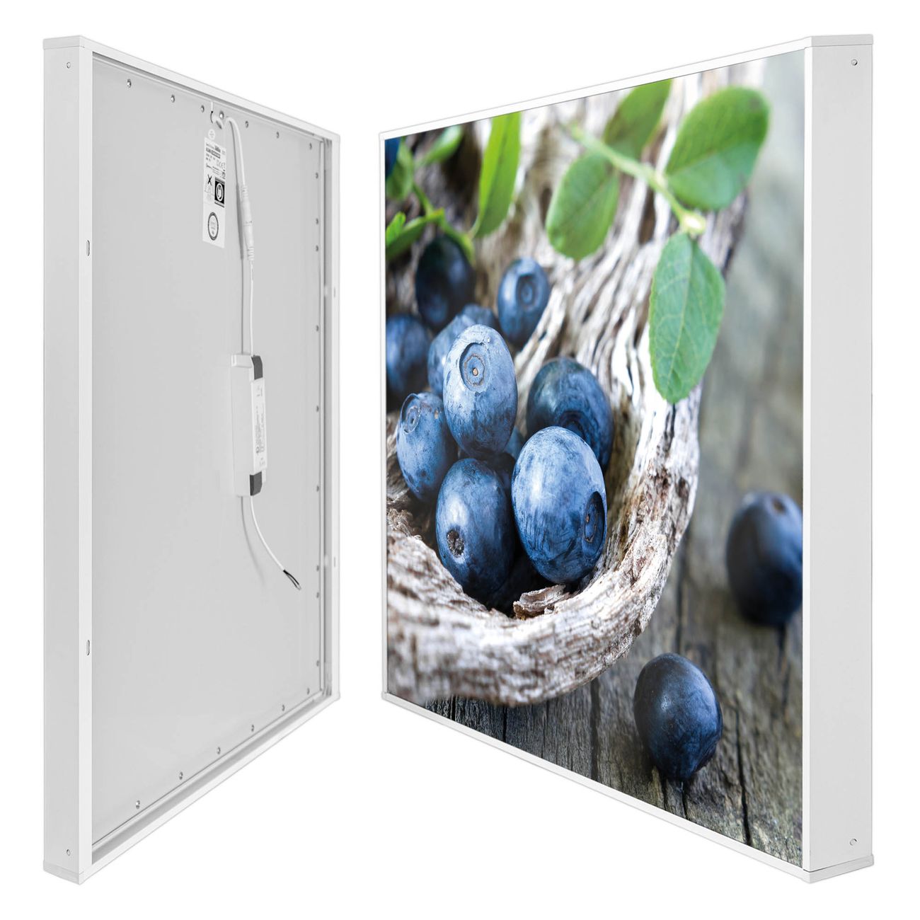 banjado LED Wandleuchte Sie erhalten hier eine stimmungsvolle Lichtquelle bestehend aus dem Set: Smart LED Panel mit Trafo, Motivscheibe (Motiv: Blaubeeren) und Rahmen. Der Aufbau ist denkbar einfach, Sie erhalten eine detaillierte Aufbauanleitung. Die komplette Leuchte kann sowohl an der Wand angeschlossen werden als auch als Deckenleuchte. Die Gesamtgröße der Lampe ist 62,5 x 62,5 x 4,5cm (HxBxT). Das Set besteht aus: LED Panel mit Trafo, Rahmen und Motivbild zum Selbstaufbau.