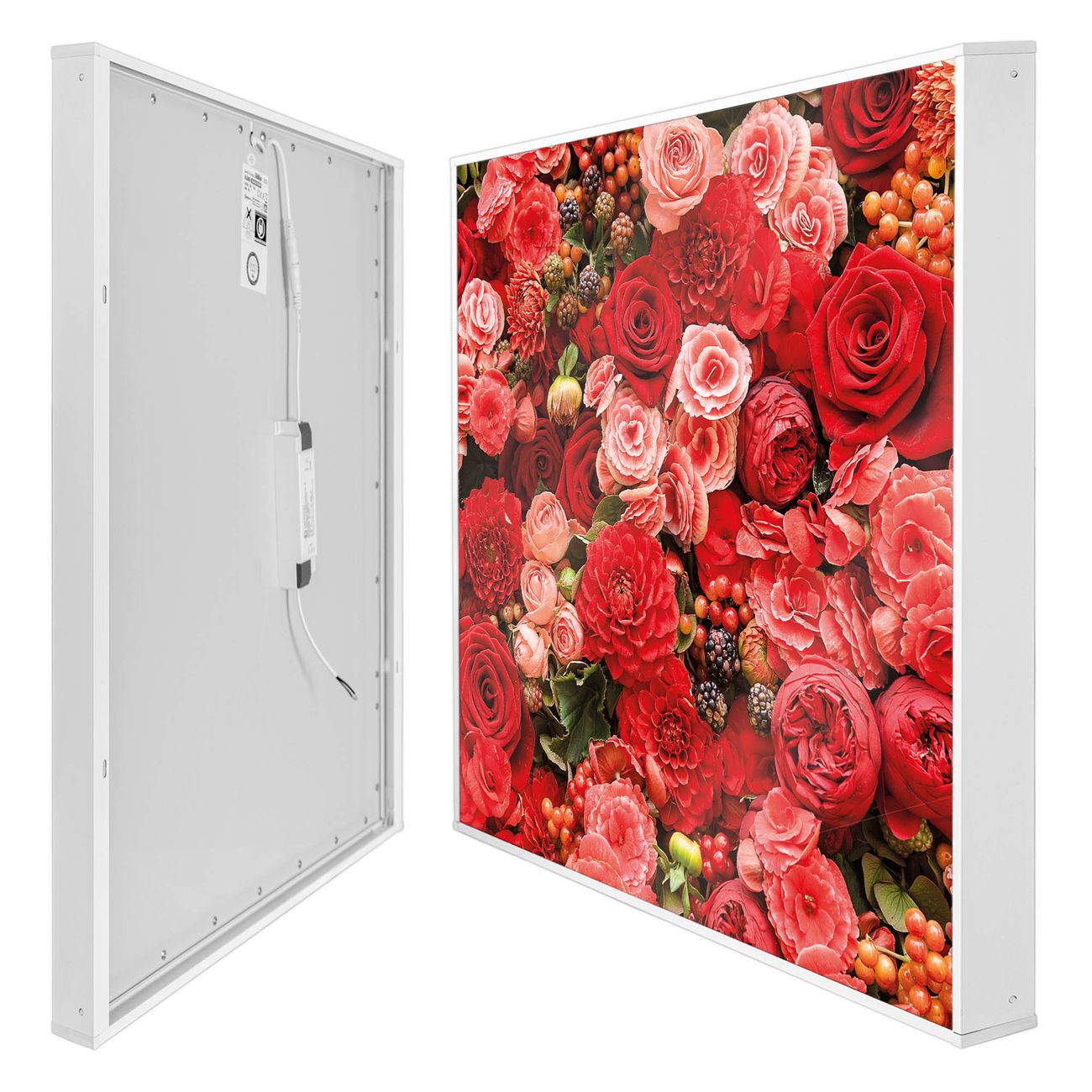 banjado LED Wandleuchte Sie erhalten hier eine stimmungsvolle Lichtquelle bestehend aus dem Set: Smart LED Panel mit Trafo, Motivscheibe (Motiv: Bouquet in Rot) und Rahmen. Der Aufbau ist denkbar einfach, Sie erhalten eine detaillierte Aufbauanleitung. Die komplette Leuchte kann sowohl an der Wand angeschlossen werden als auch als Deckenleuchte. Die Gesamtgröße der Lampe ist 62,5 x 62,5 x 4,5cm (HxBxT). Das Set besteht aus: LED Panel mit Trafo, Rahmen und Motivbild zum Selbstaufbau.