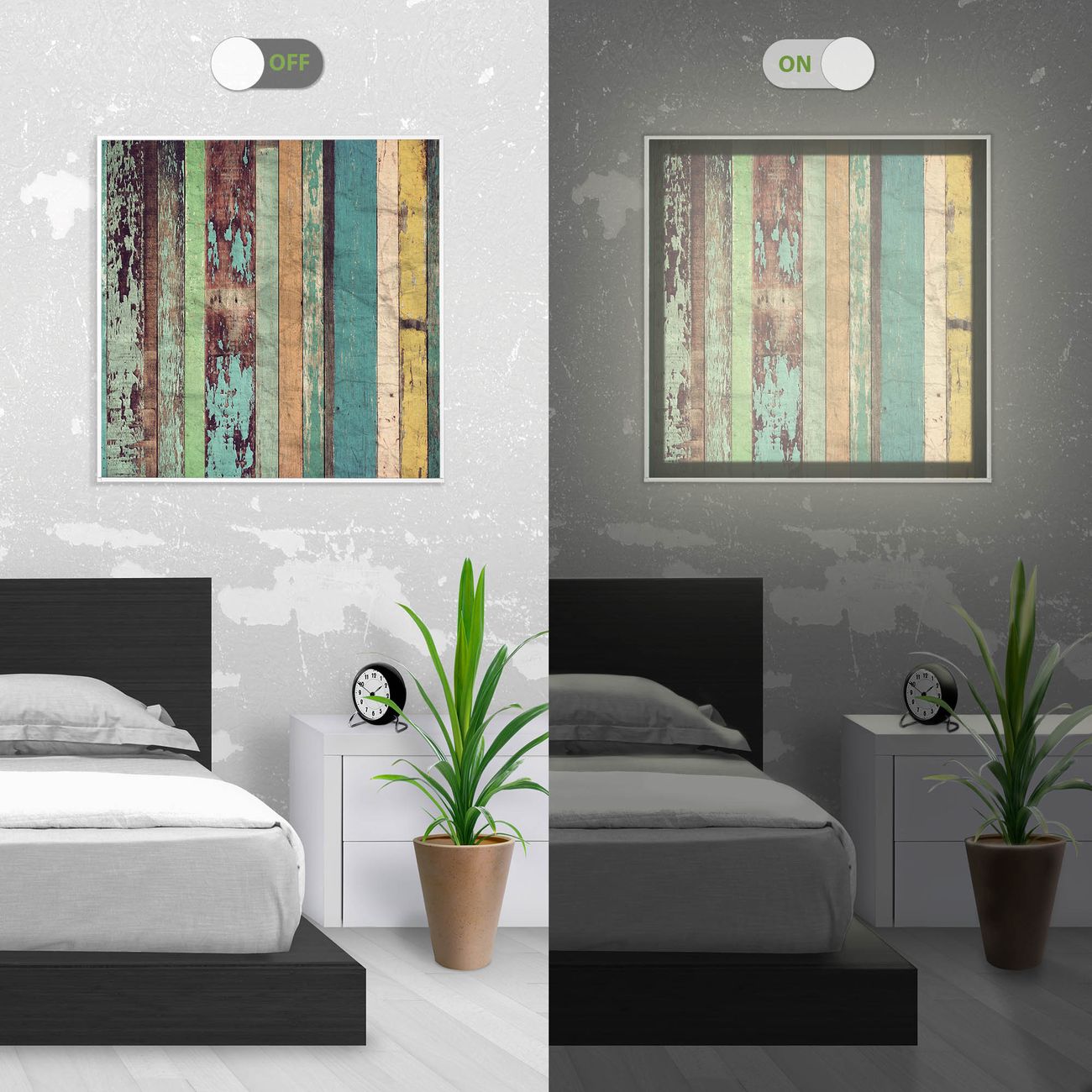 Mit der banjado smarten LED Wandleuchte mit Motiv Bunte Bretterwand schaffen Sie in Ihren Räumen eine besondere Atmosphäre. Abends spendet die Wandlampe Licht und tagsüber haben Sie ein stimmungsvolles Wandbild. Die Leuchte besteht aus einem zeitlosen weißen Rahmen, in den das smarte WLAN LED Paneel sowie das Bild eingefasst wird. Die Montage ist denkbar einfach, Sie erhalten eine detaillierte Aufbauanleitung sowie Montagematerial. Eine angenehme Lichtquelle erhöht nachweislich das Wohlbefinden. Das Motiv der Leuchte lässt sich leicht wechseln, so können Sie Ihre Wohnräume individuell gestalten. Die Montage ist an der Wand oder an der Decke möglich.