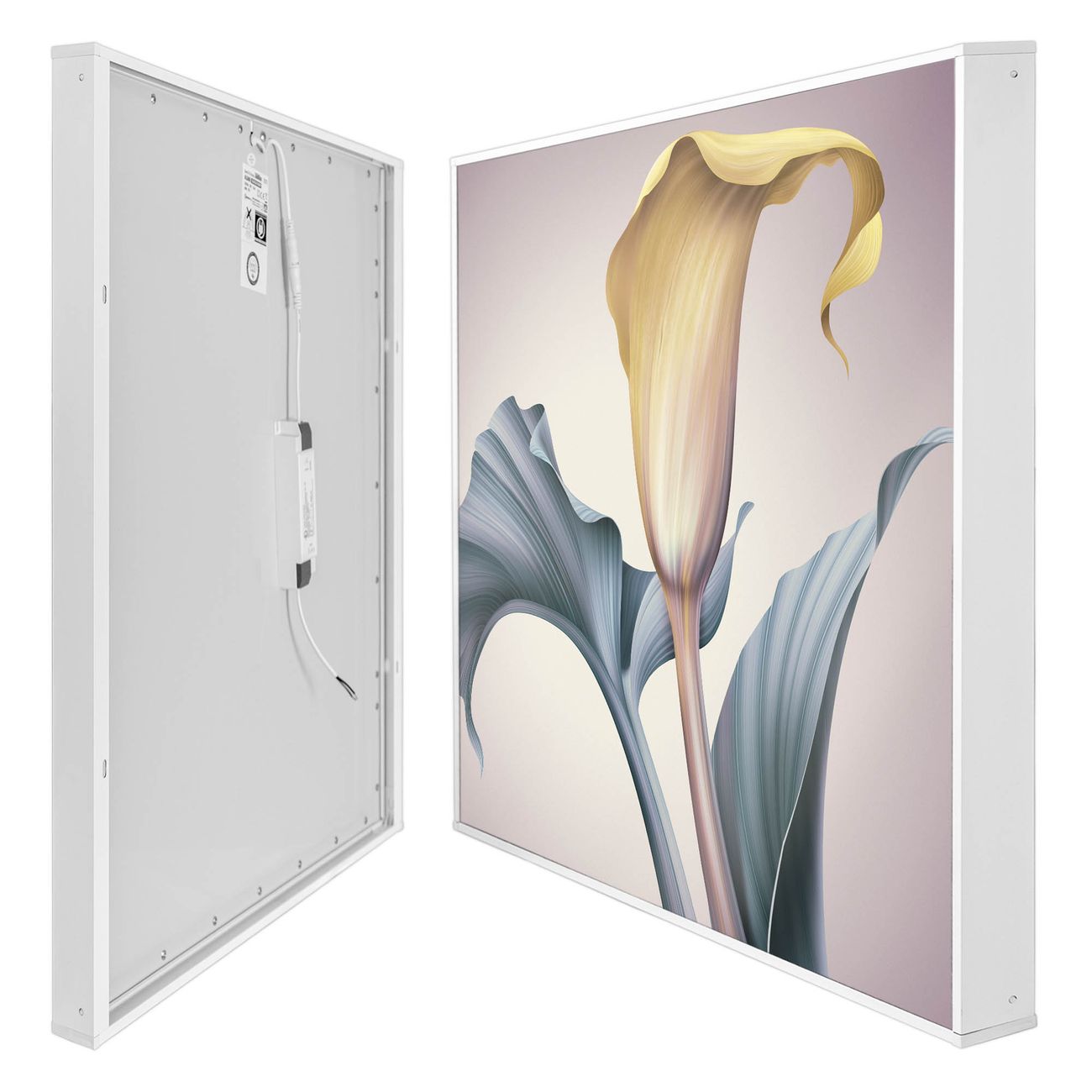 banjado LED Wandleuchte Sie erhalten hier eine stimmungsvolle Lichtquelle bestehend aus dem Set: Smart LED Panel mit Trafo, Motivscheibe (Motiv: Calla) und Rahmen. Der Aufbau ist denkbar einfach, Sie erhalten eine detaillierte Aufbauanleitung. Die komplette Leuchte kann sowohl an der Wand angeschlossen werden als auch als Deckenleuchte. Die Gesamtgröße der Lampe ist 62,5 x 62,5 x 4,5cm (HxBxT). Das Set besteht aus: LED Panel mit Trafo, Rahmen und Motivbild zum Selbstaufbau.