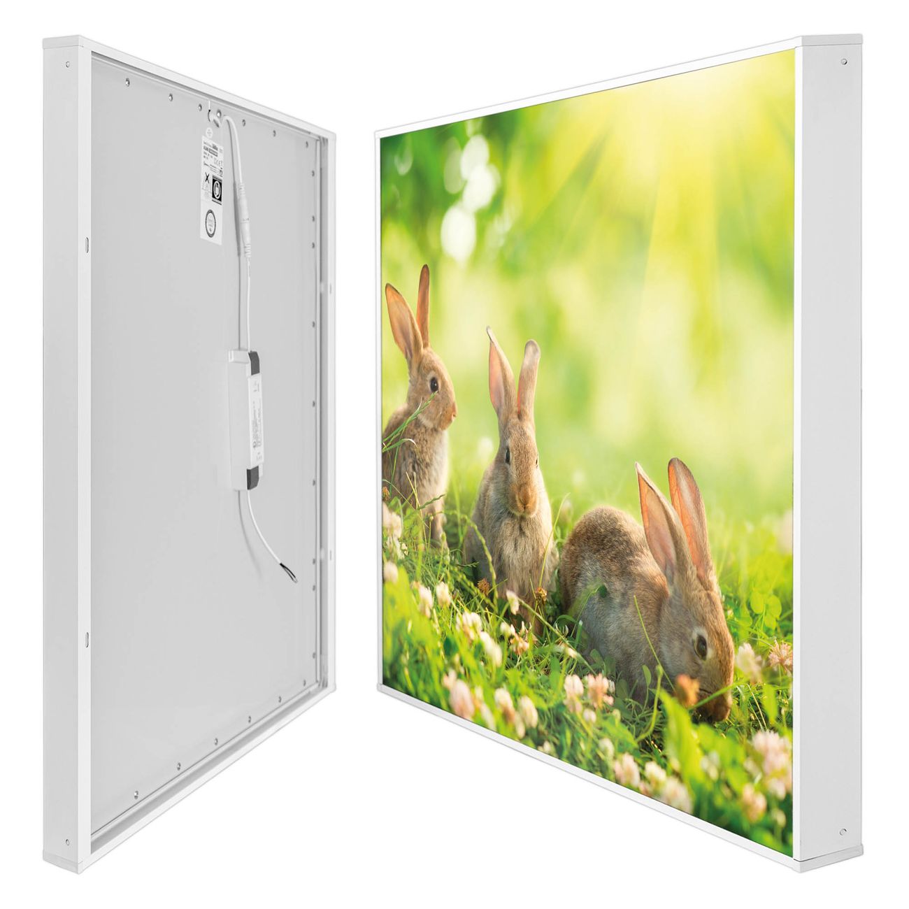 banjado LED Wandleuchte Sie erhalten hier eine stimmungsvolle Lichtquelle bestehend aus dem Set: Smart LED Panel mit Trafo, Motivscheibe (Motiv: Drei Hasen) und Rahmen. Der Aufbau ist denkbar einfach, Sie erhalten eine detaillierte Aufbauanleitung. Die komplette Leuchte kann sowohl an der Wand angeschlossen werden als auch als Deckenleuchte. Die Gesamtgröße der Lampe ist 62,5 x 62,5 x 4,5cm (HxBxT). Das Set besteht aus: LED Panel mit Trafo, Rahmen und Motivbild zum Selbstaufbau.