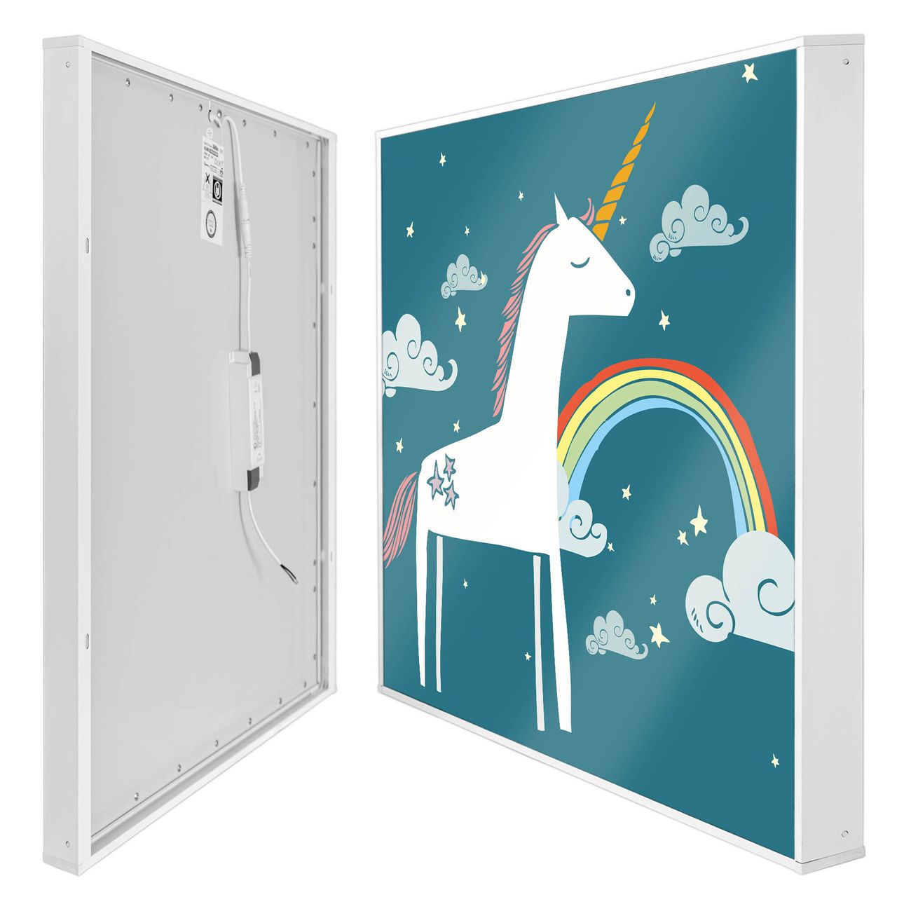 banjado LED Wandleuchte Sie erhalten hier eine stimmungsvolle Lichtquelle bestehend aus dem Set: Smart LED Panel mit Trafo, Motivscheibe (Motiv: Einhorn) und Rahmen. Der Aufbau ist denkbar einfach, Sie erhalten eine detaillierte Aufbauanleitung. Die komplette Leuchte kann sowohl an der Wand angeschlossen werden als auch als Deckenleuchte. Die Gesamtgröße der Lampe ist 62,5 x 62,5 x 4,5cm (HxBxT). Das Set besteht aus: LED Panel mit Trafo, Rahmen und Motivbild zum Selbstaufbau.