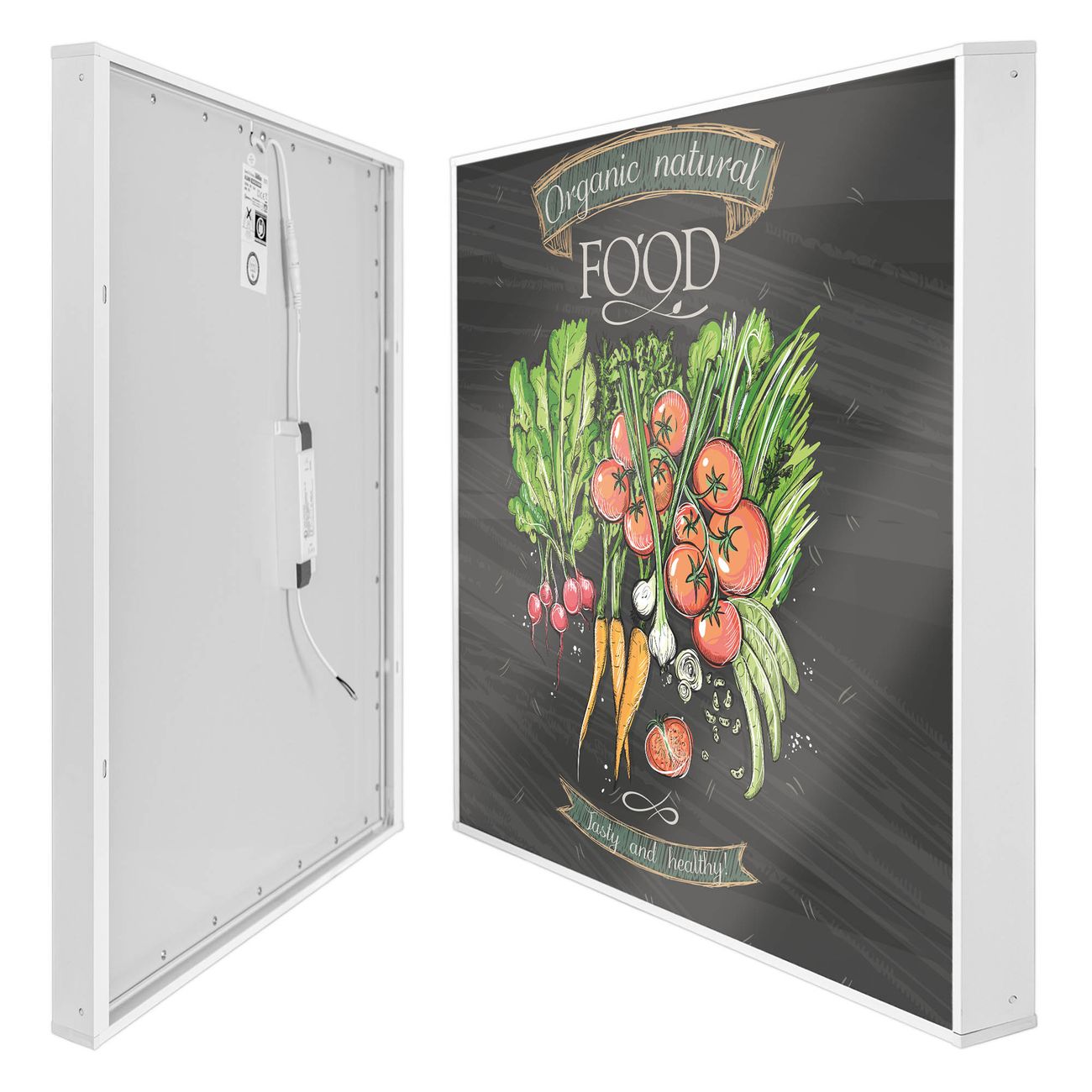 banjado LED Wandleuchte Sie erhalten hier eine stimmungsvolle Lichtquelle bestehend aus dem Set: Smart LED Panel mit Trafo, Motivscheibe (Motiv: Gesund Und Lecker) und Rahmen. Der Aufbau ist denkbar einfach, Sie erhalten eine detaillierte Aufbauanleitung. Die komplette Leuchte kann sowohl an der Wand angeschlossen werden als auch als Deckenleuchte. Die Gesamtgröße der Lampe ist 62,5 x 62,5 x 4,5cm (HxBxT). Das Set besteht aus: LED Panel mit Trafo, Rahmen und Motivbild zum Selbstaufbau.