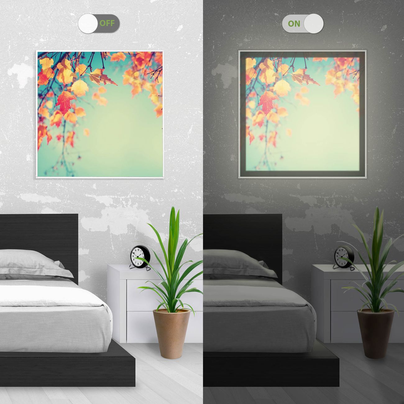Im eingeschalteten Zustand wirft das Bild einen Schatten wie in der ersten Ansicht zu sehen.