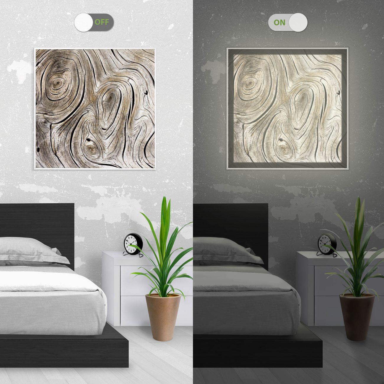 Im eingeschalteten Zustand wirft das Bild einen Schatten wie in der ersten Ansicht zu sehen.