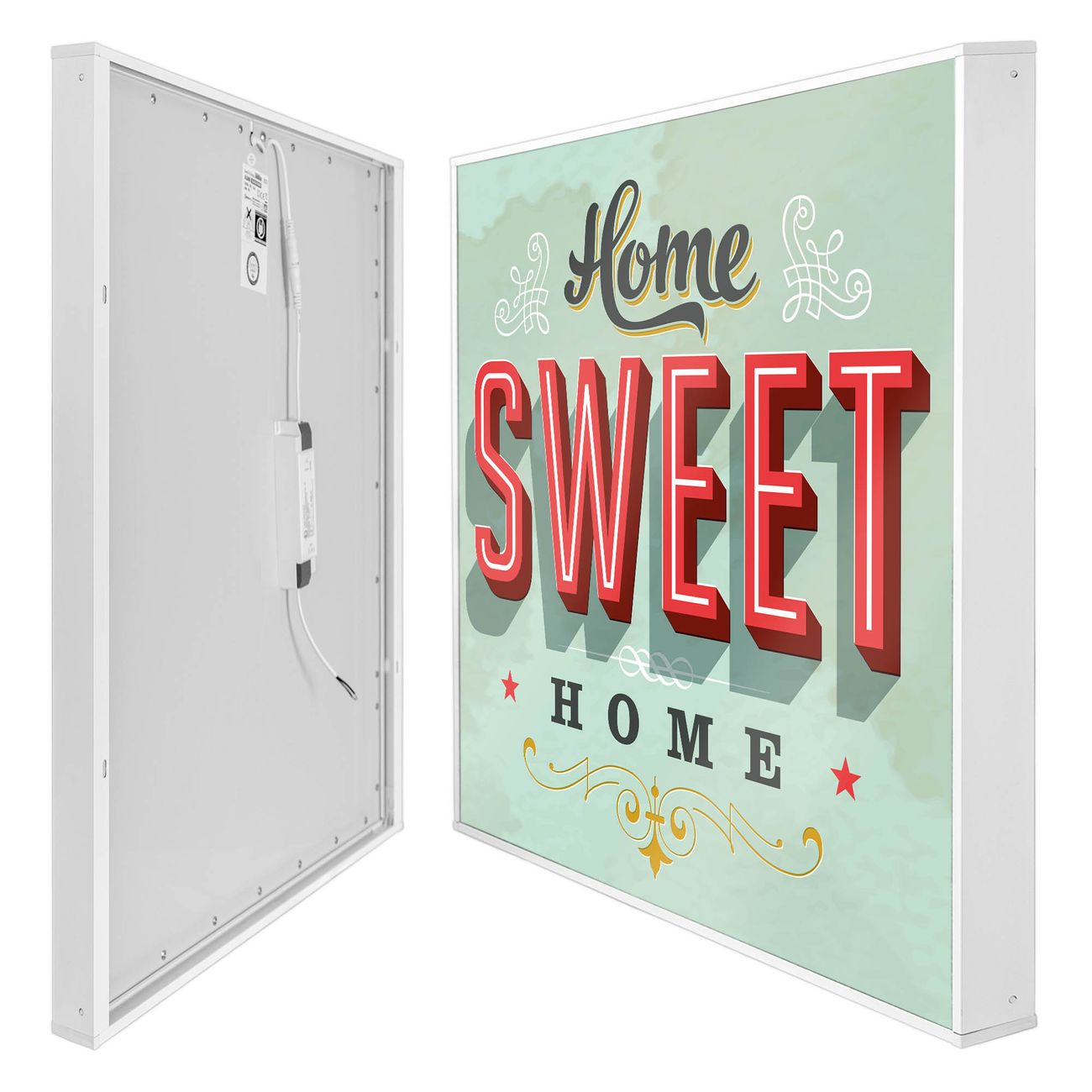 banjado LED Wandleuchte Sie erhalten hier eine stimmungsvolle Lichtquelle bestehend aus dem Set: Smart LED Panel mit Trafo, Motivscheibe (Motiv: Home Sweet Home) und Rahmen. Der Aufbau ist denkbar einfach, Sie erhalten eine detaillierte Aufbauanleitung. Die komplette Leuchte kann sowohl an der Wand angeschlossen werden als auch als Deckenleuchte. Die Gesamtgröße der Lampe ist 62,5 x 62,5 x 4,5cm (HxBxT). Das Set besteht aus: LED Panel mit Trafo, Rahmen und Motivbild zum Selbstaufbau.