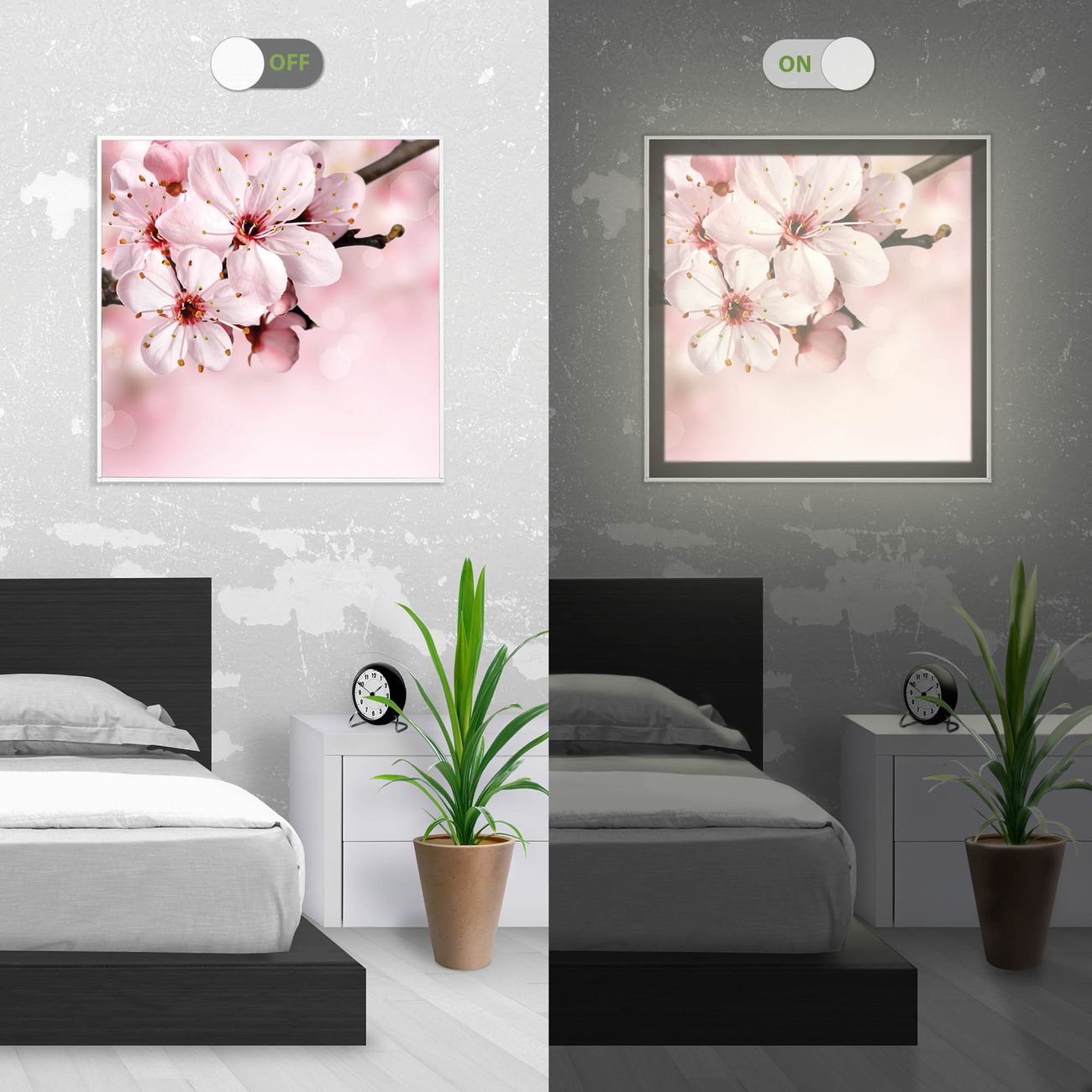 Mit der banjado smarten LED Wandleuchte mit Motiv Japanische Kirsche schaffen Sie in Ihren Räumen eine besondere Atmosphäre. Abends spendet die Wandlampe Licht und tagsüber haben Sie ein stimmungsvolles Wandbild. Die Leuchte besteht aus einem zeitlosen weißen Rahmen, in den das smarte WLAN LED Paneel sowie das Bild eingefasst wird. Die Montage ist denkbar einfach, Sie erhalten eine detaillierte Aufbauanleitung sowie Montagematerial. Eine angenehme Lichtquelle erhöht nachweislich das Wohlbefinden. Das Motiv der Leuchte lässt sich leicht wechseln, so können Sie Ihre Wohnräume individuell gestalten. Die Montage ist an der Wand oder an der Decke möglich.