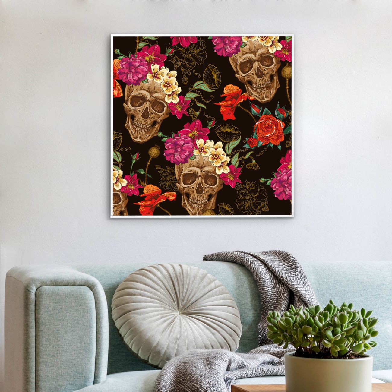 Mit der banjado smarten LED Wandleuchte mit Motiv Los Dias de Muertos schaffen Sie in Ihren Räumen eine besondere Atmosphäre. Abends spendet die Wandlampe Licht und tagsüber haben Sie ein stimmungsvolles Wandbild. Die Leuchte besteht aus einem zeitlosen weißen Rahmen, in den das smarte WLAN LED Paneel sowie das Bild eingefasst wird. Die Montage ist denkbar einfach, Sie erhalten eine detaillierte Aufbauanleitung sowie Montagematerial. Eine angenehme Lichtquelle erhöht nachweislich das Wohlbefinden. Das Motiv der Leuchte lässt sich leicht wechseln, so können Sie Ihre Wohnräume individuell gestalten. Die Montage ist an der Wand oder an der Decke möglich.