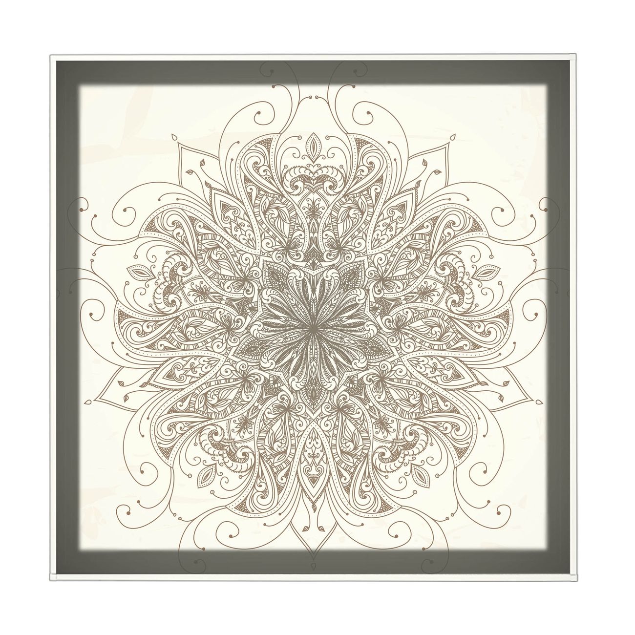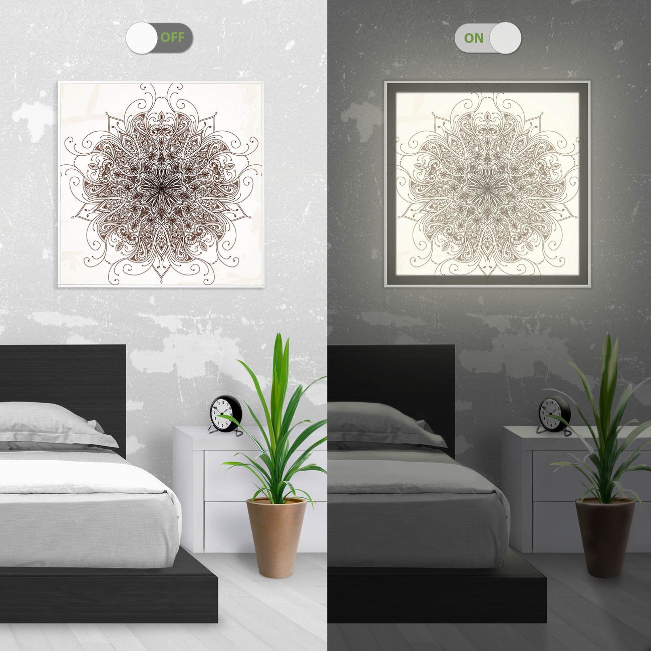 banjado LED Wandleuchte Sie erhalten hier eine stimmungsvolle Lichtquelle bestehend aus dem Set: Smart LED Panel mit Trafo, Motivscheibe (Motiv: Mehendi) und Rahmen. Der Aufbau ist denkbar einfach, Sie erhalten eine detaillierte Aufbauanleitung. Die komplette Leuchte kann sowohl an der Wand angeschlossen werden als auch als Deckenleuchte. Die Gesamtgröße der Lampe ist 62,5 x 62,5 x 4,5cm (HxBxT). Das Set besteht aus: LED Panel mit Trafo, Rahmen und Motivbild zum Selbstaufbau.