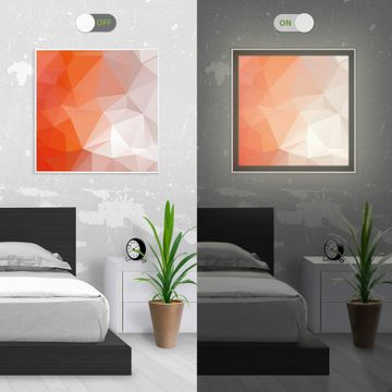 Mit der banjado smarten LED Wandleuchte mit Motiv Orange Polygon schaffen Sie in Ihren Räumen eine besondere Atmosphäre. Abends spendet die Wandlampe Licht und tagsüber haben Sie ein stimmungsvolles Wandbild. Die Leuchte besteht aus einem zeitlosen weißen Rahmen, in den das smarte WLAN LED Paneel sowie das Bild eingefasst wird. Die Montage ist denkbar einfach, Sie erhalten eine detaillierte Aufbauanleitung sowie Montagematerial. Eine angenehme Lichtquelle erhöht nachweislich das Wohlbefinden. Das Motiv der Leuchte lässt sich leicht wechseln, so können Sie Ihre Wohnräume individuell gestalten. Die Montage ist an der Wand oder an der Decke möglich.