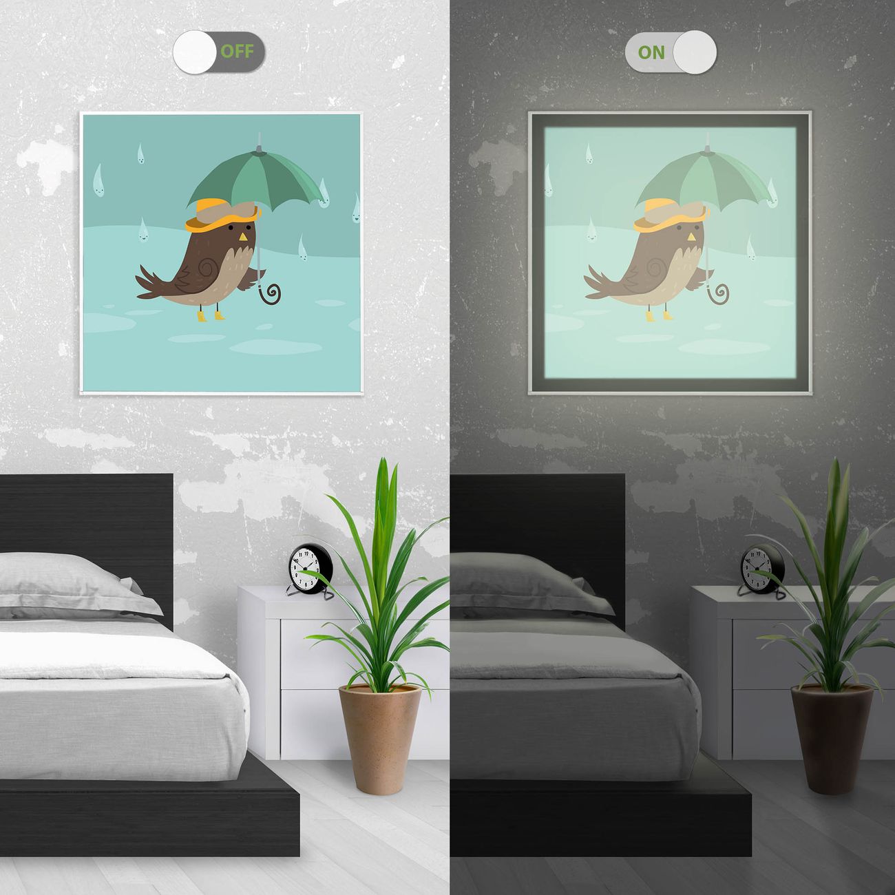 Im eingeschalteten Zustand wirft das Bild einen Schatten wie in der ersten Ansicht zu sehen.