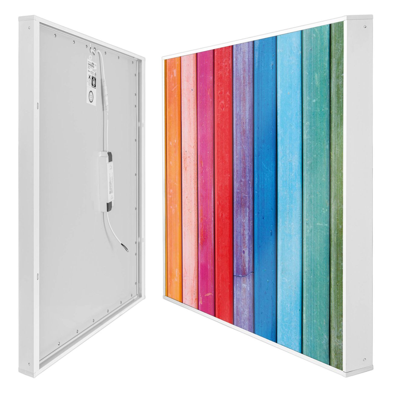 banjado LED Wandleuchte Sie erhalten hier eine stimmungsvolle Lichtquelle bestehend aus dem Set: Smart LED Panel mit Trafo, Motivscheibe (Motiv: Regenbogenfarben) und Rahmen. Der Aufbau ist denkbar einfach, Sie erhalten eine detaillierte Aufbauanleitung. Die komplette Leuchte kann sowohl an der Wand angeschlossen werden als auch als Deckenleuchte. Die Gesamtgröße der Lampe ist 62,5 x 62,5 x 4,5cm (HxBxT). Das Set besteht aus: LED Panel mit Trafo, Rahmen und Motivbild zum Selbstaufbau.