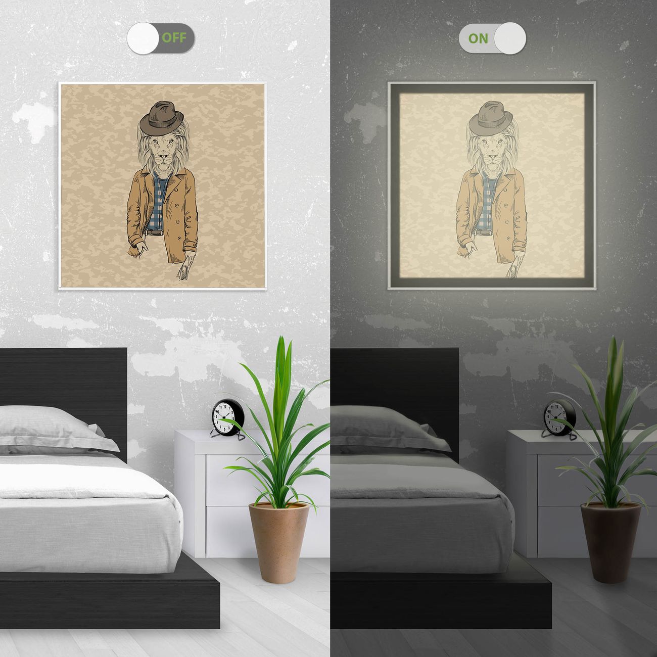 Im eingeschalteten Zustand wirft das Bild einen Schatten wie in der ersten Ansicht zu sehen.
