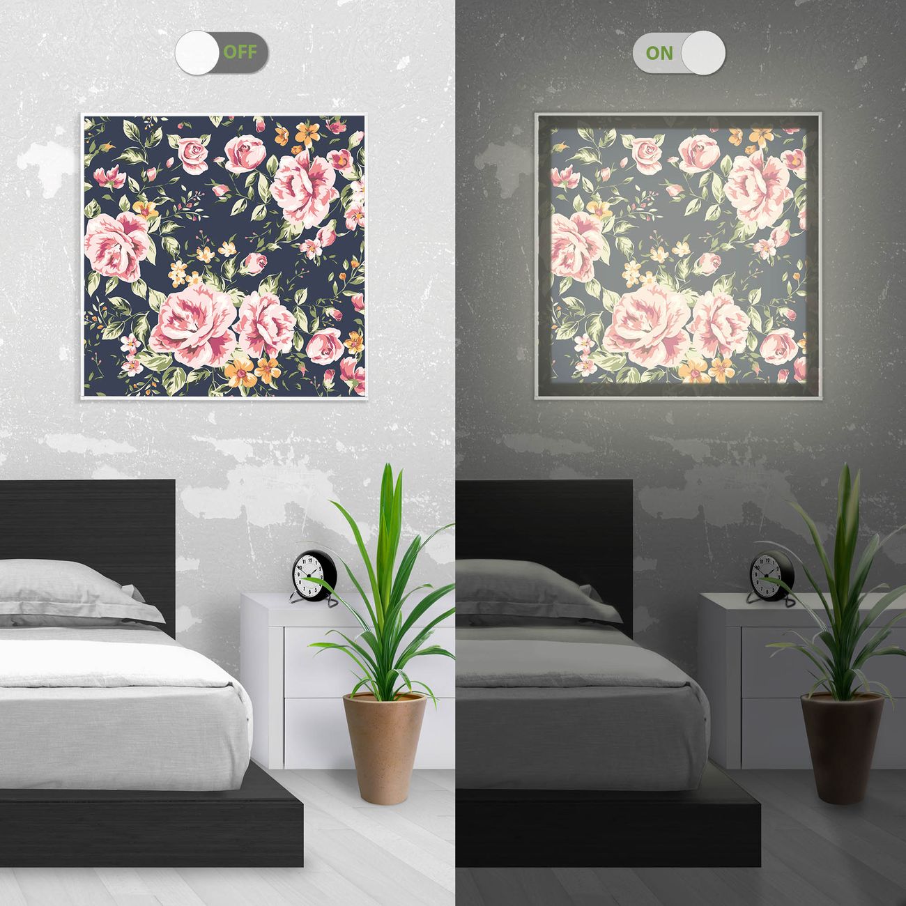 Mit der banjado smarten LED Wandleuchte mit Motiv Rosen Auf Anthrazit schaffen Sie in Ihren Räumen eine besondere Atmosphäre. Abends spendet die Wandlampe Licht und tagsüber haben Sie ein stimmungsvolles Wandbild. Die Leuchte besteht aus einem zeitlosen weißen Rahmen, in den das smarte WLAN LED Paneel sowie das Bild eingefasst wird. Die Montage ist denkbar einfach, Sie erhalten eine detaillierte Aufbauanleitung sowie Montagematerial. Eine angenehme Lichtquelle erhöht nachweislich das Wohlbefinden. Das Motiv der Leuchte lässt sich leicht wechseln, so können Sie Ihre Wohnräume individuell gestalten. Die Montage ist an der Wand oder an der Decke möglich.