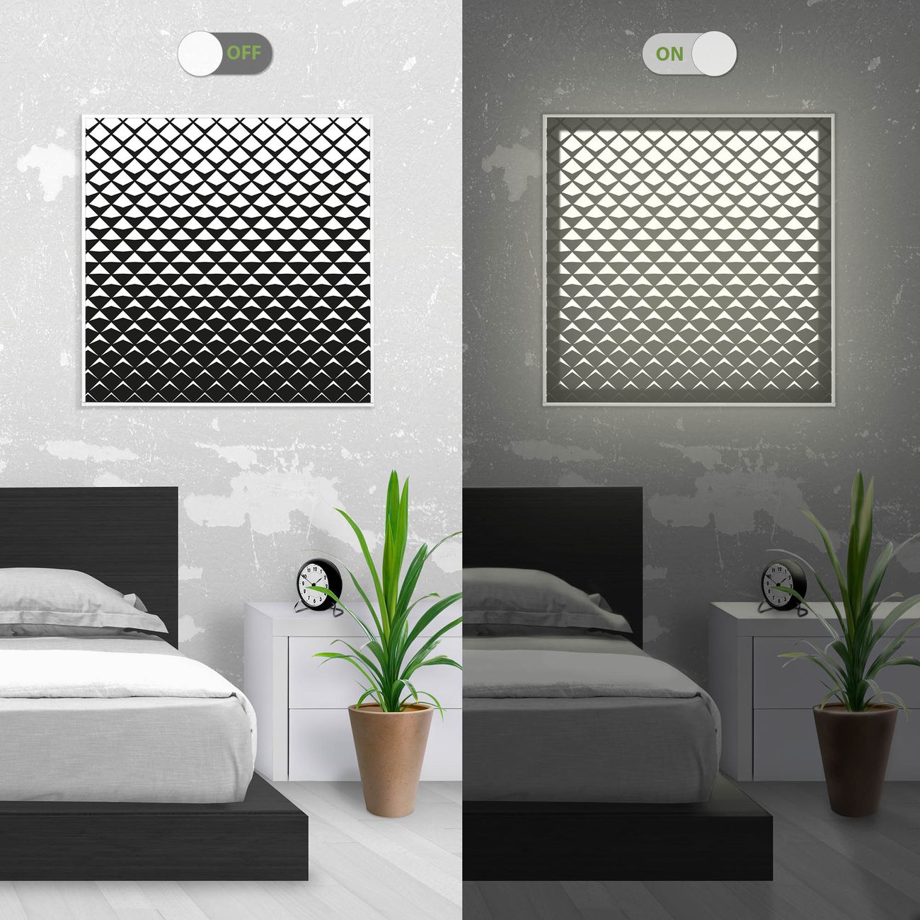 Im eingeschalteten Zustand wirft das Bild einen Schatten wie in der ersten Ansicht zu sehen.