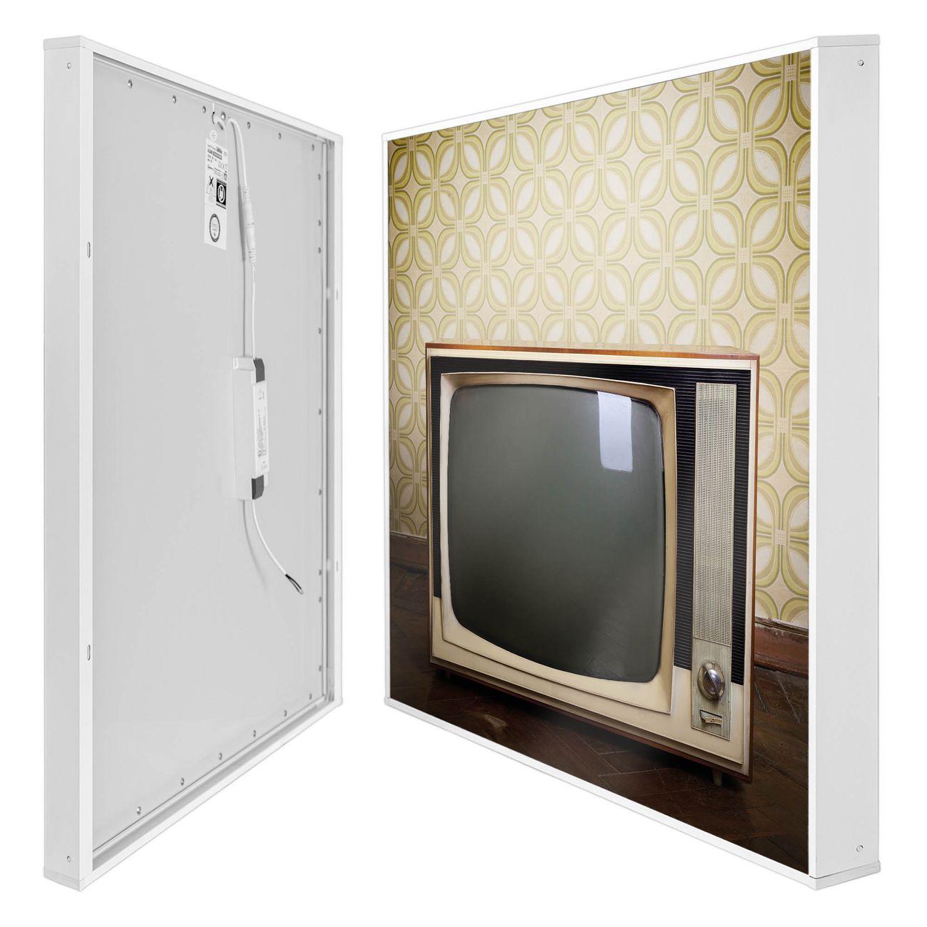 Mit der banjado smarten LED Wandleuchte mit Motiv Schwarzweiß TV schaffen Sie in Ihren Räumen eine besondere Atmosphäre. Abends spendet die Wandlampe Licht und tagsüber haben Sie ein stimmungsvolles Wandbild. Die Leuchte besteht aus einem zeitlosen weißen Rahmen, in den das smarte WLAN LED Paneel sowie das Bild eingefasst wird. Die Montage ist denkbar einfach, Sie erhalten eine detaillierte Aufbauanleitung sowie Montagematerial. Eine angenehme Lichtquelle erhöht nachweislich das Wohlbefinden. Das Motiv der Leuchte lässt sich leicht wechseln, so können Sie Ihre Wohnräume individuell gestalten. Die Montage ist an der Wand oder an der Decke möglich.