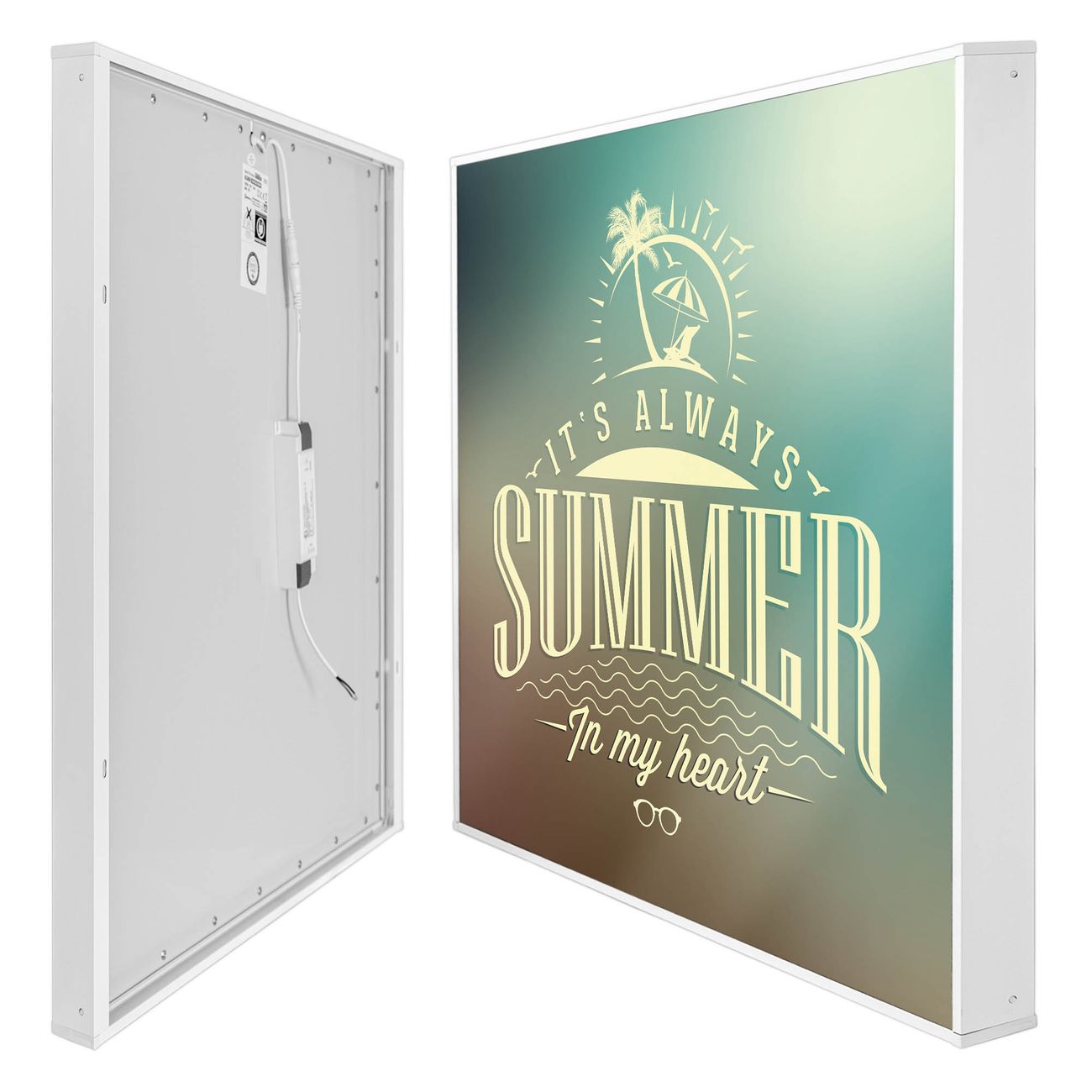 banjado LED Wandleuchte Sie erhalten hier eine stimmungsvolle Lichtquelle bestehend aus dem Set: Smart LED Panel mit Trafo, Motivscheibe (Motiv: Sommer Heart) und Rahmen. Der Aufbau ist denkbar einfach, Sie erhalten eine detaillierte Aufbauanleitung. Die komplette Leuchte kann sowohl an der Wand angeschlossen werden als auch als Deckenleuchte. Die Gesamtgröße der Lampe ist 62,5 x 62,5 x 4,5cm (HxBxT). Das Set besteht aus: LED Panel mit Trafo, Rahmen und Motivbild zum Selbstaufbau.